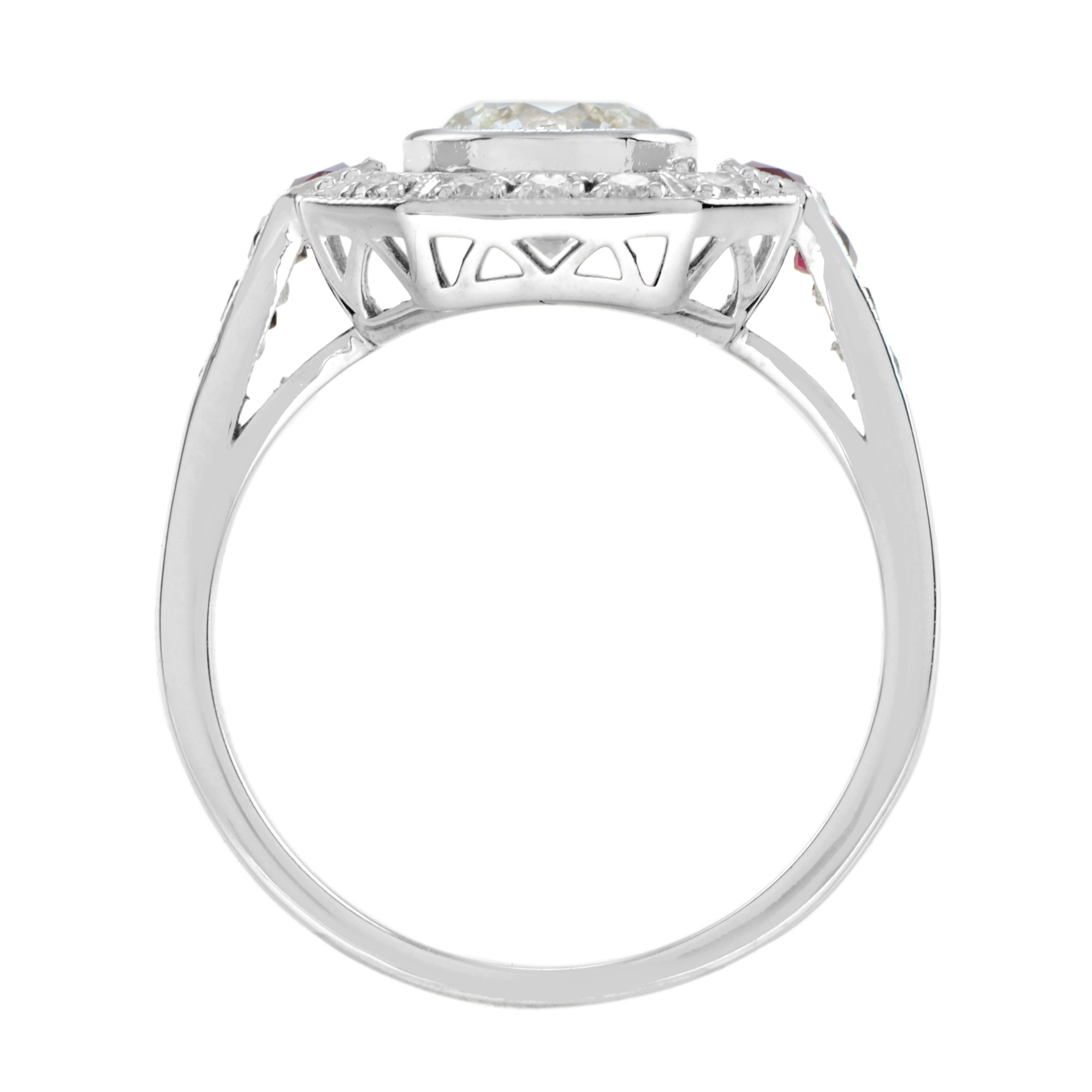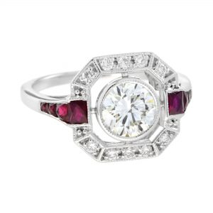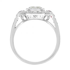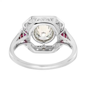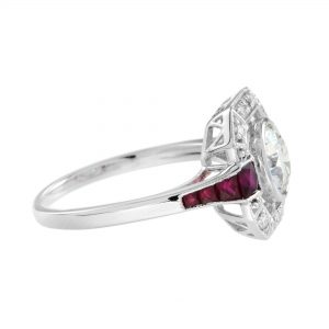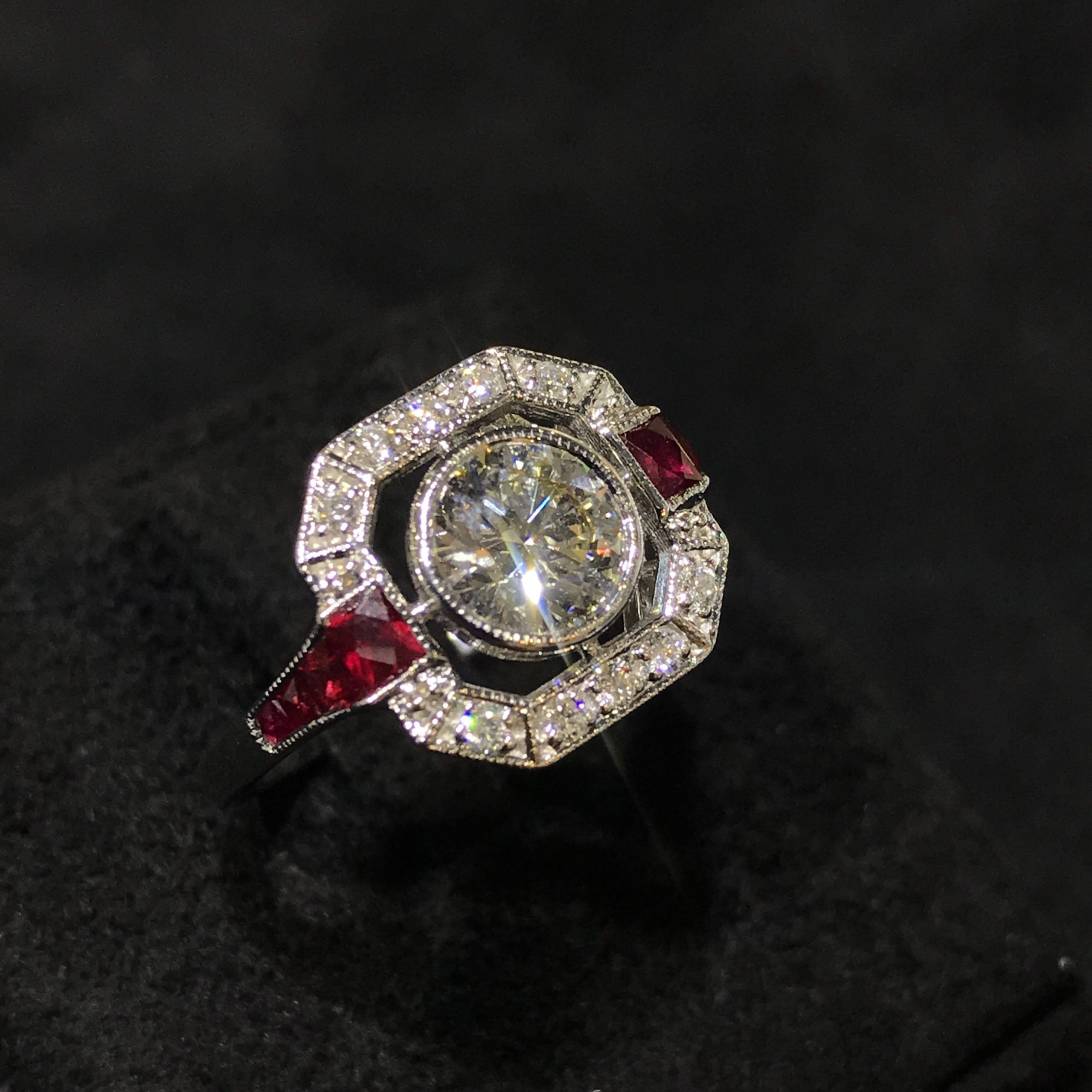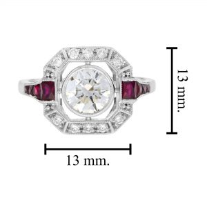 A gorgeous eye catching center stone with the perfect touch of diamonds and rubies. The center diamond is M/VVS with the size of 6.5 mm. The shoulders feature French cut rubies. The ring is unique and will be one you will be pound to wear.