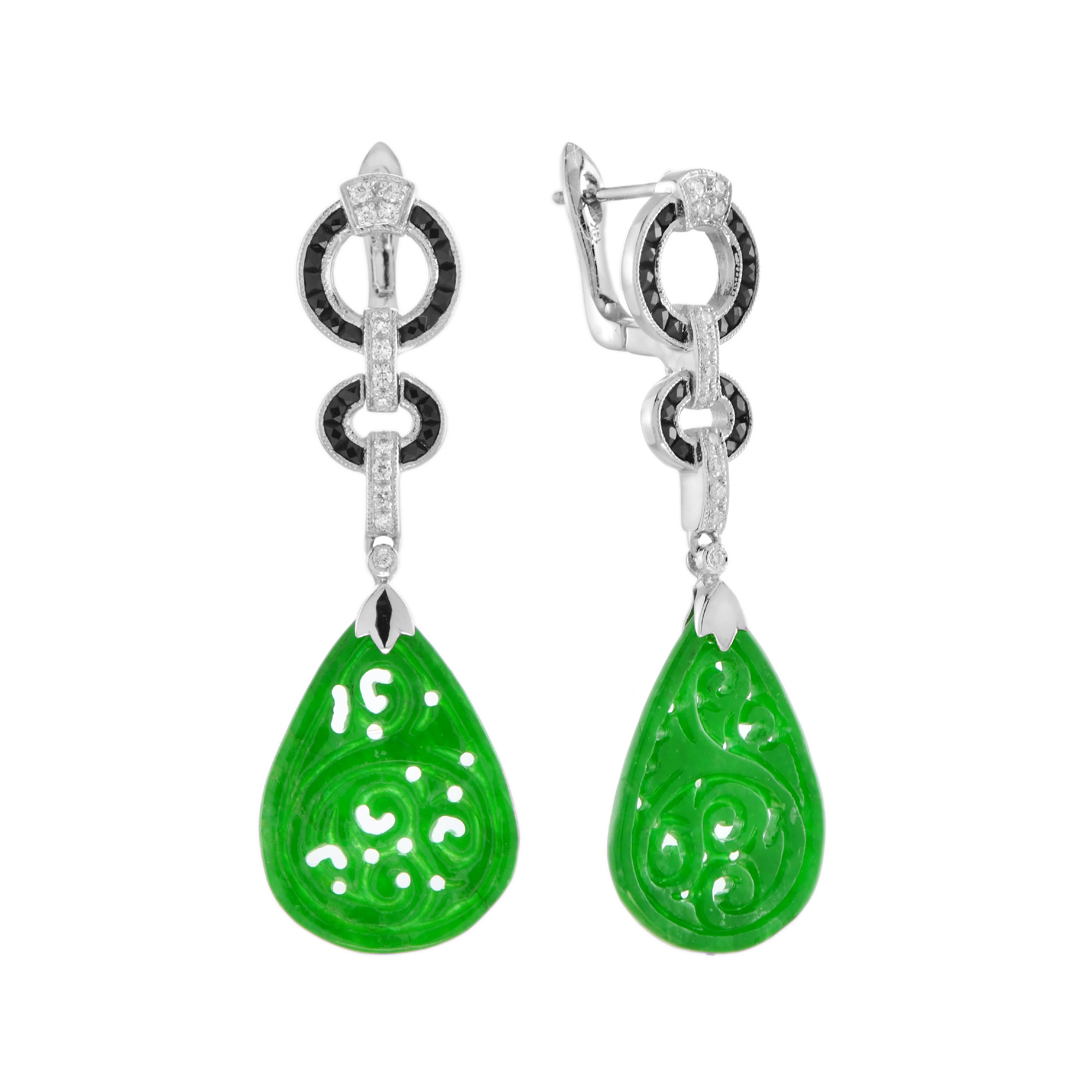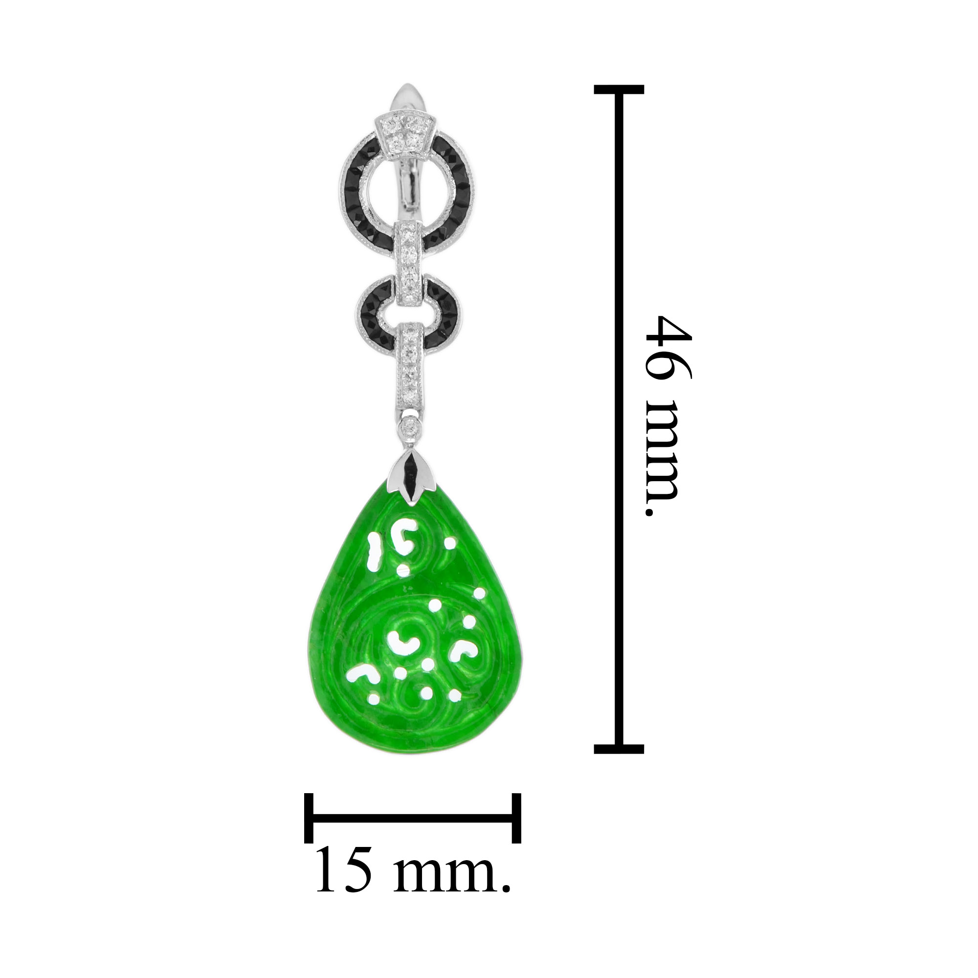 This is a lovely pair of vintage style jade with diamond and onyx dangle earrings crafted in 14k yellow gold. Each earrings are adorned with diamond and onyx set in geometric shape on their top part and setting with a hand carved natural jade drop. This is a fine piece of antique jewelry and would be perfect for any occasion.