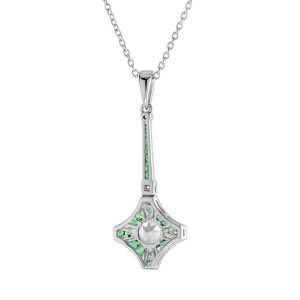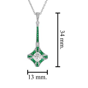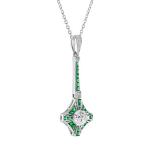 A classic beauty of yesteryear. This Art Deco inspired pendant features a 0.5 carat diamond, surrounded by French cut emerald and diamonds on the its top part. The pendant is set in gold with exquisite milgrain detail.