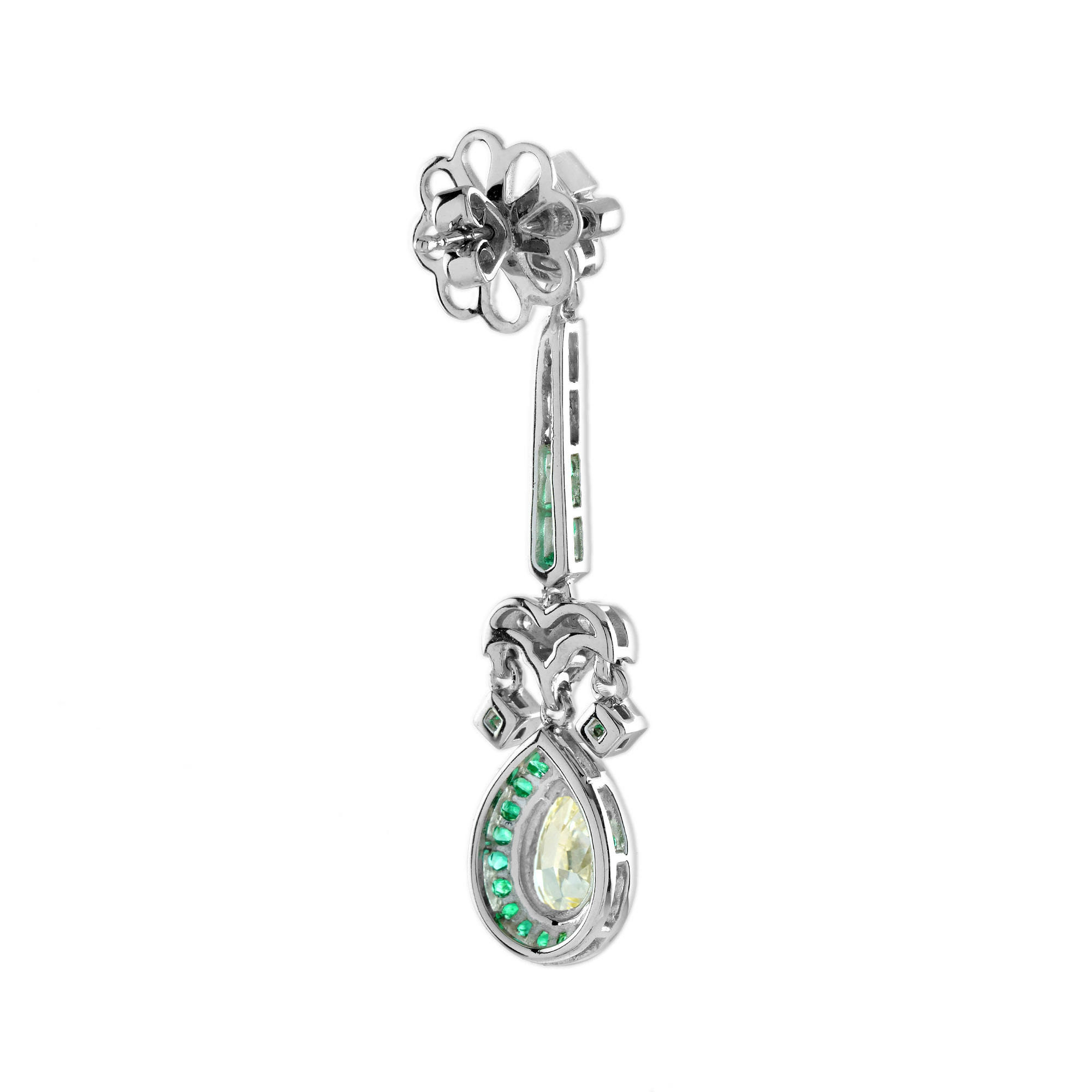 Inspired by the iconic Art Deco era, these fabulous earrings were designed for a true wow factor. Featuring total 2.25 carats weight of pear shape yellow diamonds surrounded by French cut emeralds. Create your stunning look with these lovely earrings.