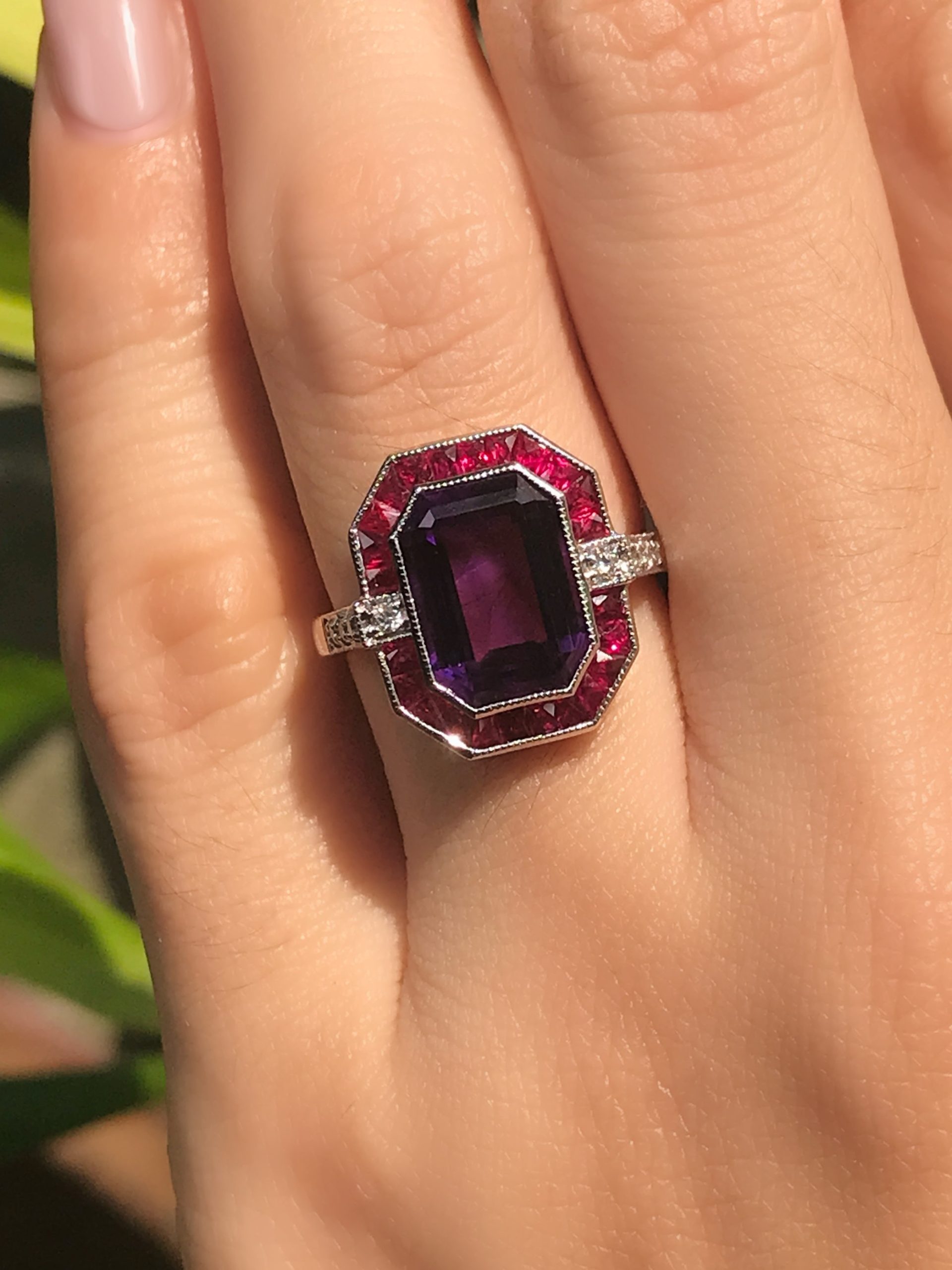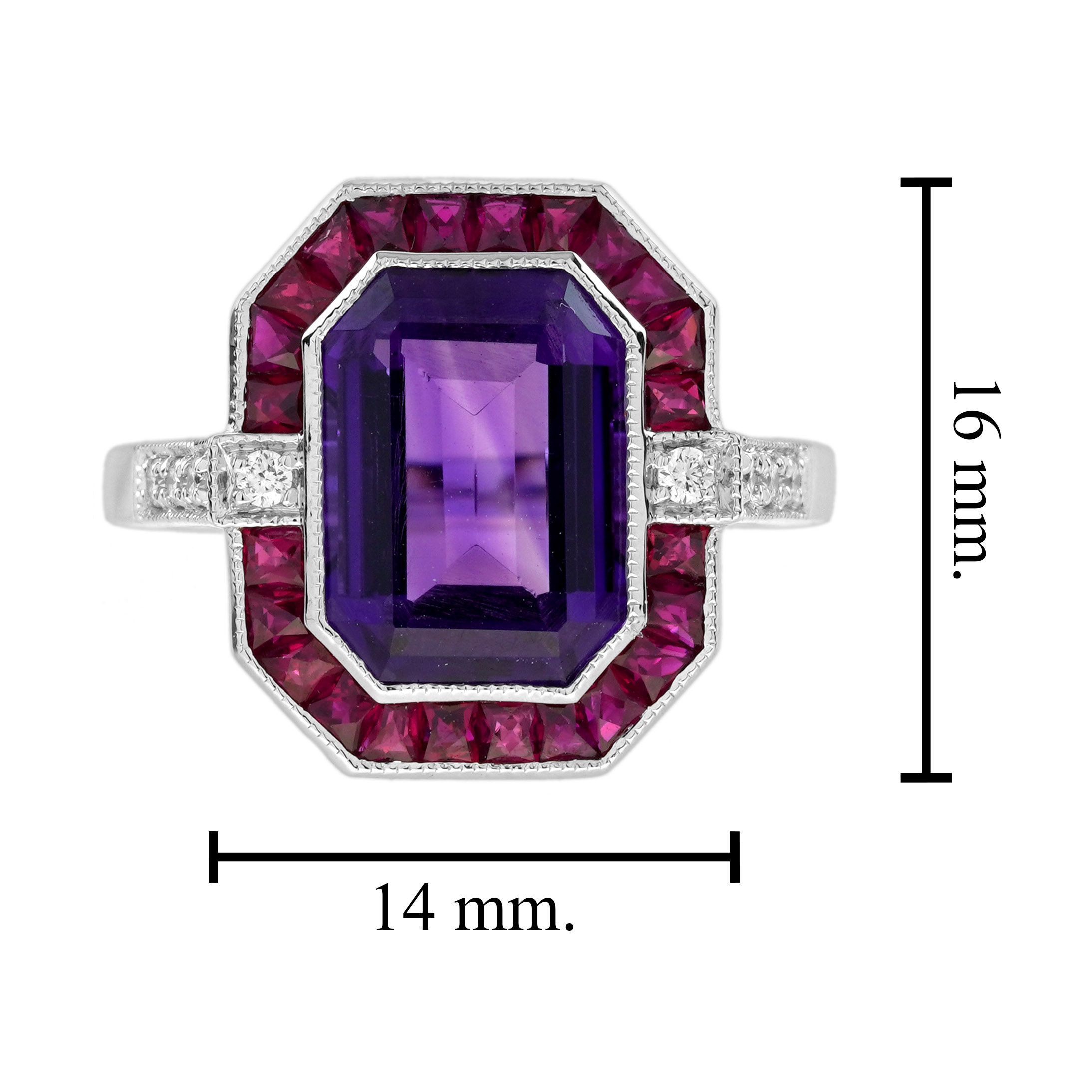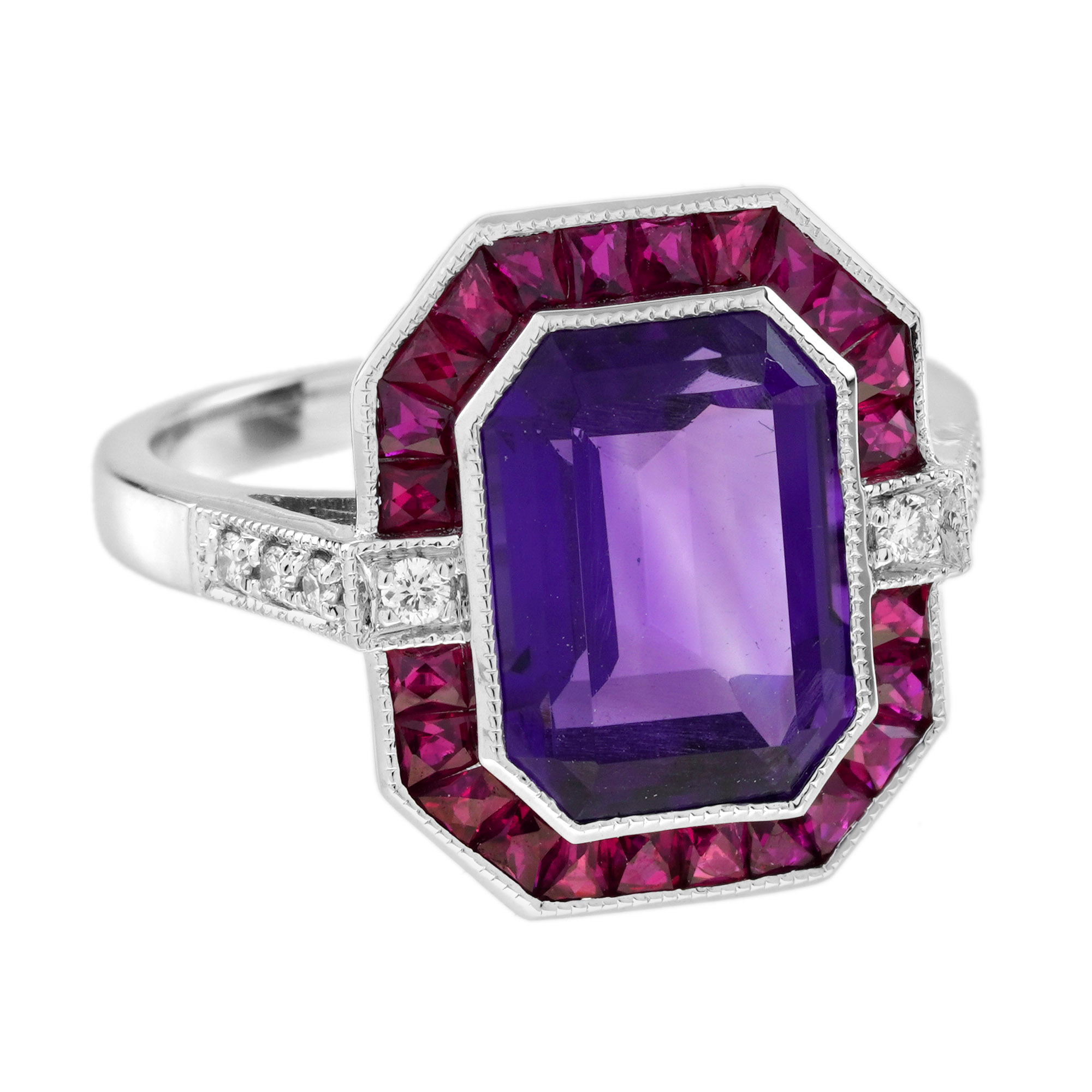 A striking and intriguing jewel, indeed. This bold and colorful Art Deco style ring highlights a gorgeous gleaming emerald cut amethyst framed in eye-catching contrast by French cut rubies. Each side and shoulders set off with round diamond with milgrain edge.