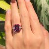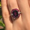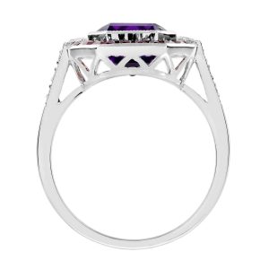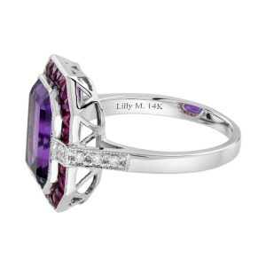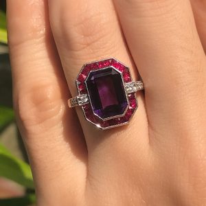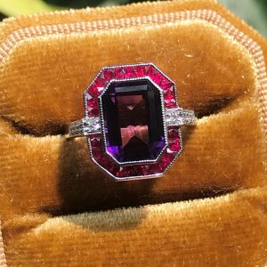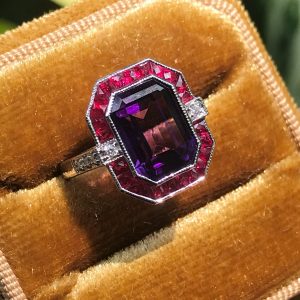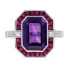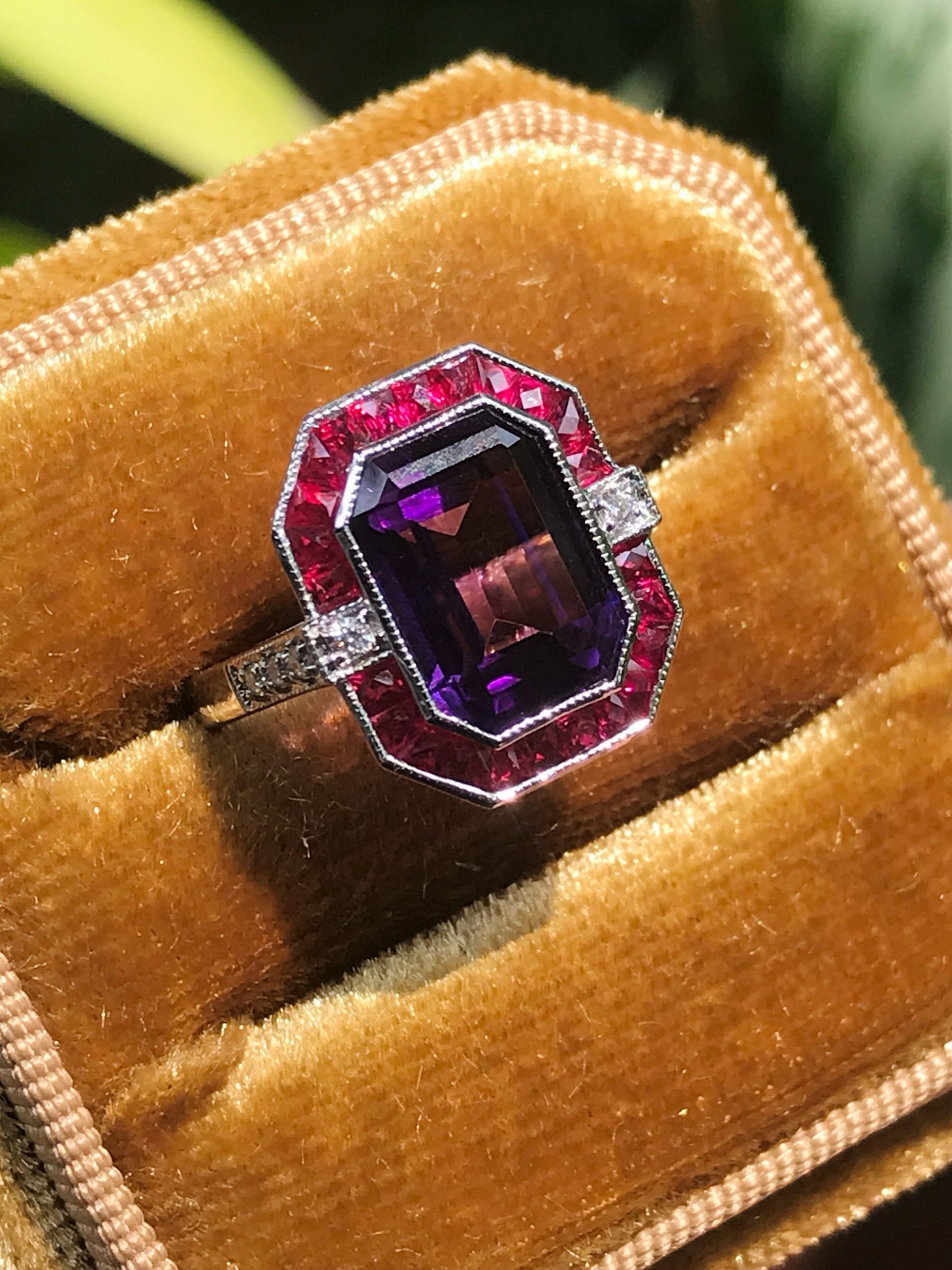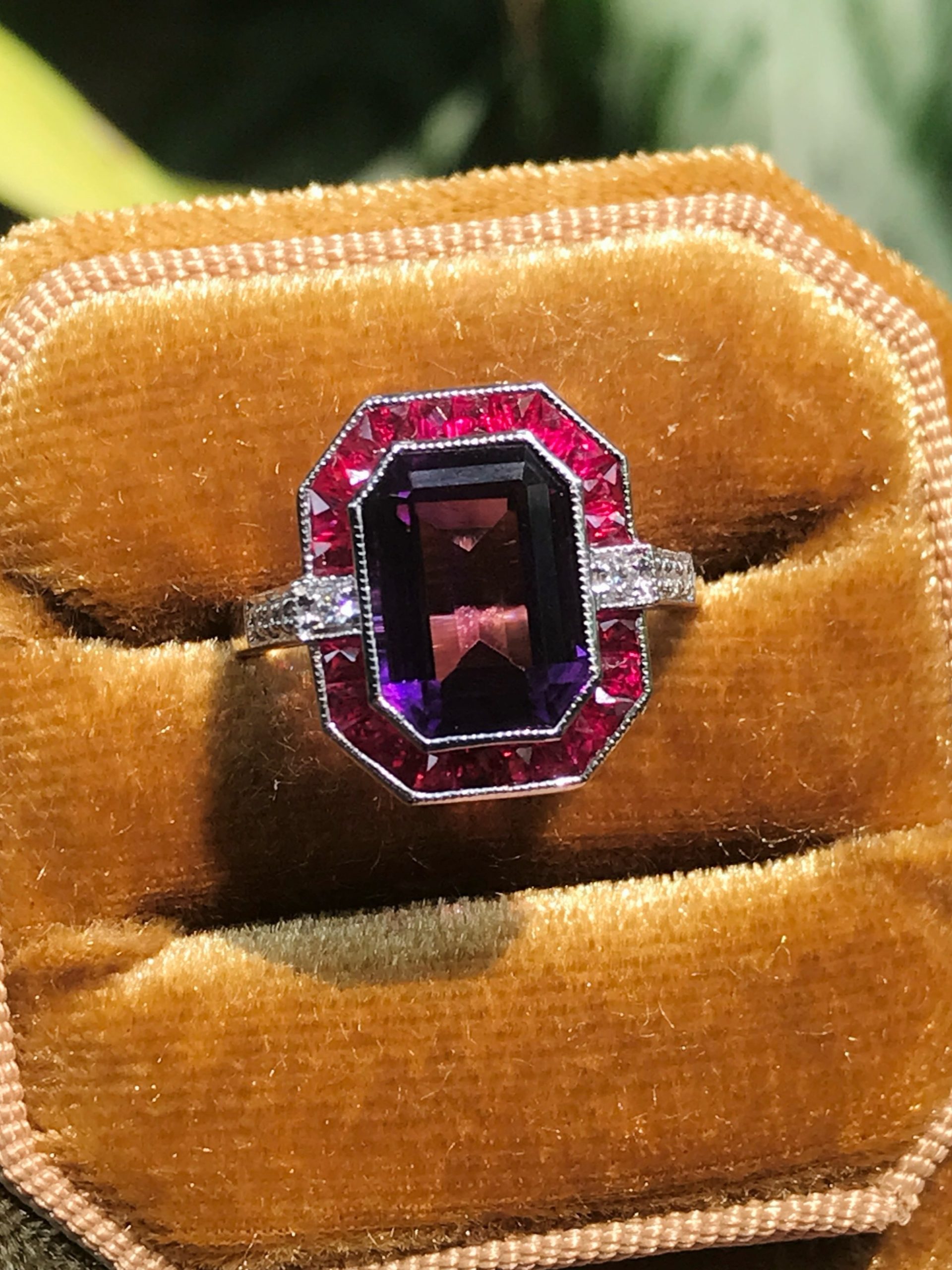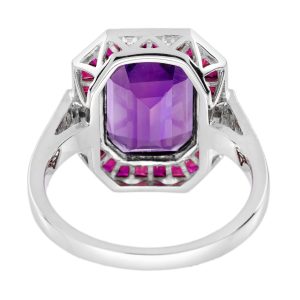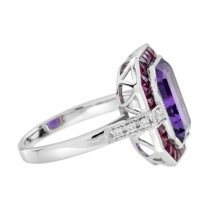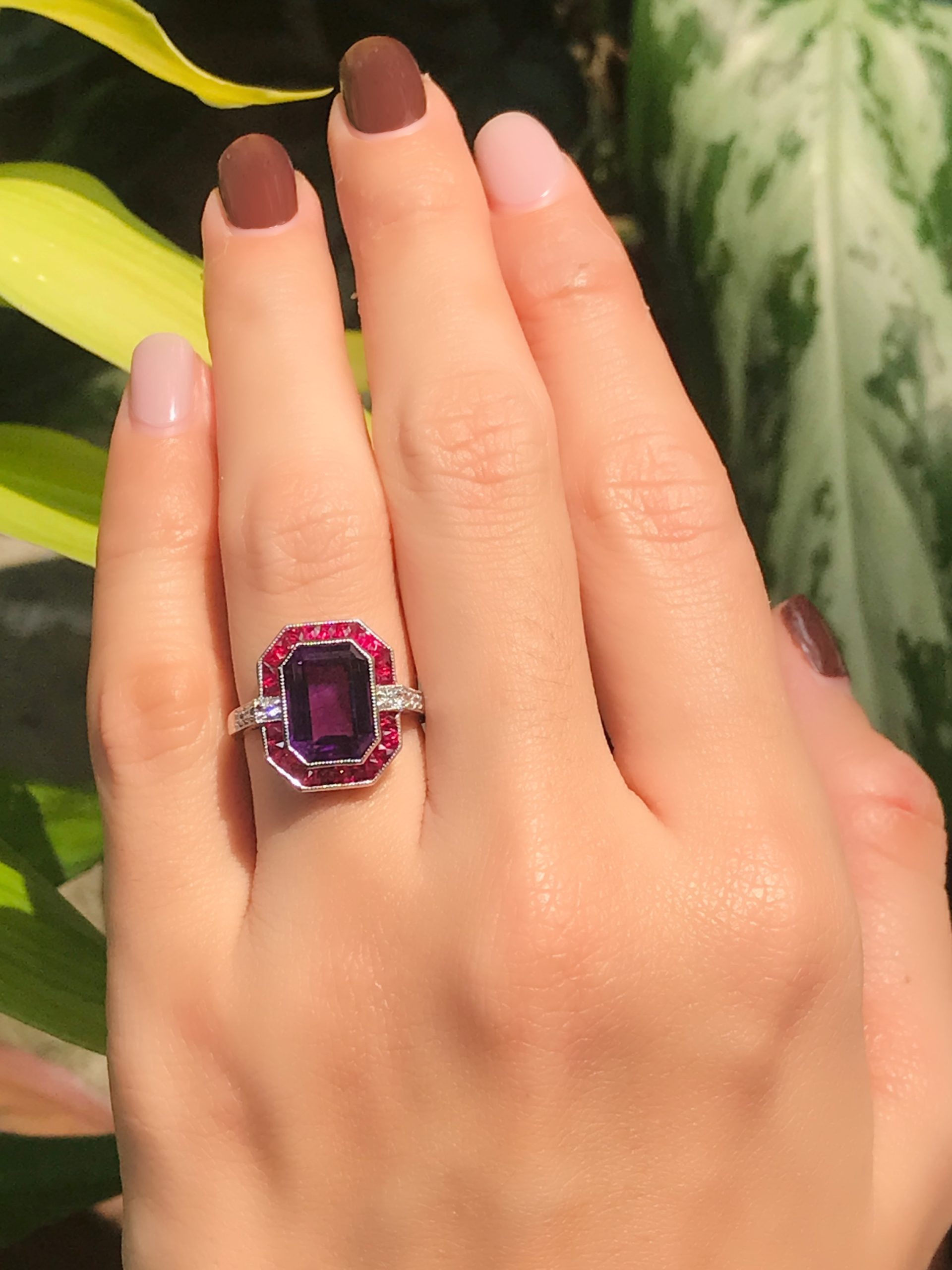 A striking and intriguing jewel, indeed. This bold and colorful Art Deco style ring highlights a gorgeous gleaming emerald cut amethyst framed in eye-catching contrast by French cut rubies. Each side and shoulders set off with round diamond with milgrain edge.