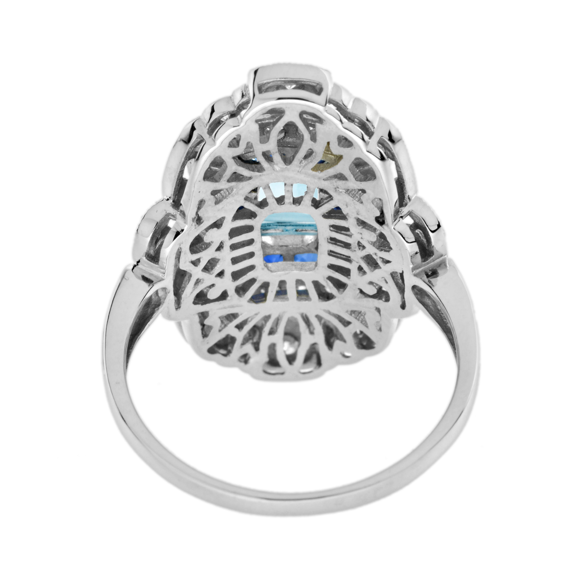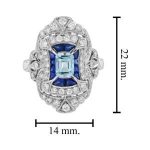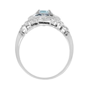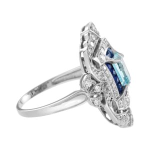 This is a beautifully designed Art Deco ring. The ring is elegantly geometric with both curved elements and lines. The ring features central emerald cut aquamarine surrounded by French cut blue sapphires and diamonds set pierced setting. The milgrain beading throughout the ring really adds to the vintage feel.