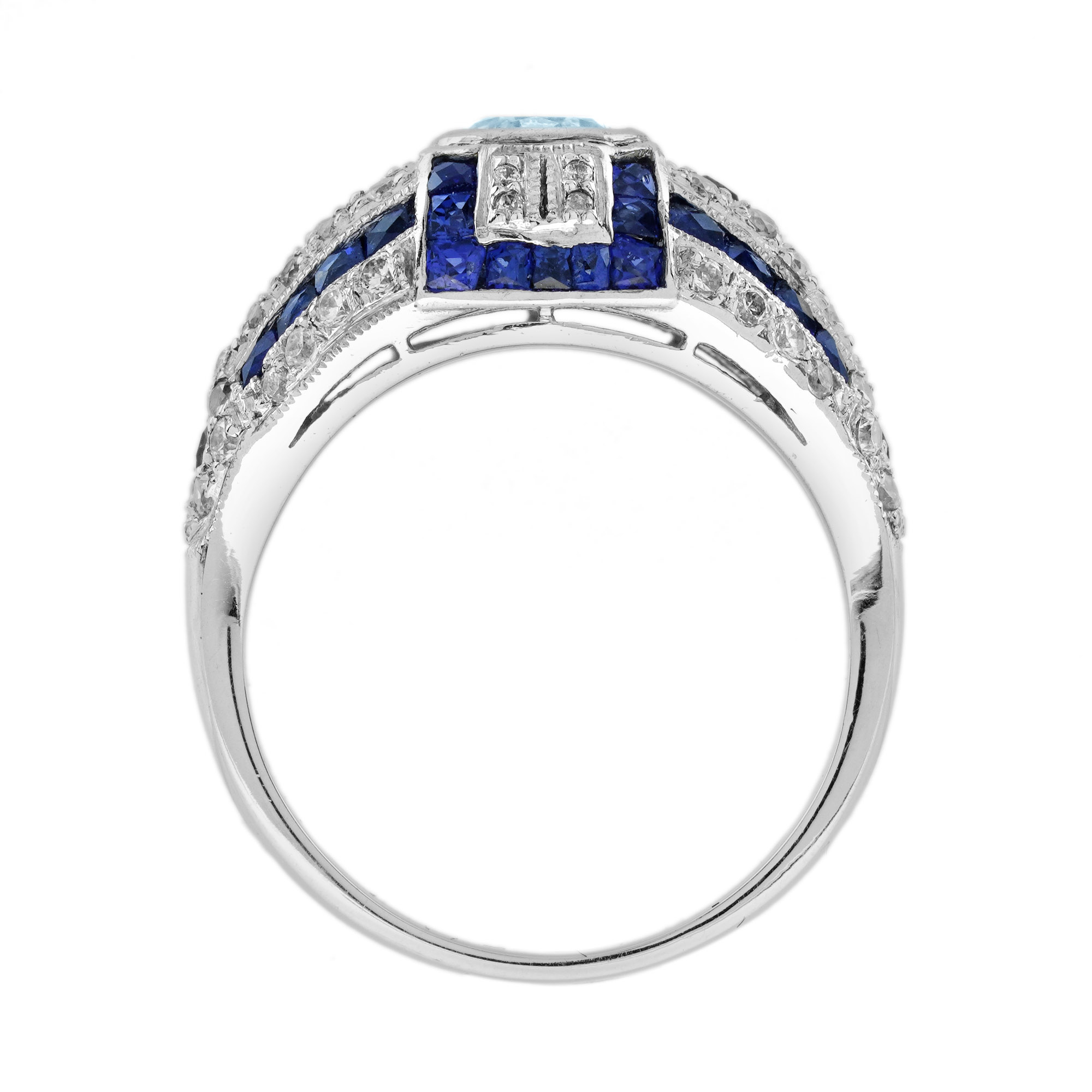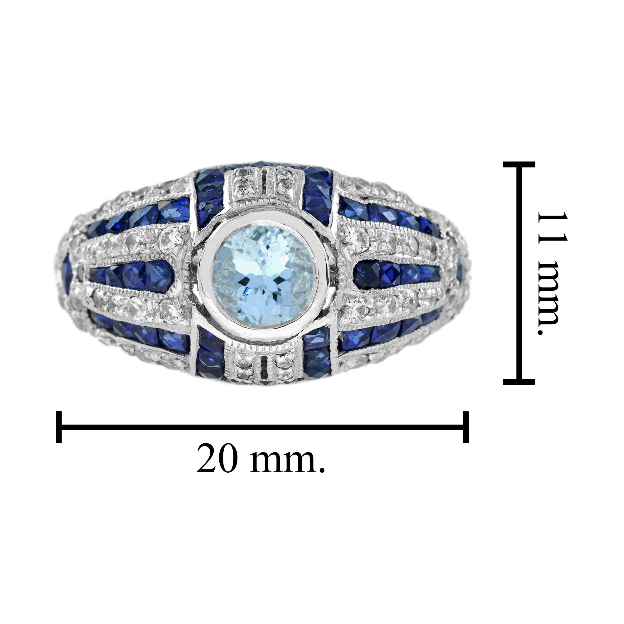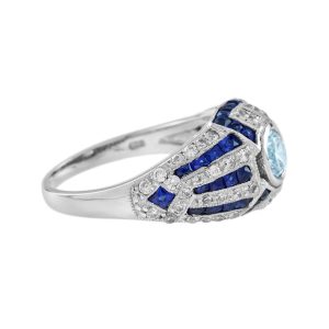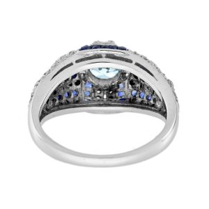 A beautiful bright and shining round cut aquamarine, sparkles from within a bezel setting embellished by horizontal rows of bright white diamonds accented by slender stripes of royal blue French cut sapphires in this finger hugger. A unique engagement ring that you will fall in love with.