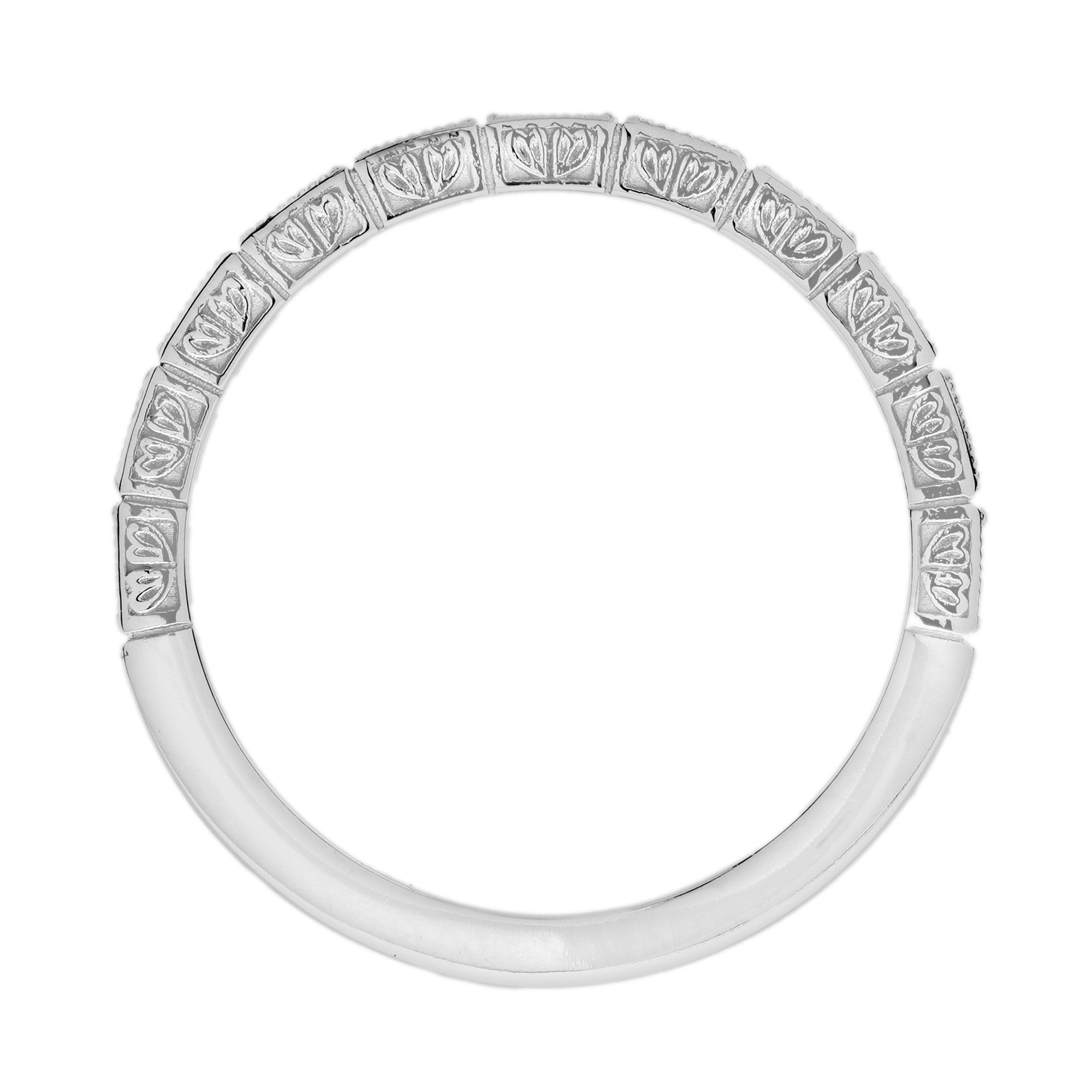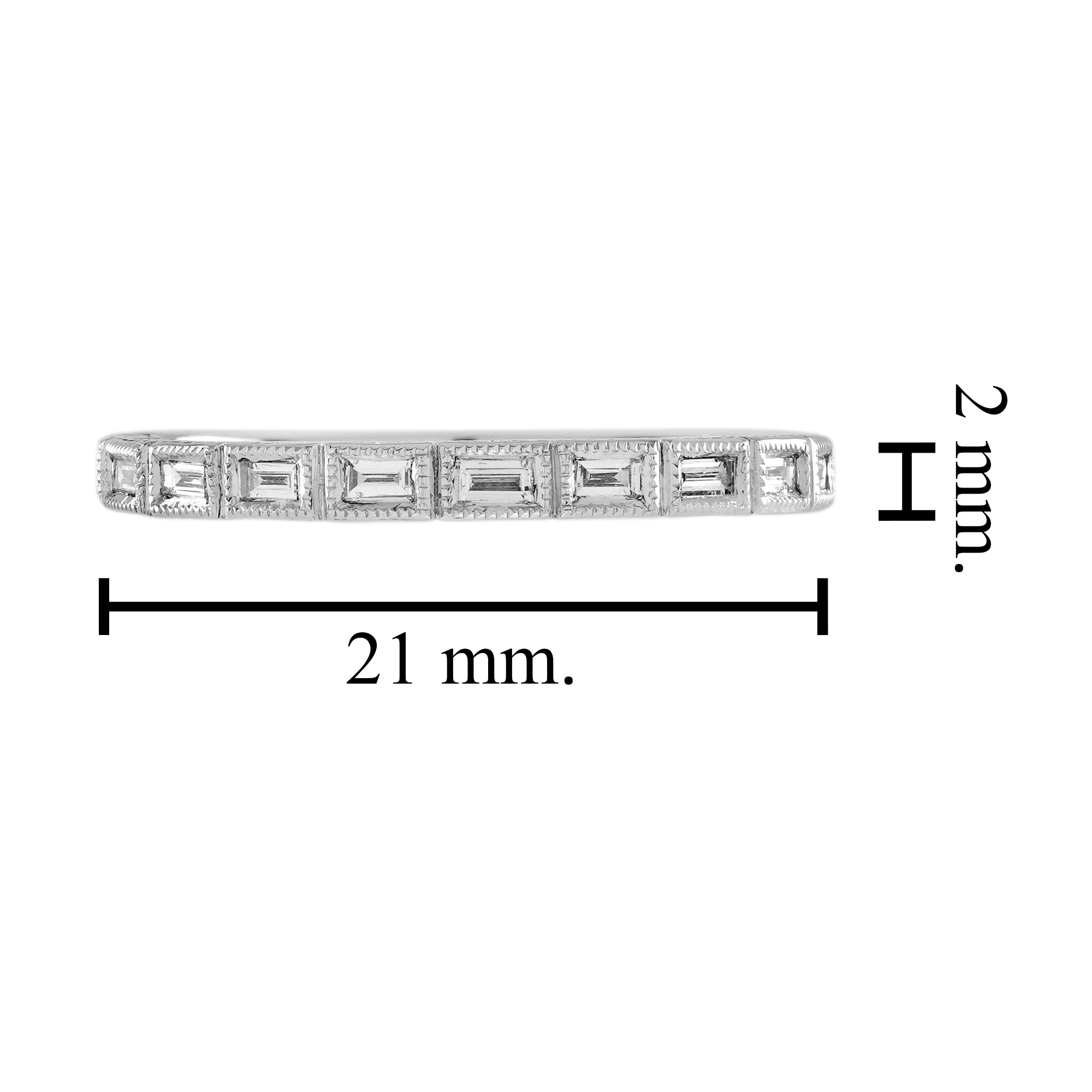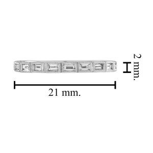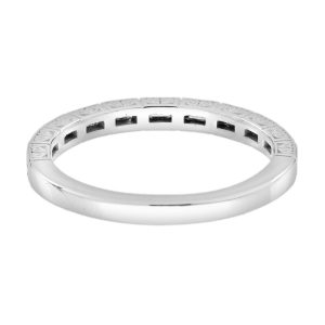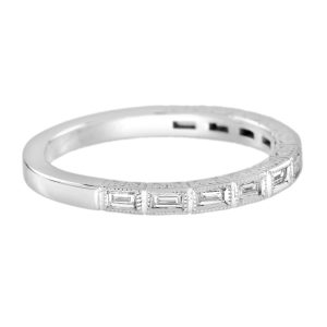 A lovely Art Deco inspired half eternity band ring! The band is meticulously design with horizontally set baguette cut diamonds with color H and clarities SI1-SI2. This beautiful piece can be paired with your engagement ring or it can be worn by itself as a perfect stand alone piece.