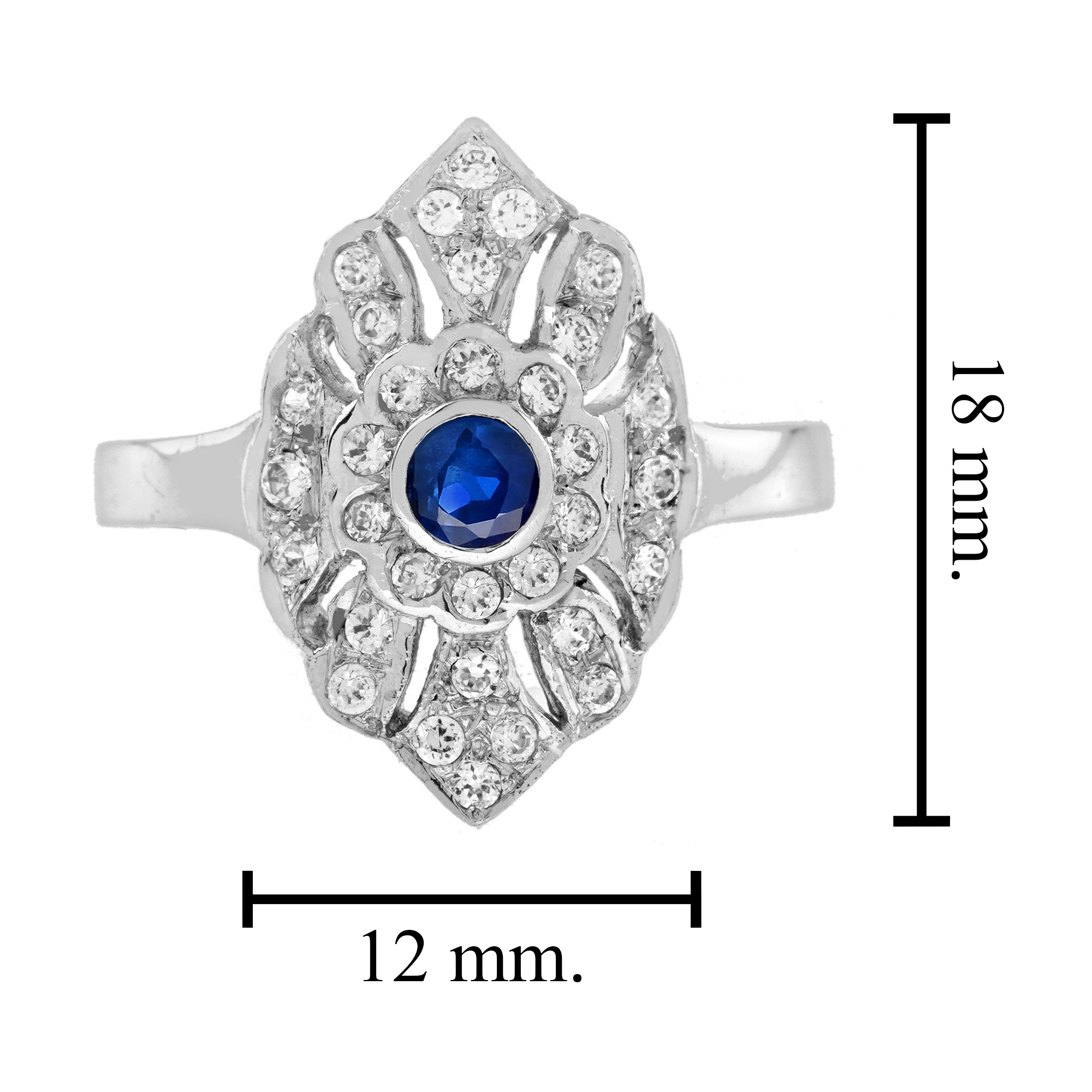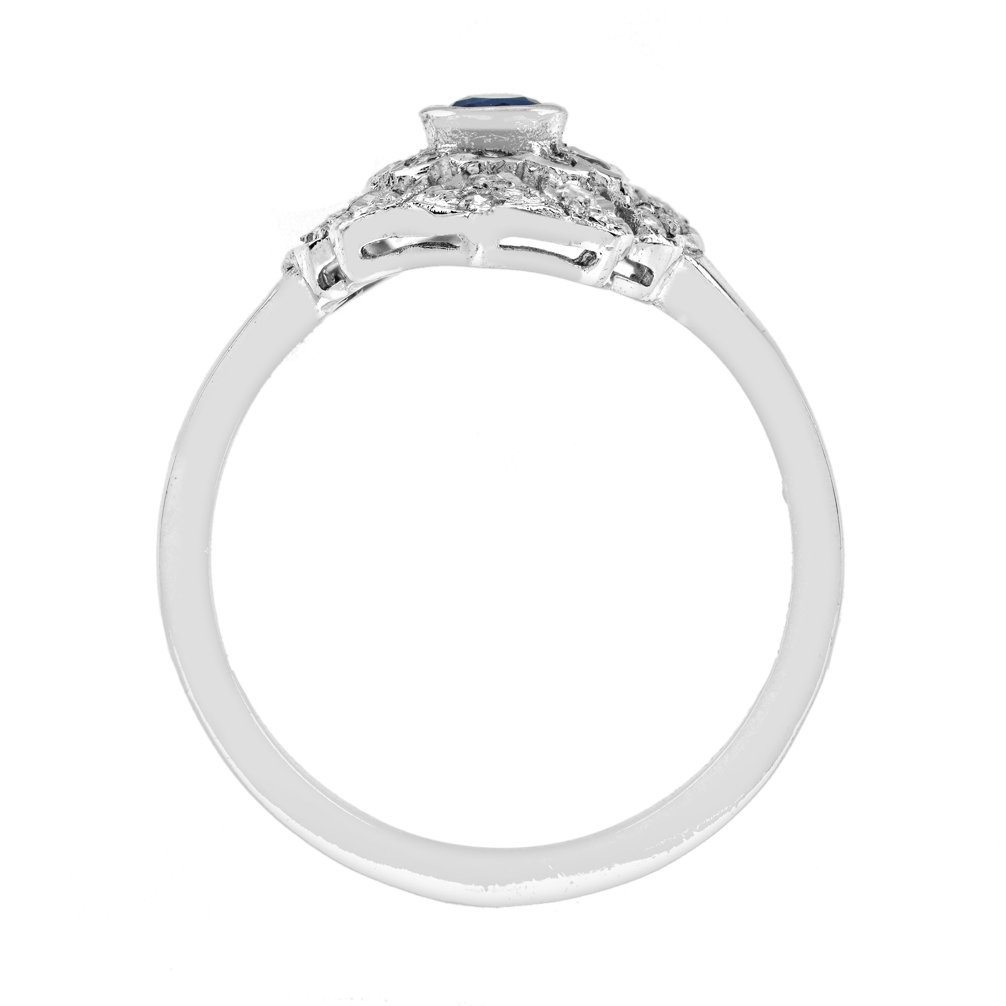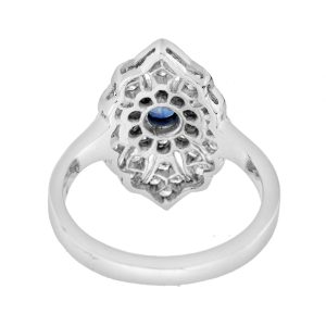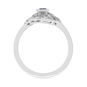 This outstanding blue sapphire and diamond ring features a central round blue sapphire set in 14k white gold bezel and surrounded by a halo of 30 round cut diamonds branched off between the beautiful open-work and milgrain detailing, modelled in white gold. This stunning ring would make the perfect engagement ring or a great additional to any collection.