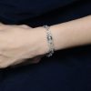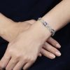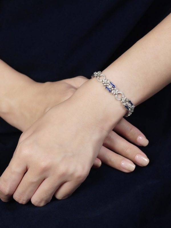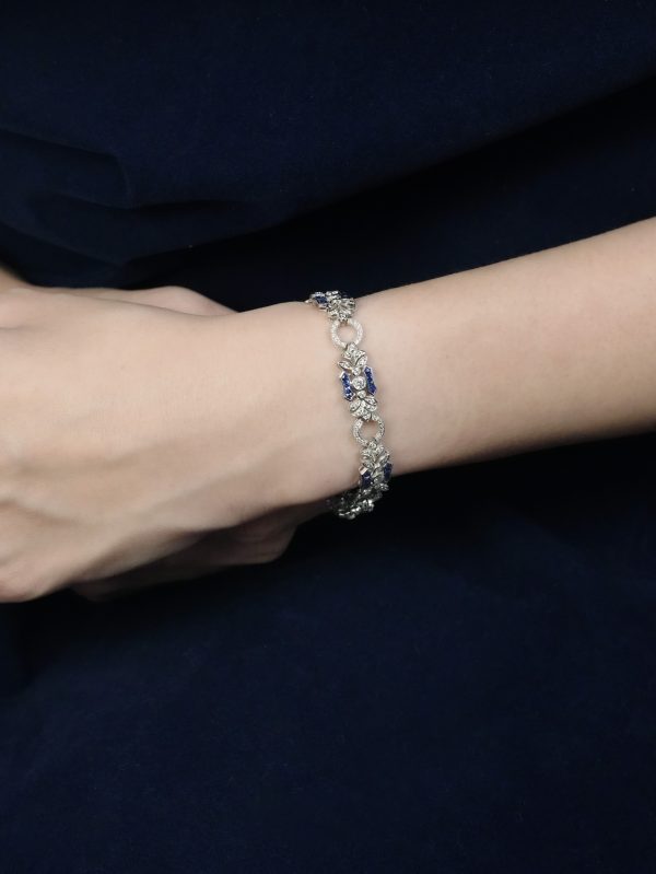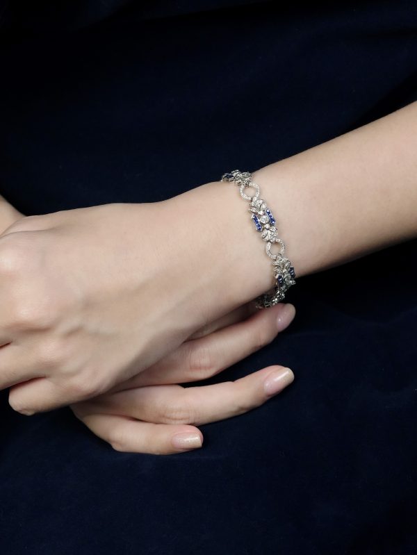 This Sapphire and Diamond Art Deco-style flower bracelet is a stunning piece of artistry and elegance. Each delicate part is adorned with vibrant blue sapphires at its center, surrounded by sparkling diamonds that enhance the intricate geometric design. The white gold setting provides a sleek and polished backdrop, adding a touch of luxury to the bracelet’s vintage-inspired charm. With its symmetrical, floral motif and timeless appeal, this bracelet is the perfect accessory to elevate any ensemble, exuding both sophistication and grace. A true statement of love, beauty, and enduring style.