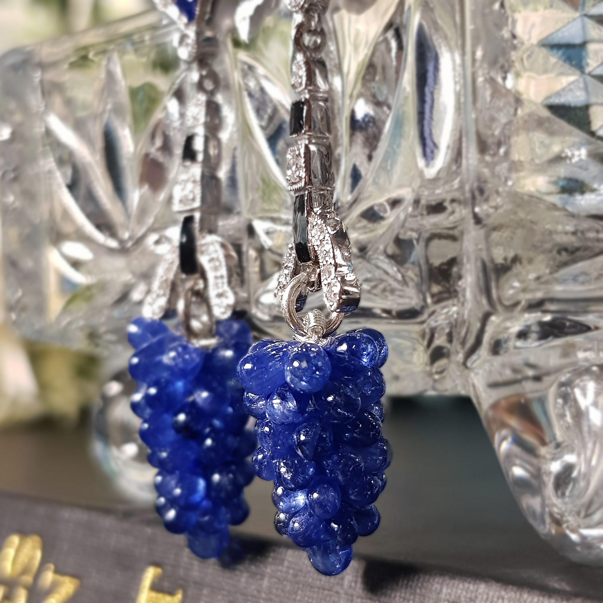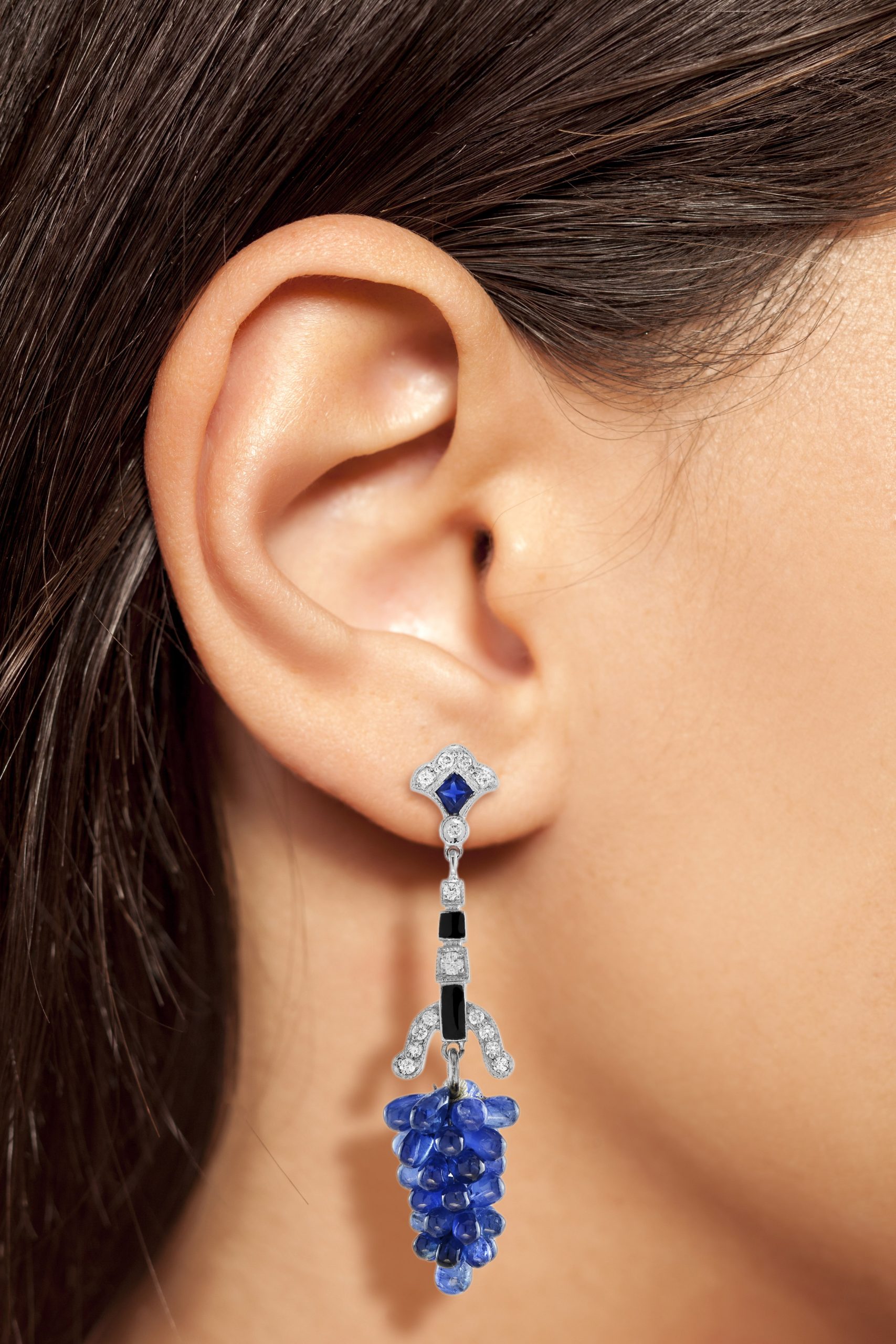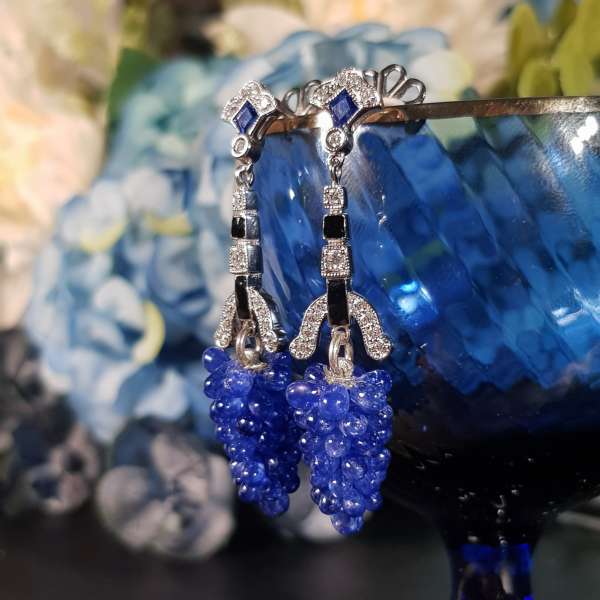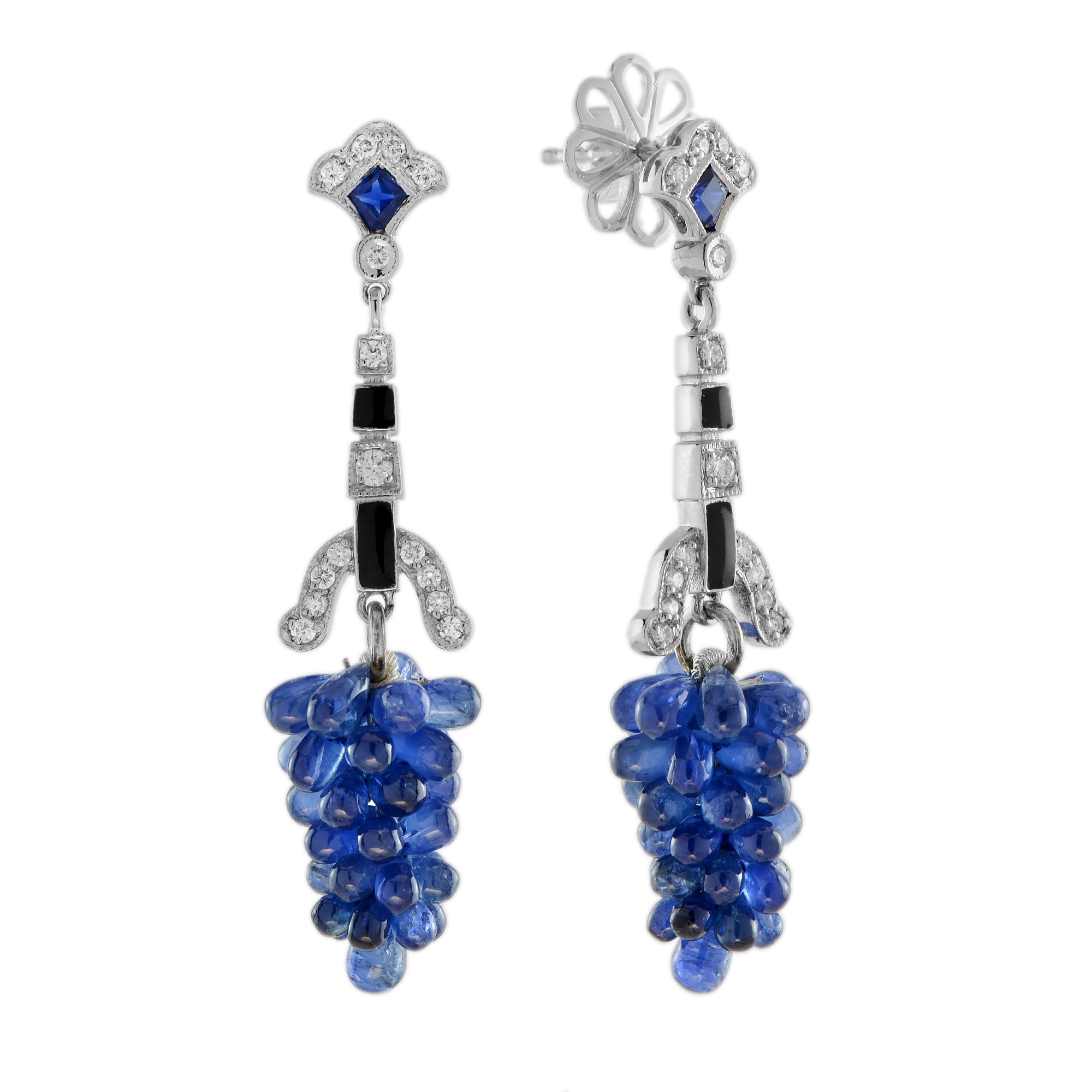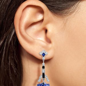 These one of a kind statement earrings are vintage inspired handcrafted using sapphire, diamonds and black enamel. Create your signature look with these lovely earrings.