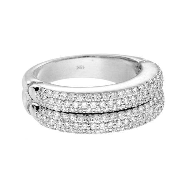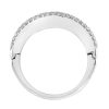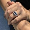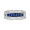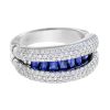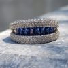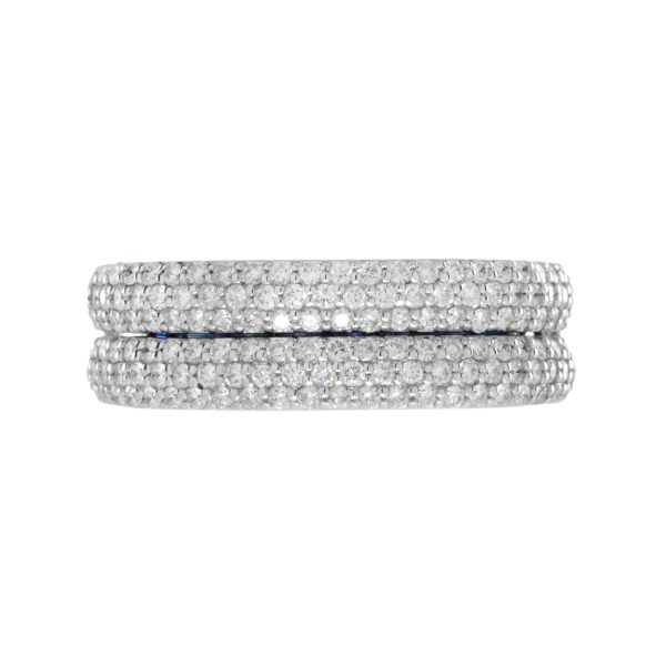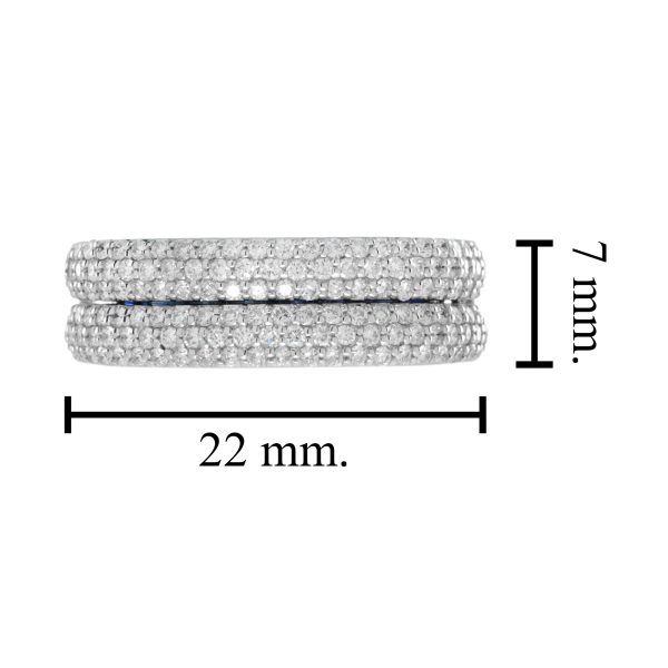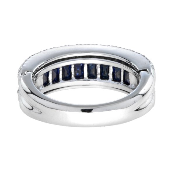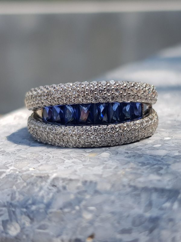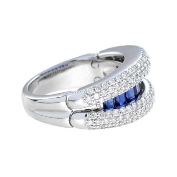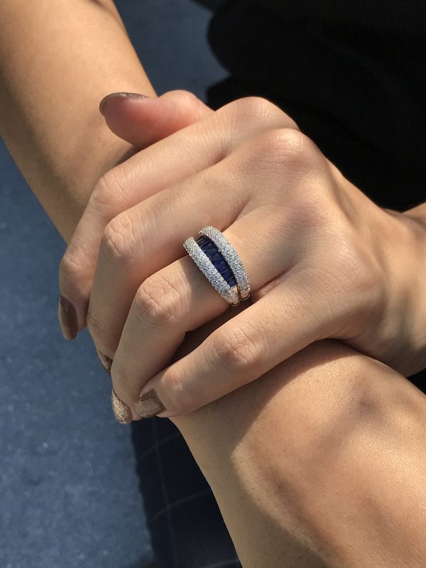 This elegant open-close band ring showcases a sleek row of French-cut blue sapphires at the center, offering rich color and clean symmetry. Flanked above and below by rows of sparkling diamonds, the design creates a striking contrast and refined brilliance. A modern take on Art Deco geometry, perfect for stacking or wearing solo with bold sophistication.