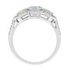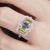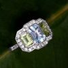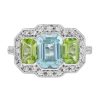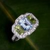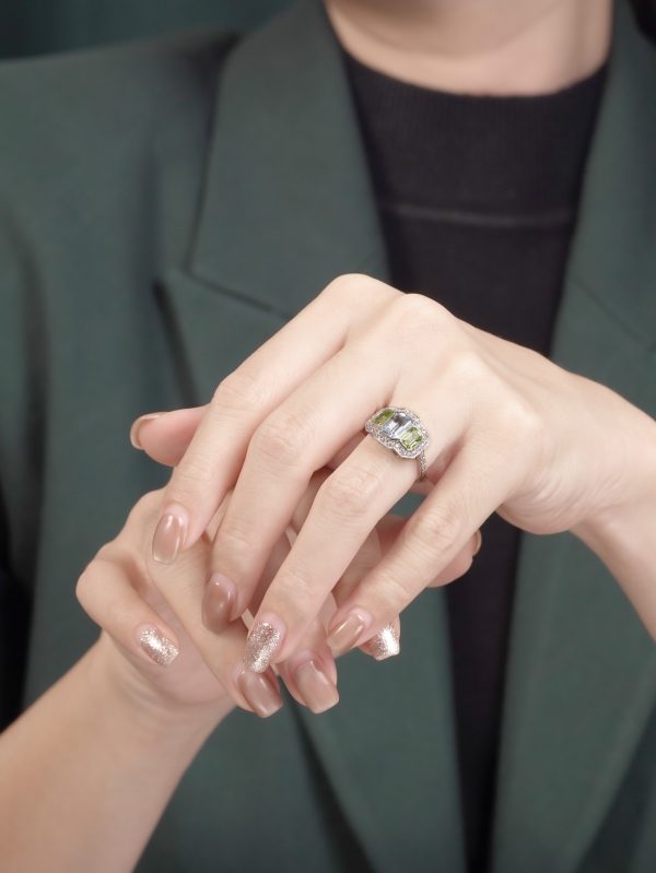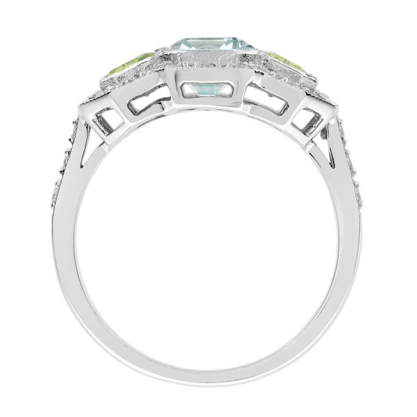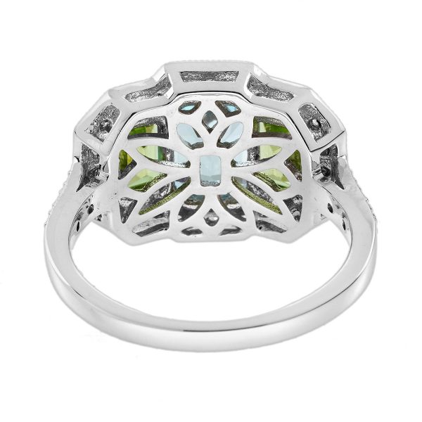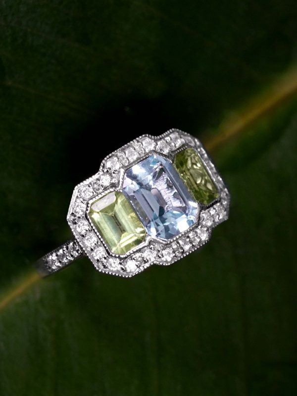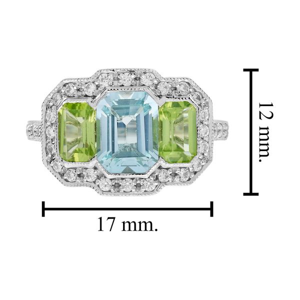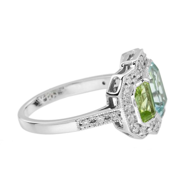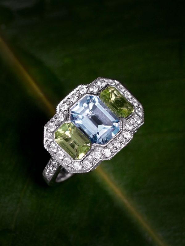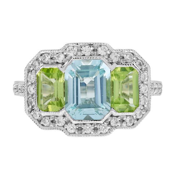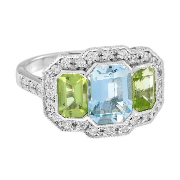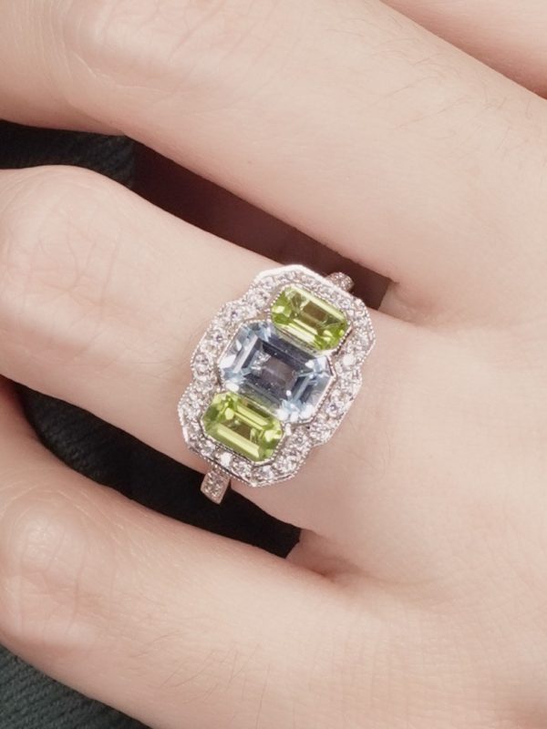 An Art Deco–style ring showcases a striking emerald-cut blue topaz at its center, radiating crisp brilliance and modern elegance. Emerald-cut peridots flank the center stone on both sides, adding fresh green contrast and geometric balance. A halo of sparkling diamonds surrounds all three stones, enhancing their clarity and symmetry. Clean lines and a bold color palette reflect classic Art Deco sophistication. Creative yet timeless, the ring captures architectural beauty with a refined and elegant presence.
