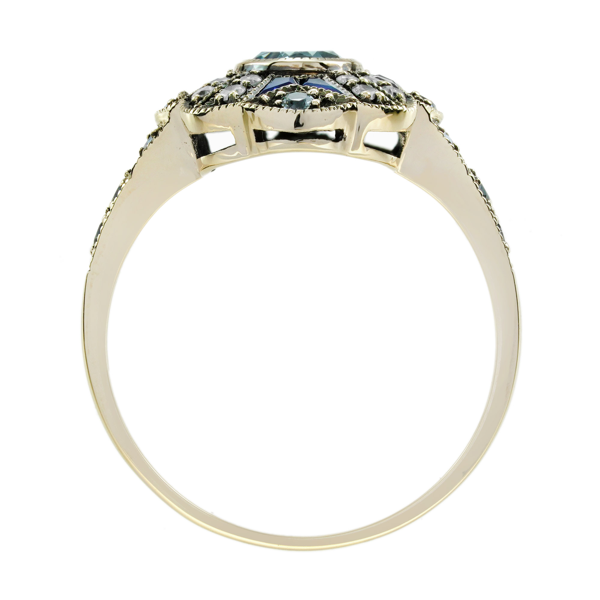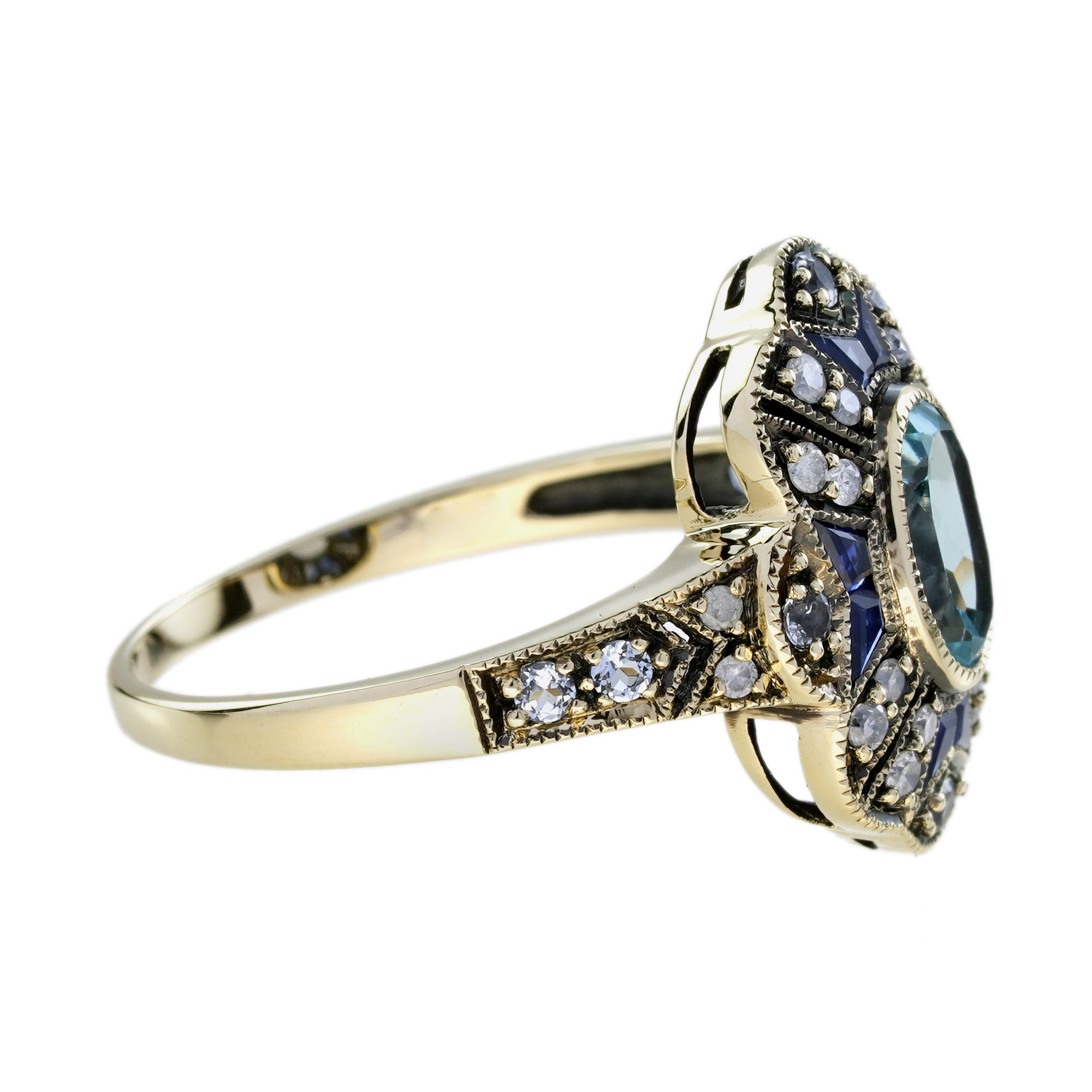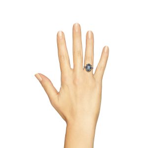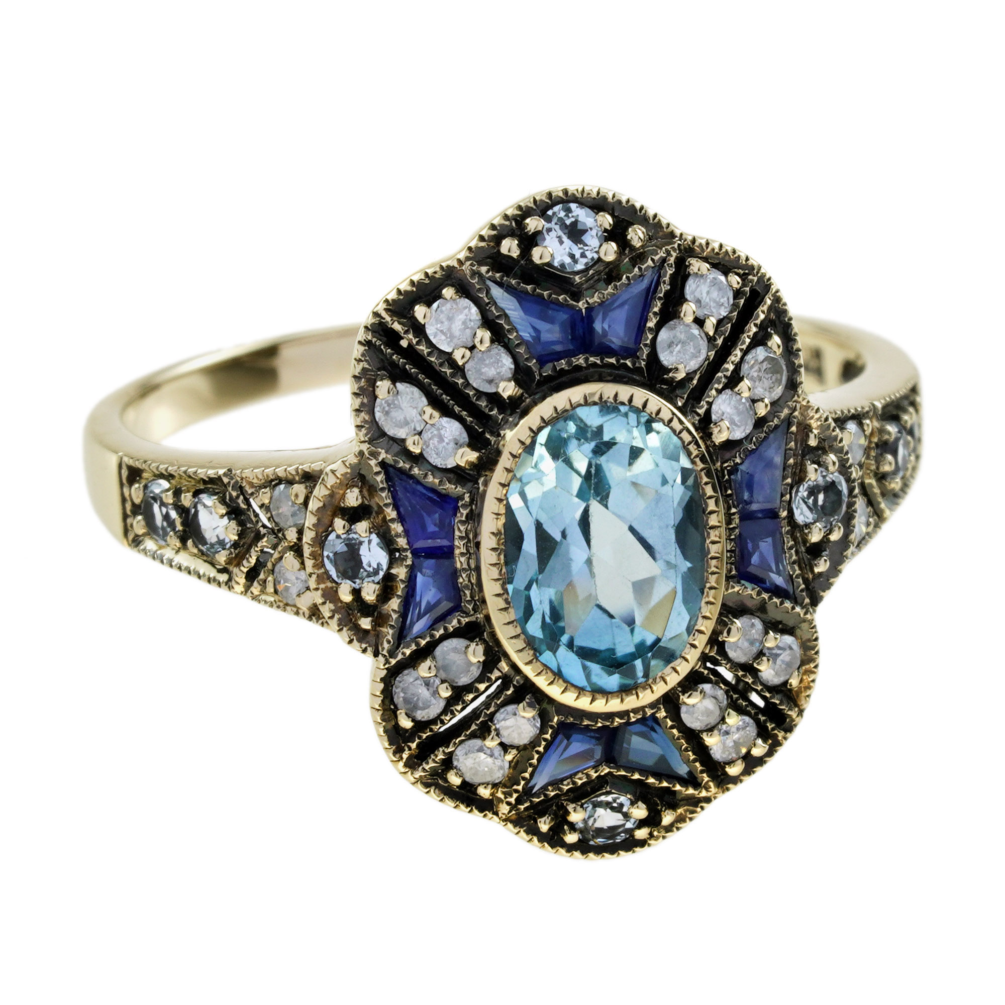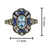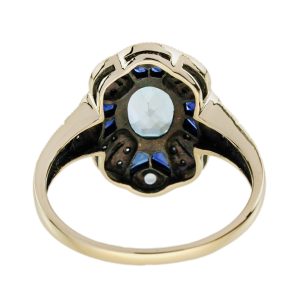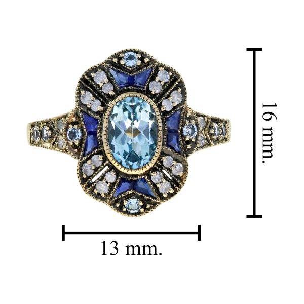 A striking Art Deco-style target ring full of vintage elegance. At the center, a bezel-set oval blue topaz glows with icy brilliance. Surrounding it, a floral-inspired design adds feminine charm. Blue sapphires accent the petals with rich, royal color.Brilliant diamonds bring light and sparkle to every detail. The layered design echoes Art Deco’s bold symmetry and grace.Perfect for those who love unique, romantic statement pieces.Expert craftsmanship and precious stones in perfect harmony.