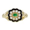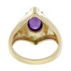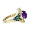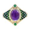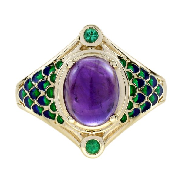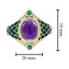 This antique-style Naka snake ring features a striking cabochon amethyst at the center, with round emeralds placed at the top and bottom of the stone. The design is inspired by the mystical Naka serpent, with delicate scales resembling the mythical creature. A captivating blend of elegance and symbolism, perfect for those who appreciate unique, meaningful jewelry.