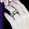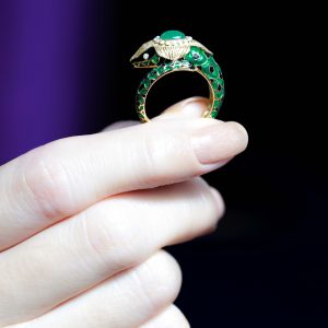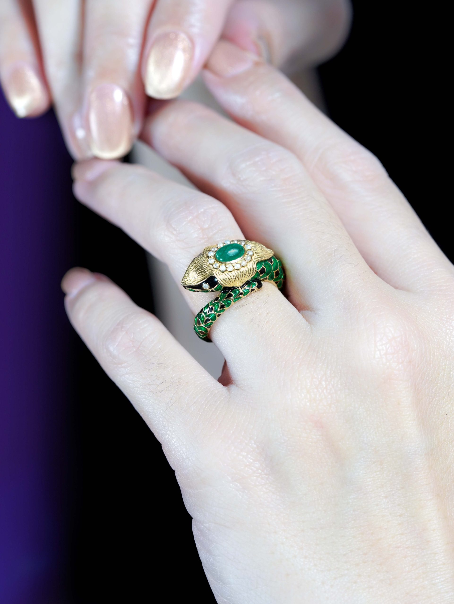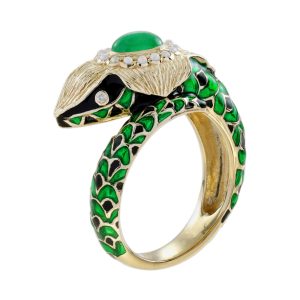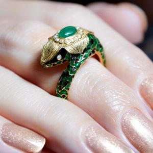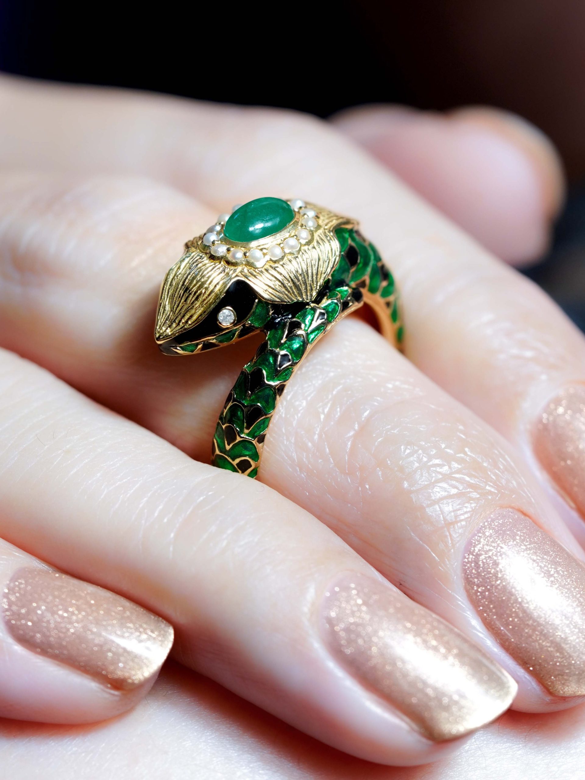 This antique-style Naka snake ring features a cabochon emerald set atop the snake’s head, encircled by lustrous pearls. The snake’s face is beautifully highlighted with intricate enamel work, while the scales are adorned with emeralds, adding a touch of luxury and mystique. Inspired by the mythical Naka serpent, this ring blends elegance and symbolism, making it a unique and captivating piece.