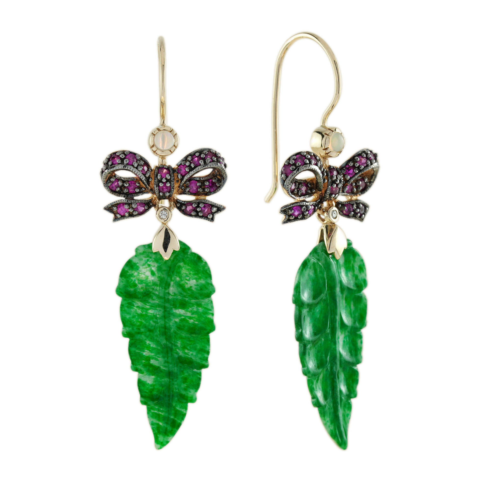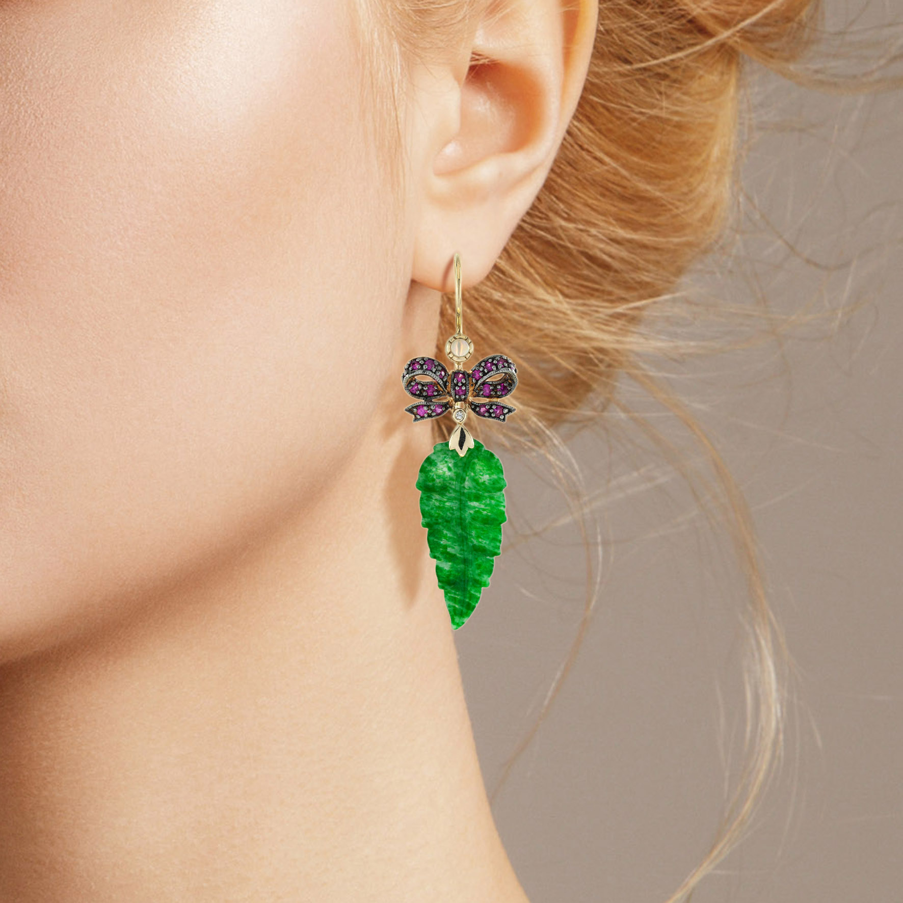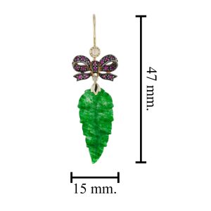The natural jade in these lovely earrings has some very special shape. Both pieces have a strong green color and well leaf carvings. The jade is suspended in a 9k yellow gold setting with ruby ribbon bow on the top. The earrings transfer their good energy and connect them to the wearer.