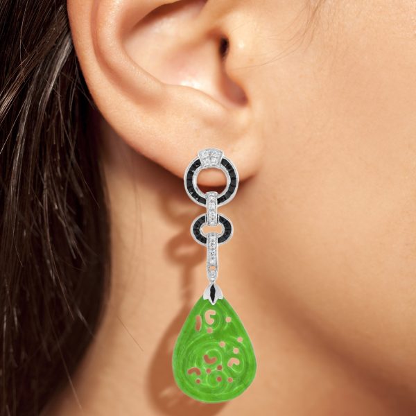 This is a lovely pair of vintage style jade with diamond and onyx dangle earrings crafted in 14k yellow gold. Each earrings are adorned with diamond and onyx set in geometric shape on their top part and setting with a hand carved natural jade drop. This is a fine piece of antique jewelry and would be perfect for any occasion.