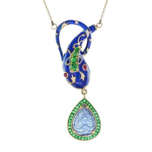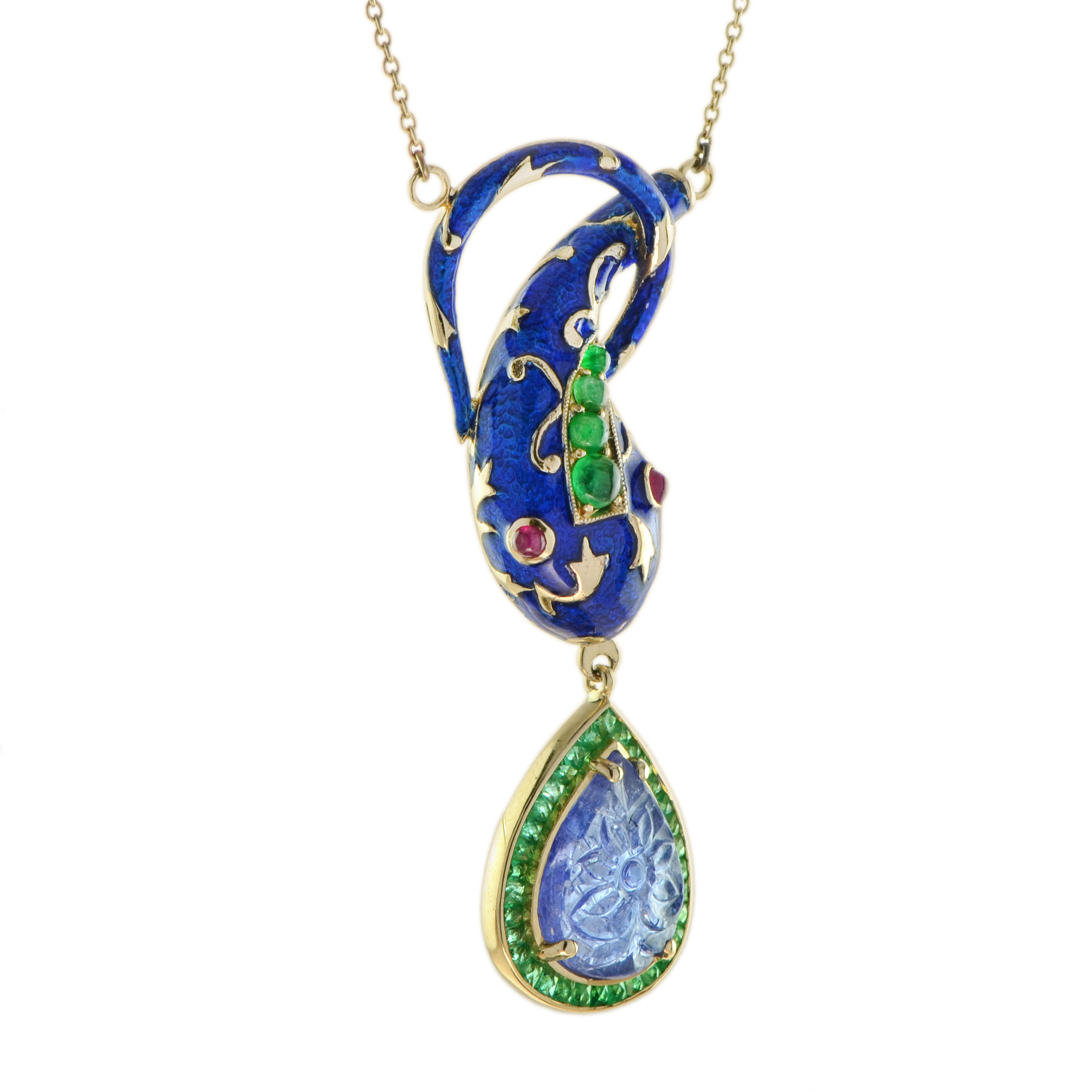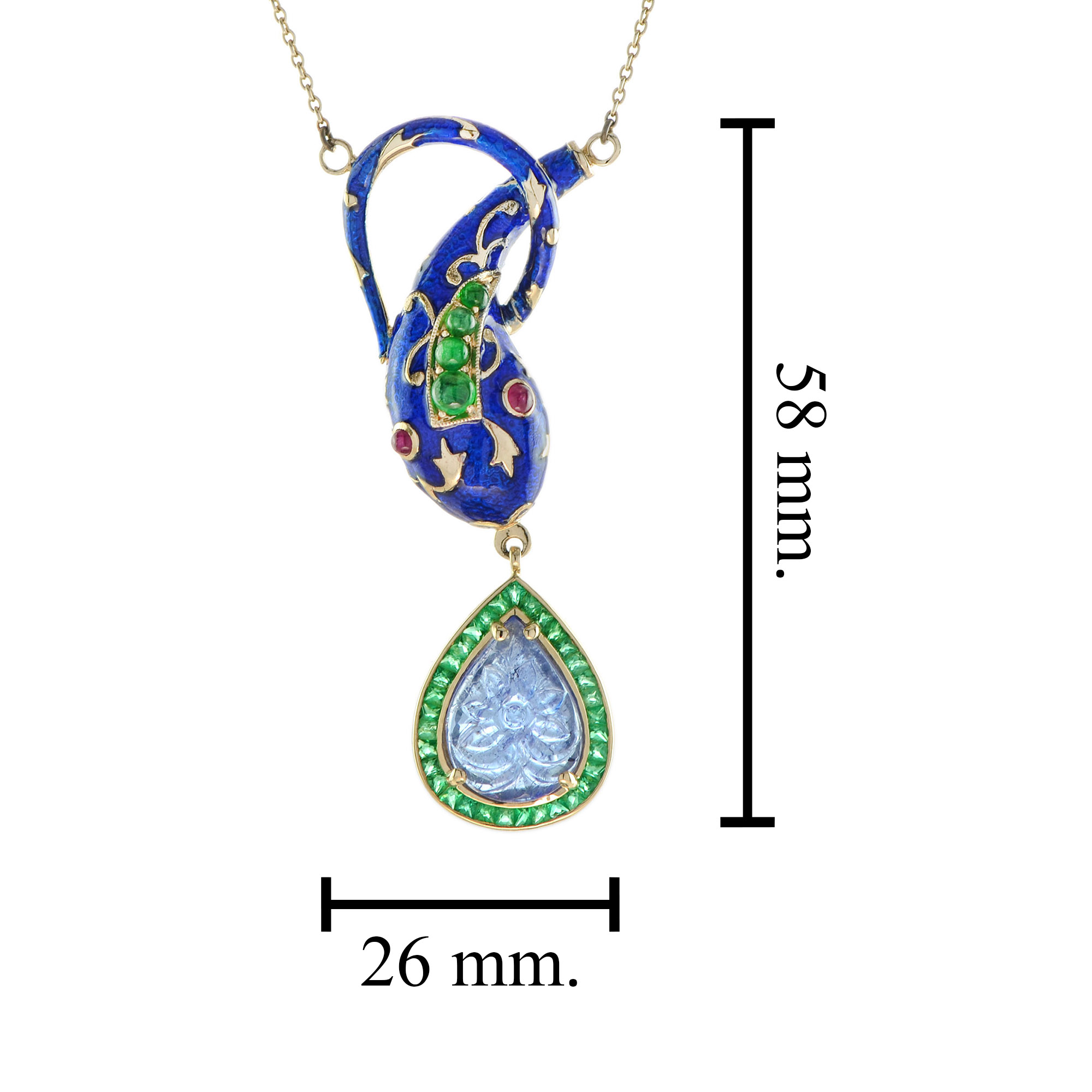 A beautiful and very wearable snake necklace has a friendly face with ornate blue enamel, engraving on the gold, cabochon ruby eyes and cabochon emerald on its her head. Hanging from her mouth is a beautifully carved pear shaped tanzanite surrounded by French cut emerald. The snake motif is antique jewelry means and eternal love and wisdom. A perfect piece for a gift from an admirer.