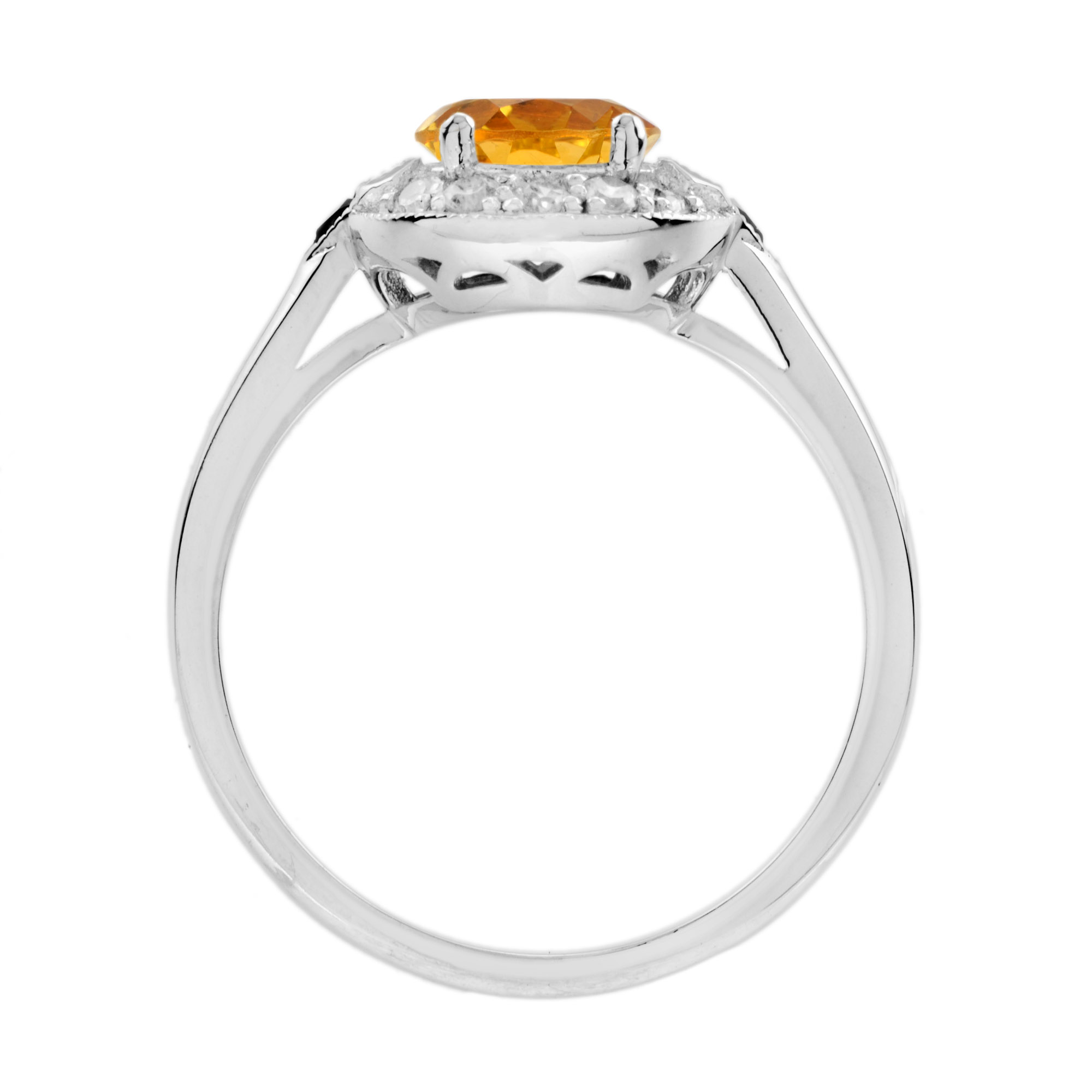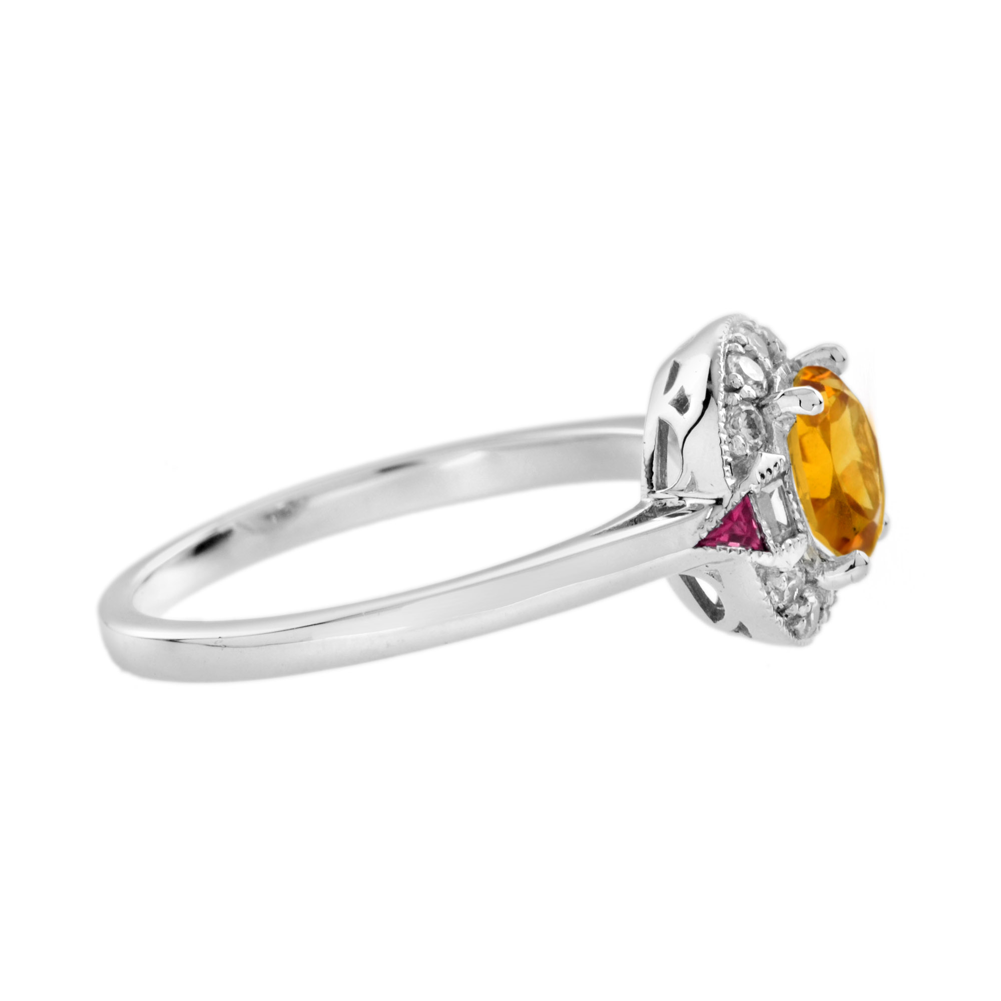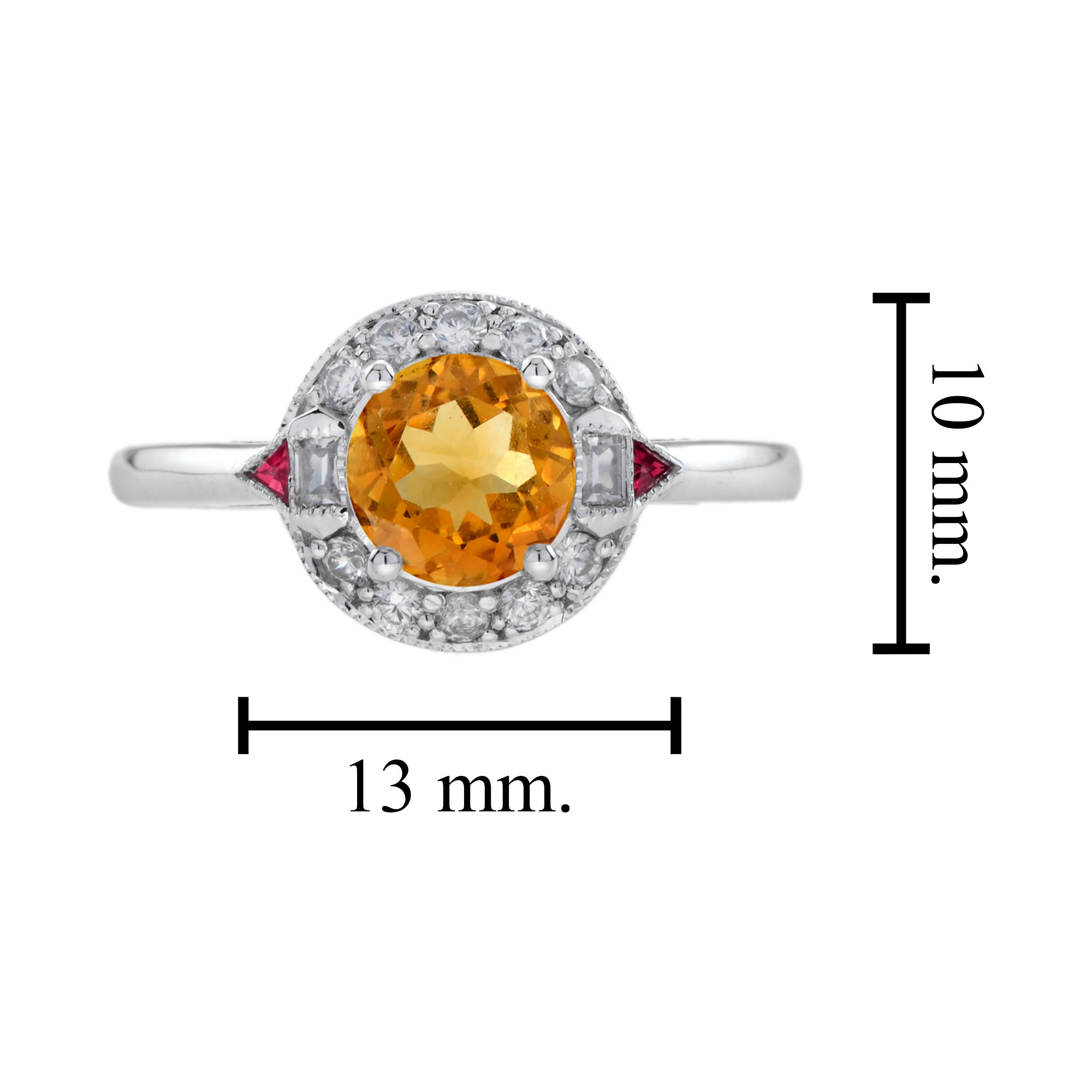 An enchanting gemstone meets a classic mounting in this distinctively gorgeous Art Deco style jewel. The round honey-colored citrine is framed by round diamonds. The shoulders features French cut triangle shaped rubies – just stunning!