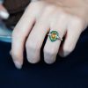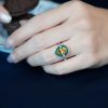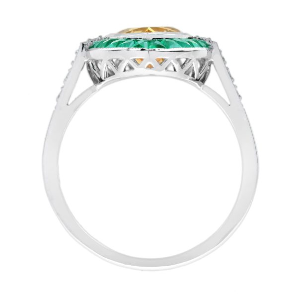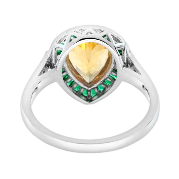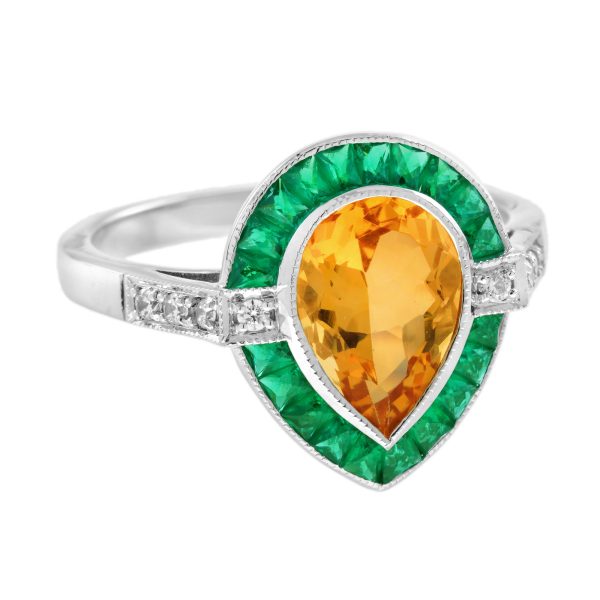 This unique Art Deco-inspired engagement ring features a vibrant pear-shaped citrine as the centerpiece, radiating warmth and elegance. It’s beautifully framed by rich green French-cut emeralds, creating a striking contrast. The shoulders of the ring are adorned with sparkling diamonds, adding brilliance and refined detail. A bold and colorful choice, perfect for those who love vintage charm with a touch of individuality.