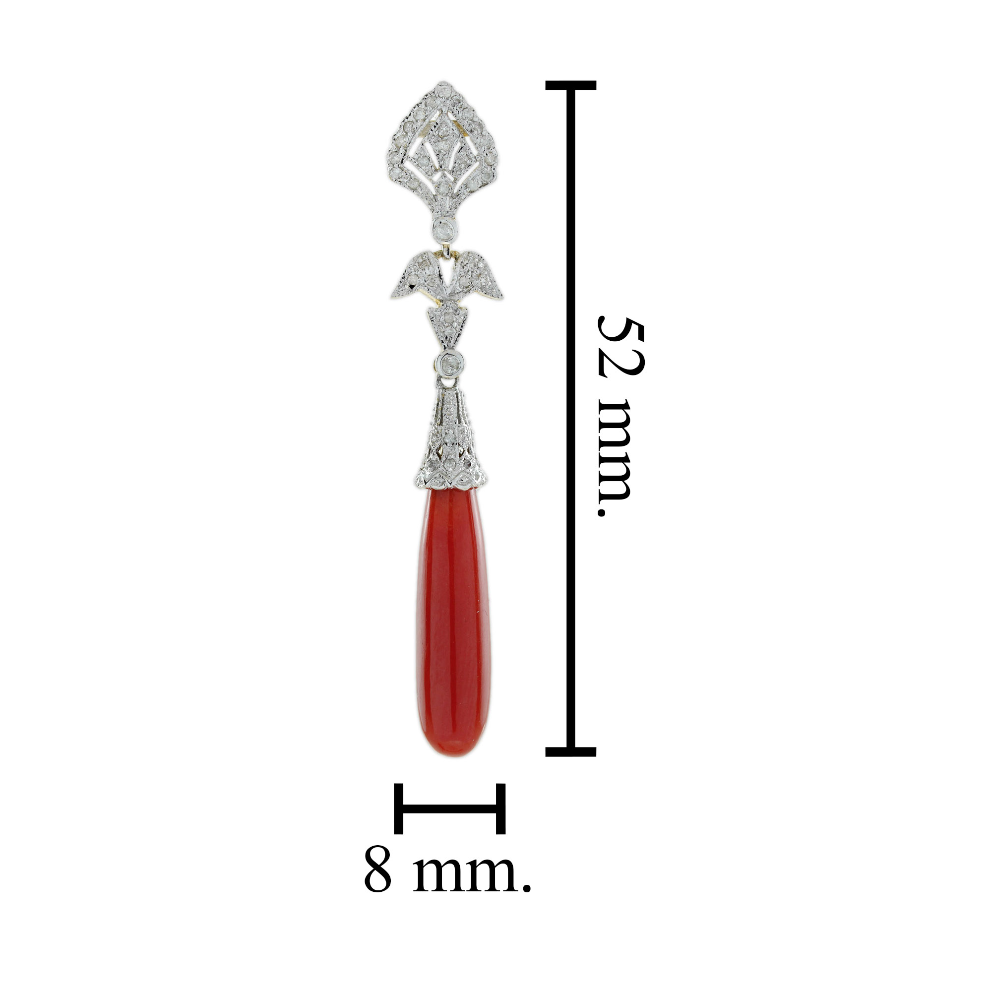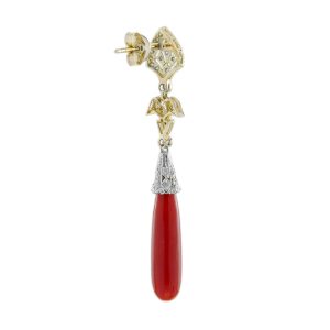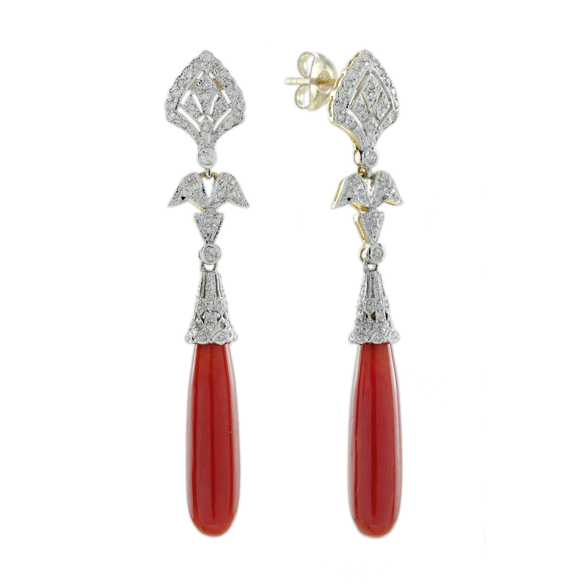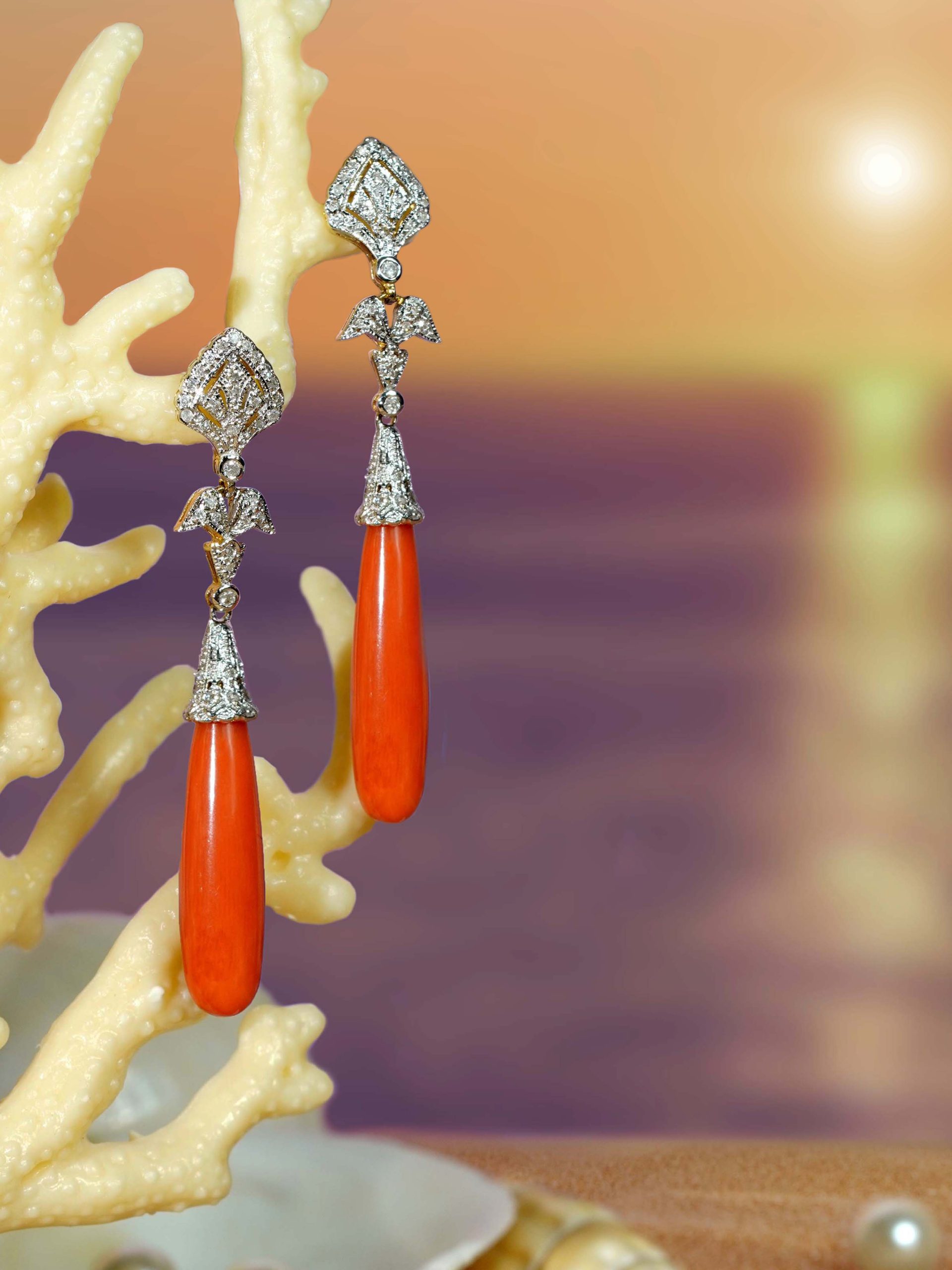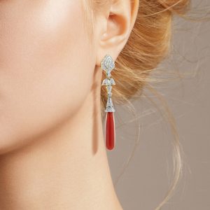 Featuring vibrant coral drop shapes, suspended from a diamond-studded geometric top. The diamonds are arranged in a symmetrical, angular pattern, creating a bold contrast with the smooth coral. Set in platinum or white gold, these earrings offer a perfect blend of luxury and timeless design. A striking statement piece for any occasion.