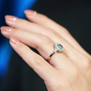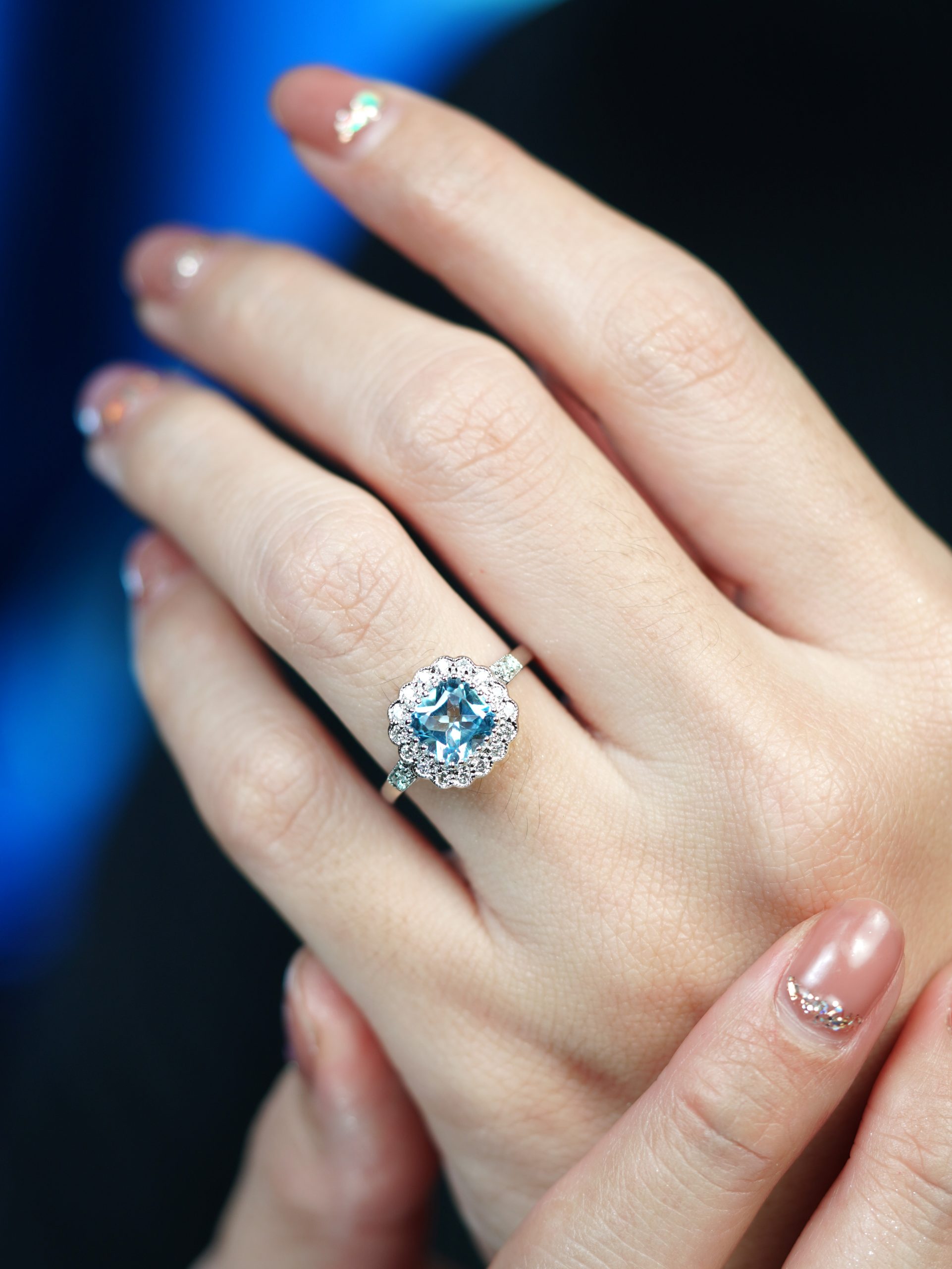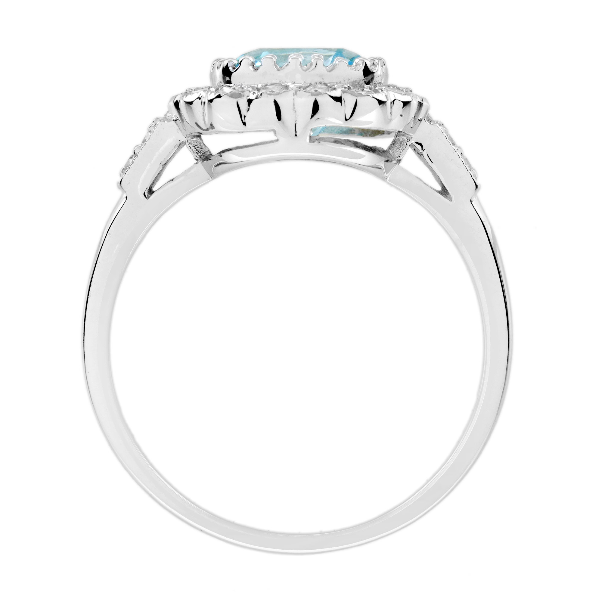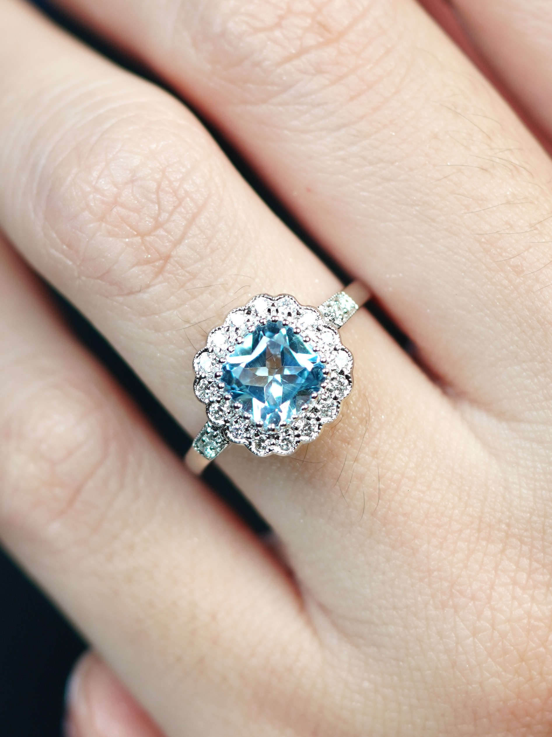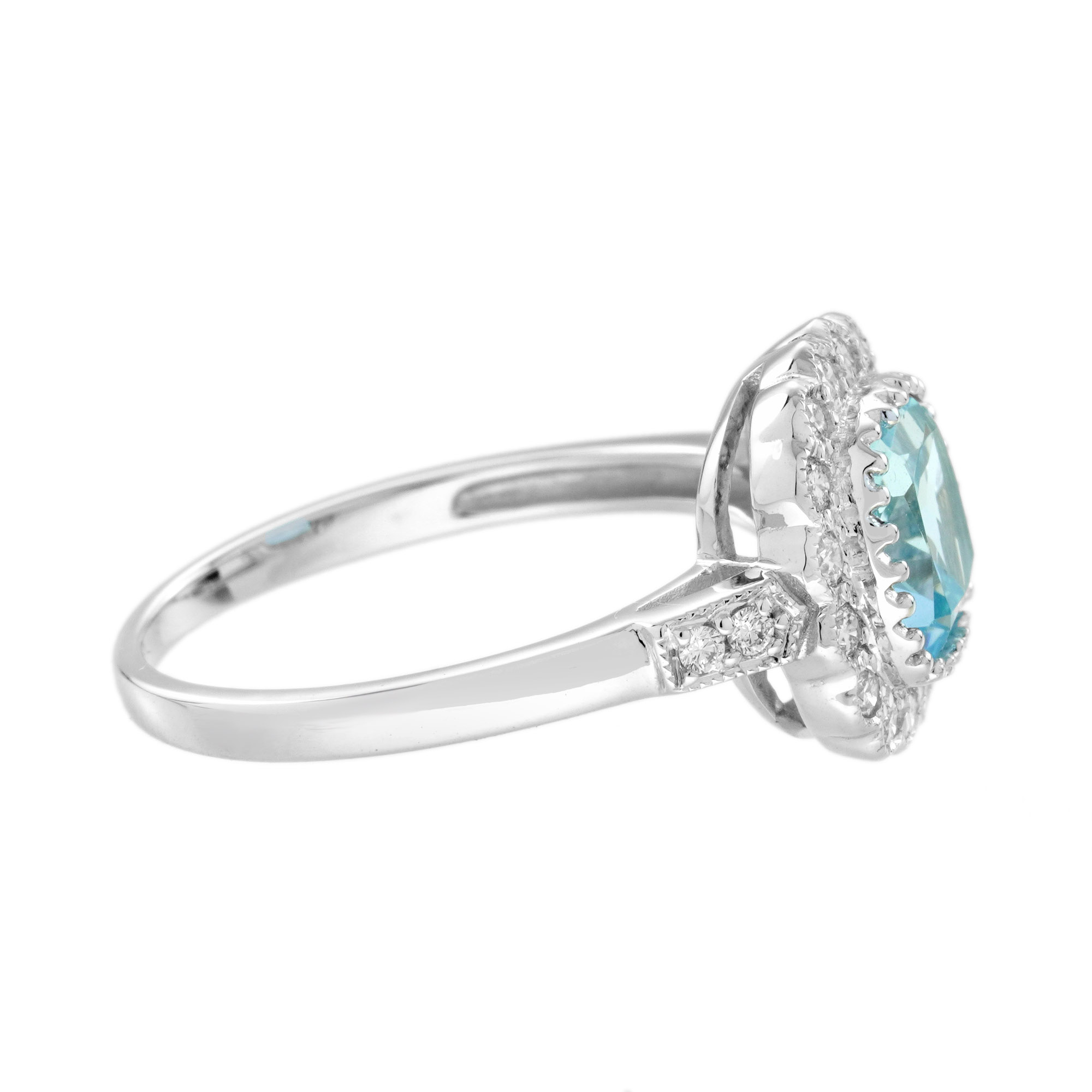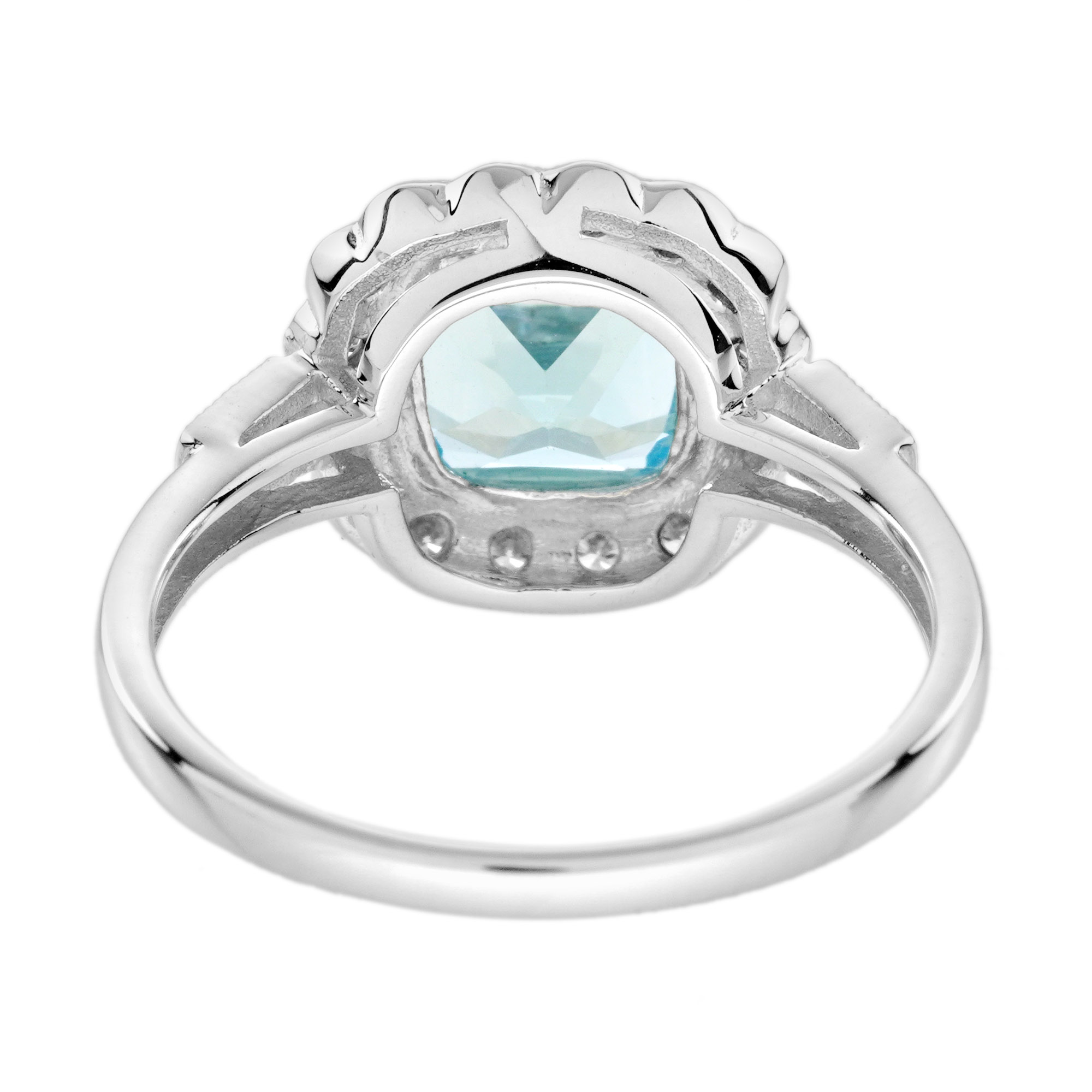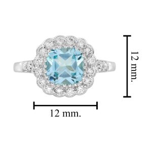 Radiant elegance meets timeless design in this Art Deco-inspired engagement ring. A luminous cushion Blue Topaz takes center stage, embraced by a halo of sparkling diamonds. Geometric lines and intricate details highlight the vintage charm, making it a statement of love and sophistication. Perfect for those who cherish classic beauty with a modern twist.