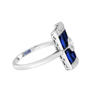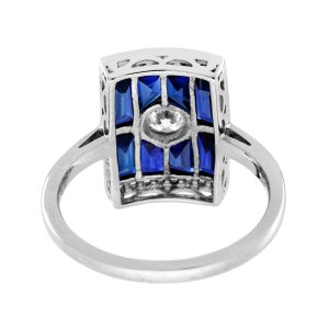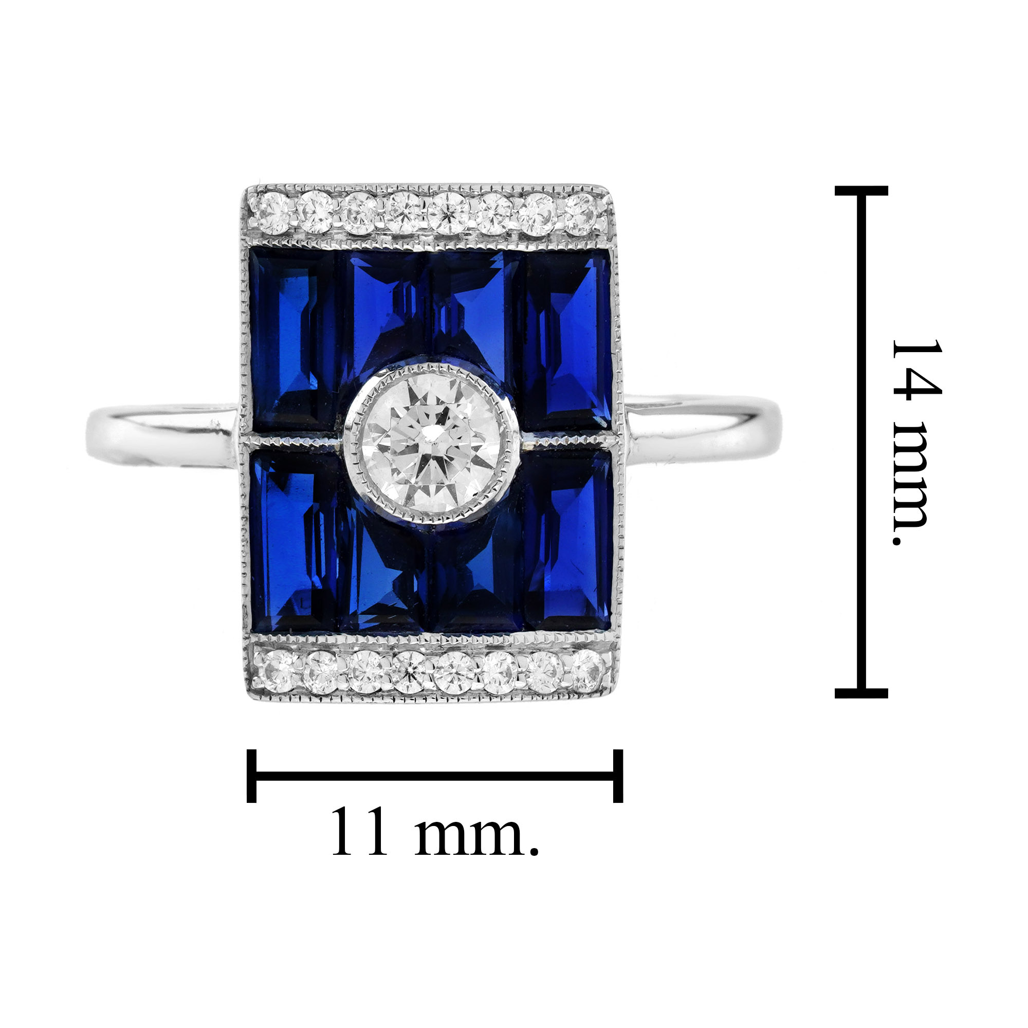 Art Deco design diamond and blue sapphire rectangular target ring in white gold. Centered with an estimated 0.25 carat diamond surrounded by eight calibre cut sapphires in visible settings and flanked with two horizontal rows of diamonds in grain settings, to a geometric cluster with milgrain settings.