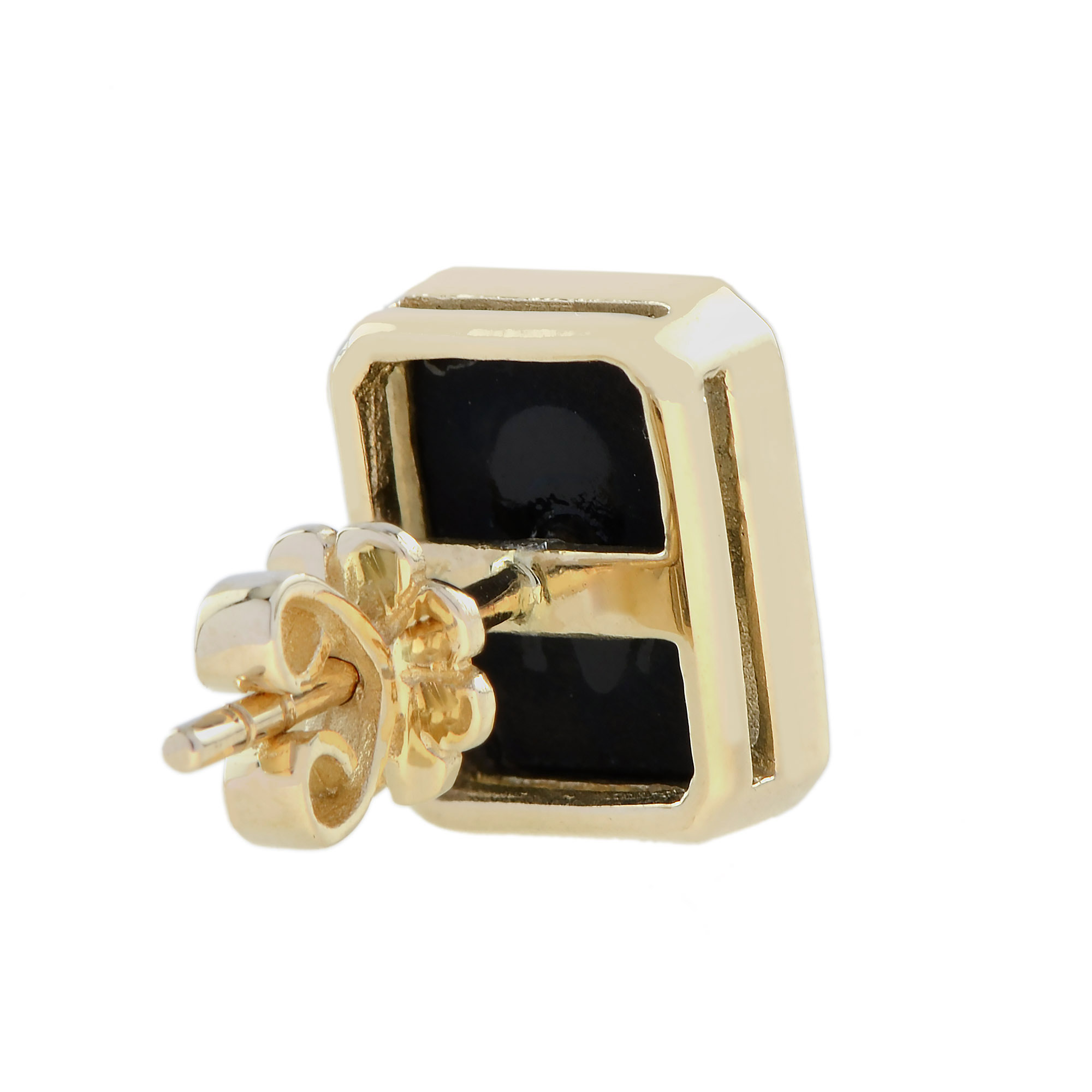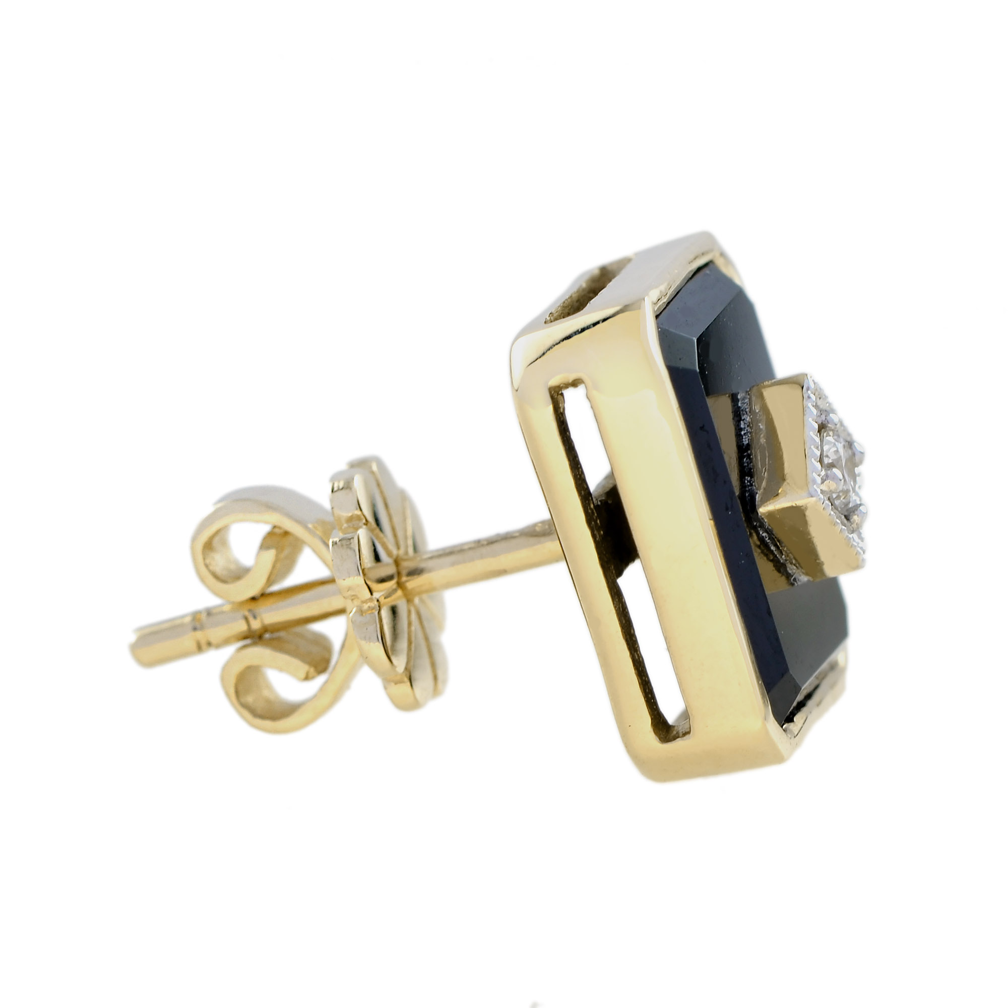 An extraordinary Art Deco inspired stud earrings with a bezel set octagonal shaped onyx and central round brilliant cut diamond set in yellow gold setting. Sure to add some glamour to any outfit.