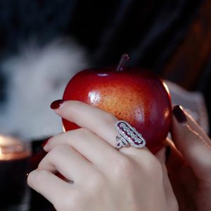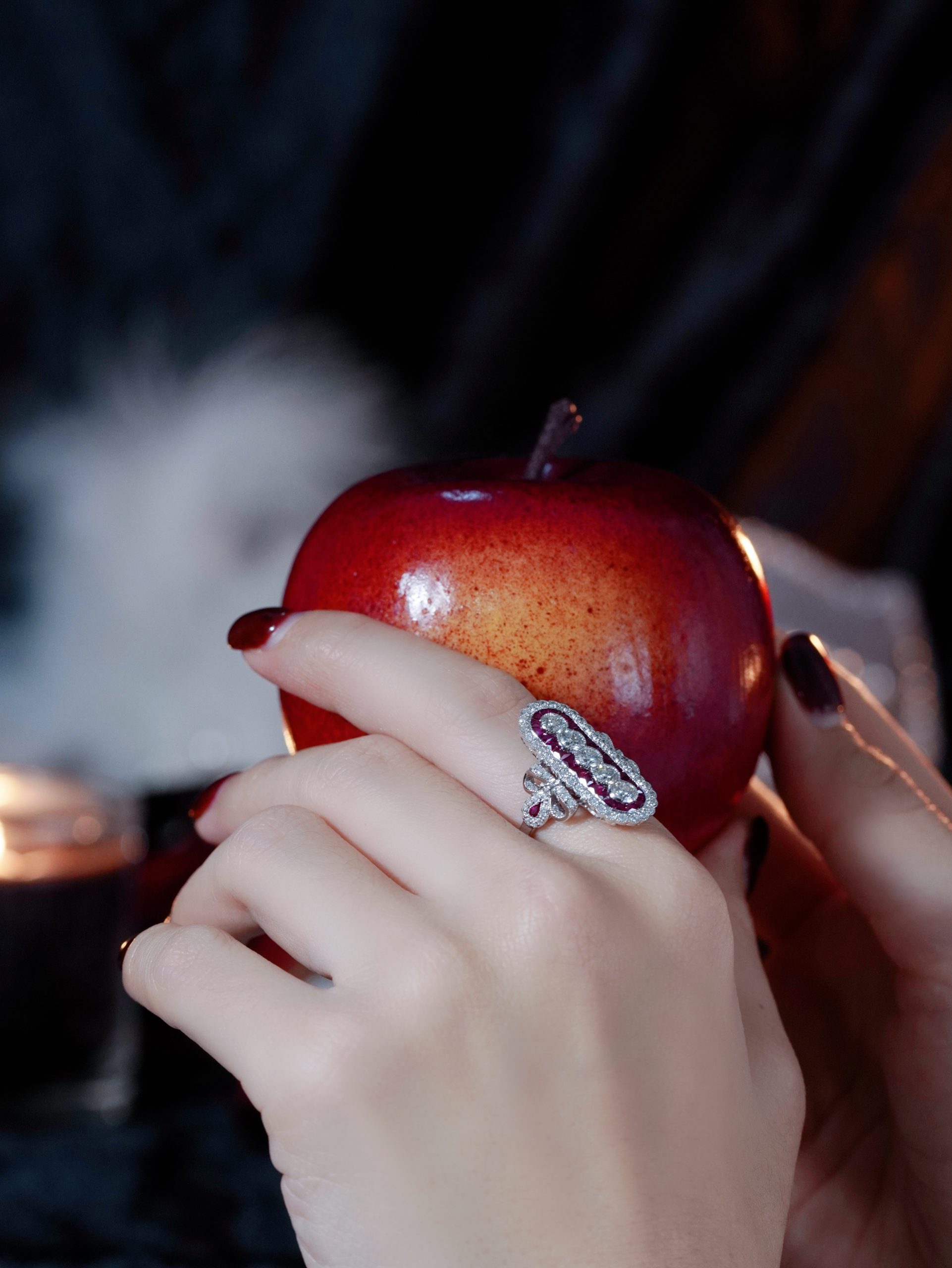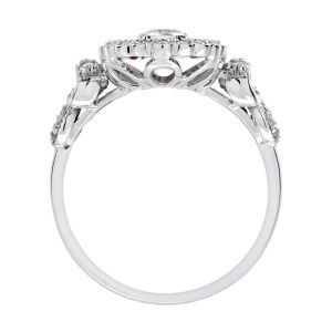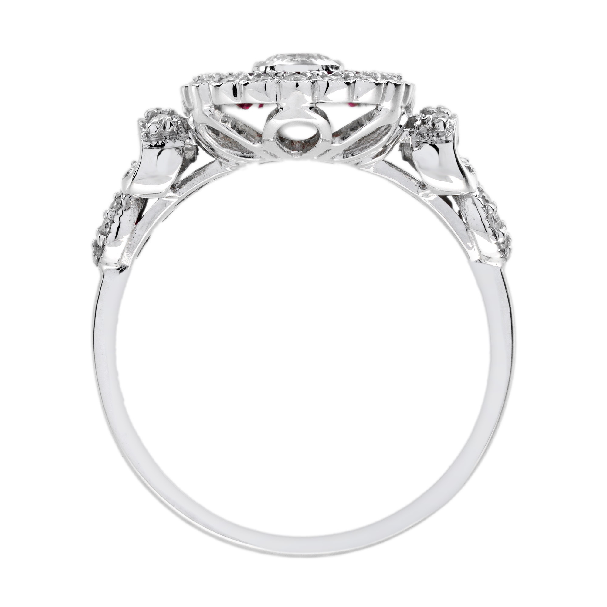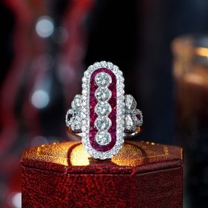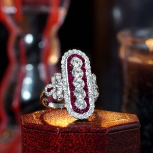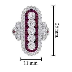 Classic romance meets bold design in this dazzling Art Deco-style cocktail ring. A brilliant round diamond sits at the center, set vertically for a unique twist, while vibrant French-cut rubies line the band with rich, regal color. Framed by a halo of shimmering diamonds, the design radiates vintage elegance with a modern flair. Every detail reflects timeless craftsmanship and bold individuality. Perfect for the one who loves with passion and wears it beautifully.
