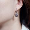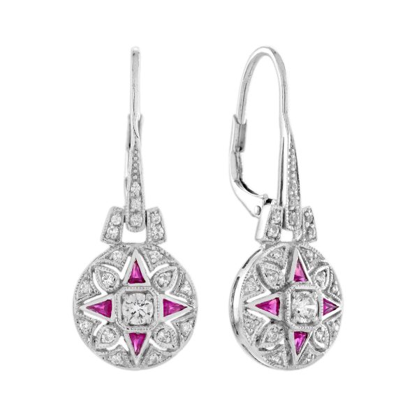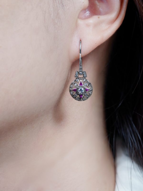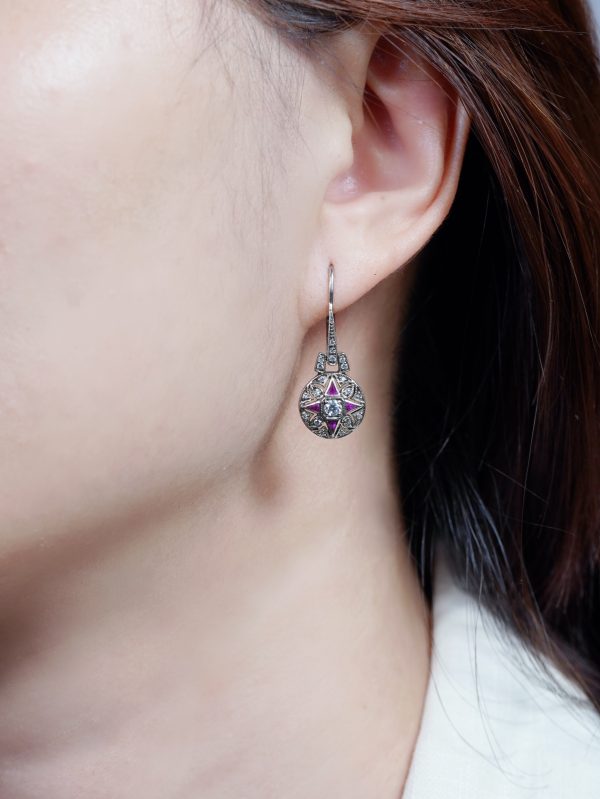 Timeless elegance meets vintage charm in these antique-style dangle earrings. At the center sits a brilliant round diamond, encircled by rich, triangle-shaped French-cut rubies that form a bold yet graceful floral motif. The design is beautifully finished with an outer halo of sparkling diamonds, adding depth and brilliance. With their detailed craftsmanship and classic silhouette, these earrings make a striking statement inspired by old-world glamour.