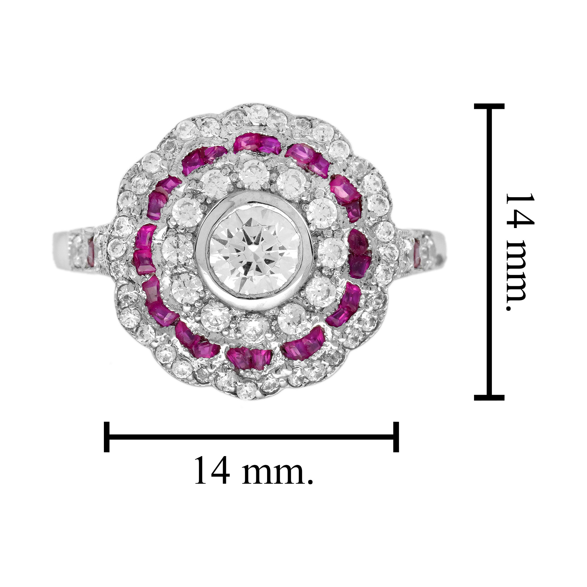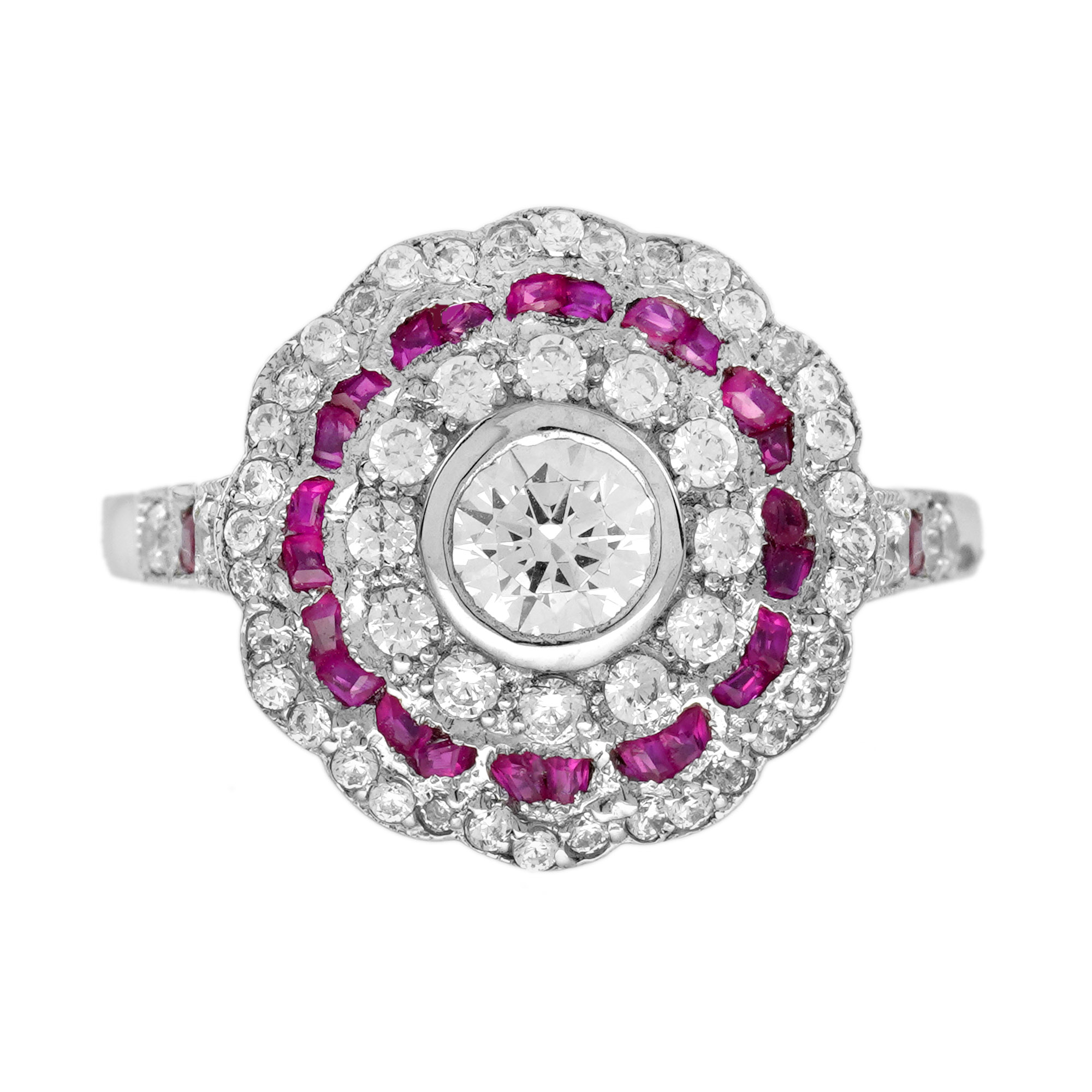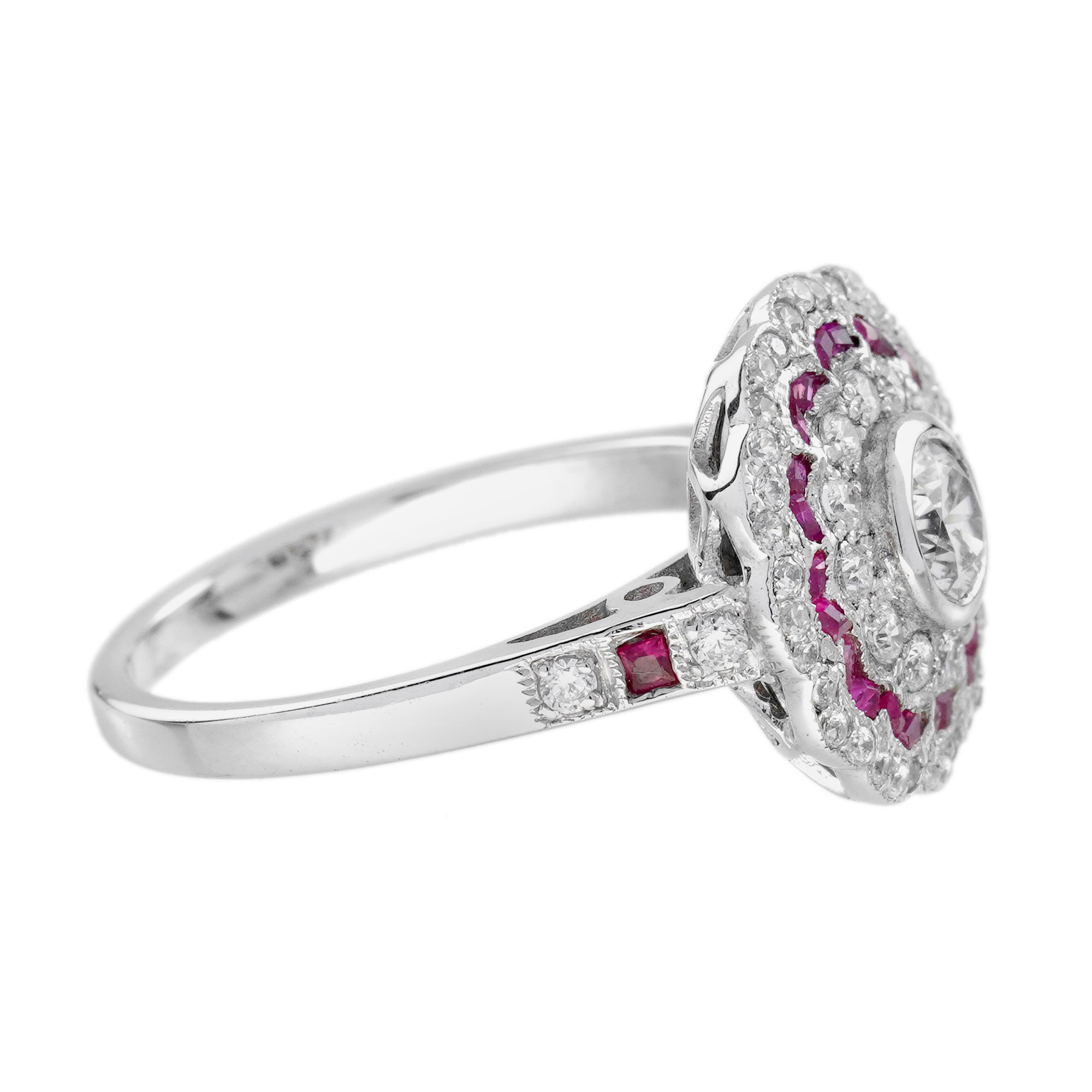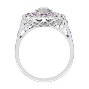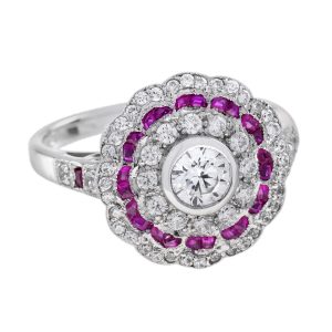 This Art Deco style Diamond and Ruby Ring is absolutely divine. It’s fashioned from 18k white gold and centered with 0.35 carat round brilliant cut diamond, set in a lovely openwork surround aglitter with French cut rubies and diamonds. The ring would make a lovely Art Deco style engagement ring but equally it’s a perfect for every-day wear too.