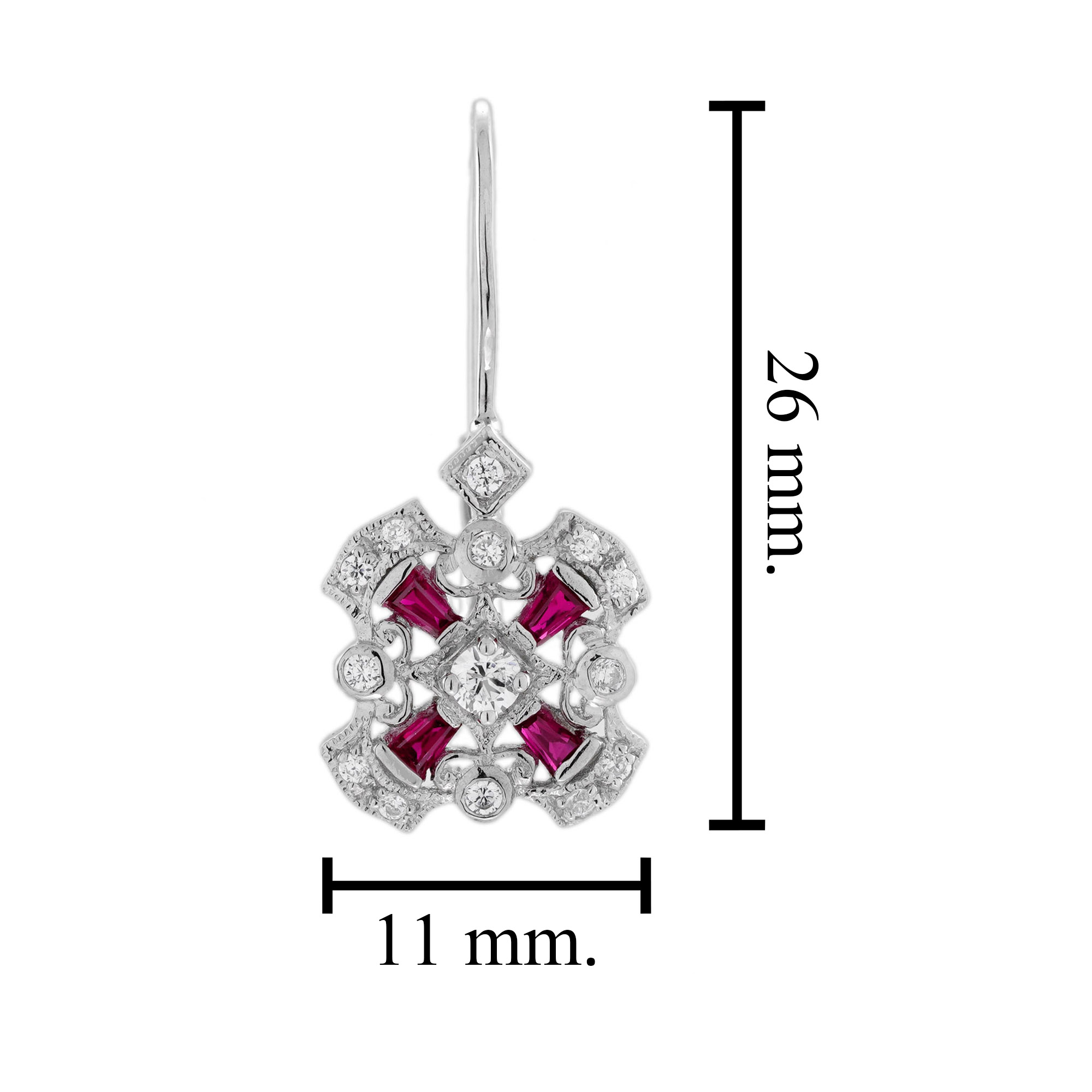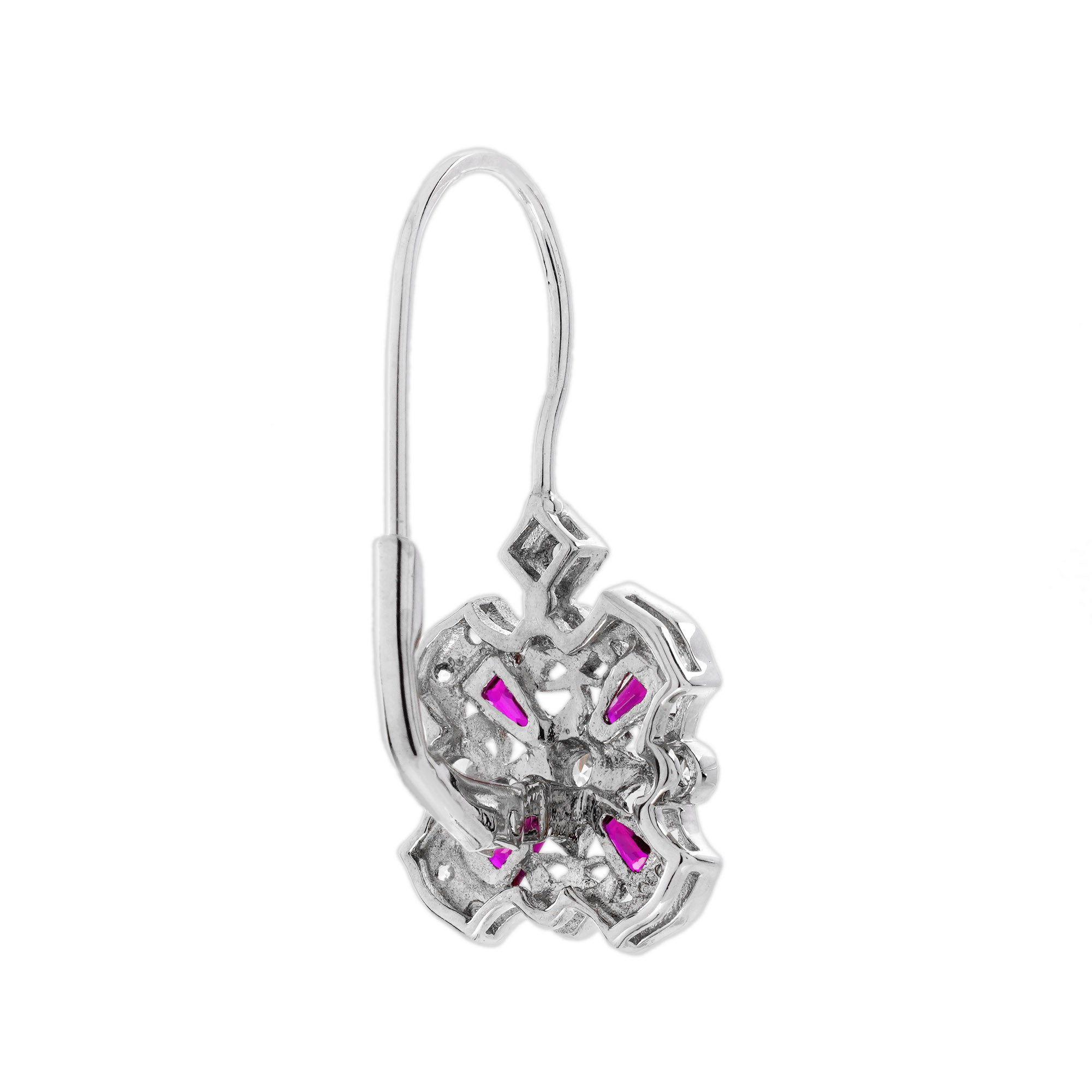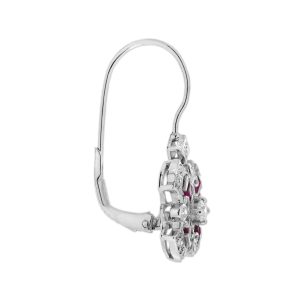 A sparkling diamond floral centerpiece, with vivid rubies adorning each of the four corners. The bold contrast between the brilliant diamonds and rich red rubies creates a striking antique-inspired look. With their graceful leverback design and timeless Art Deco charm, these earrings are perfect for adding a touch of elegance and color to any special occasion.