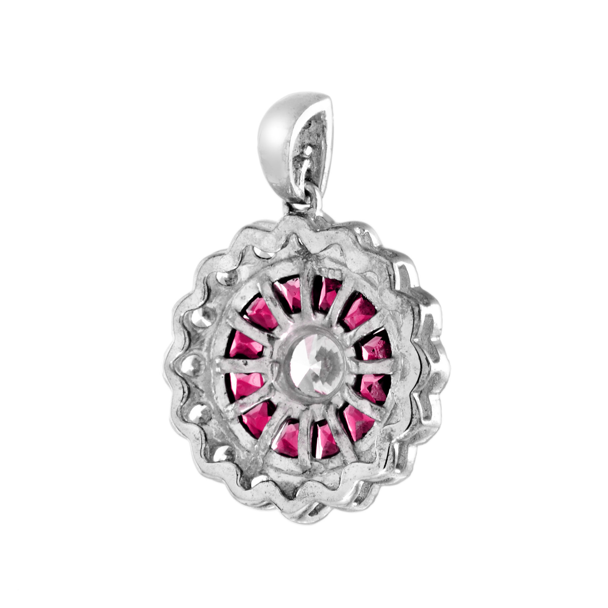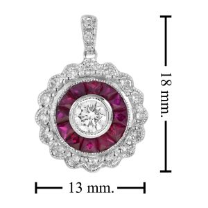 A glamorous pair of Art Deco-inspired target pendant bezel set with a round brilliant cut diamond in the center. The diamond weighs approx. 0.1 carat and its haloed by French cut rubies and further diamonds set in gold with millgrain edging.