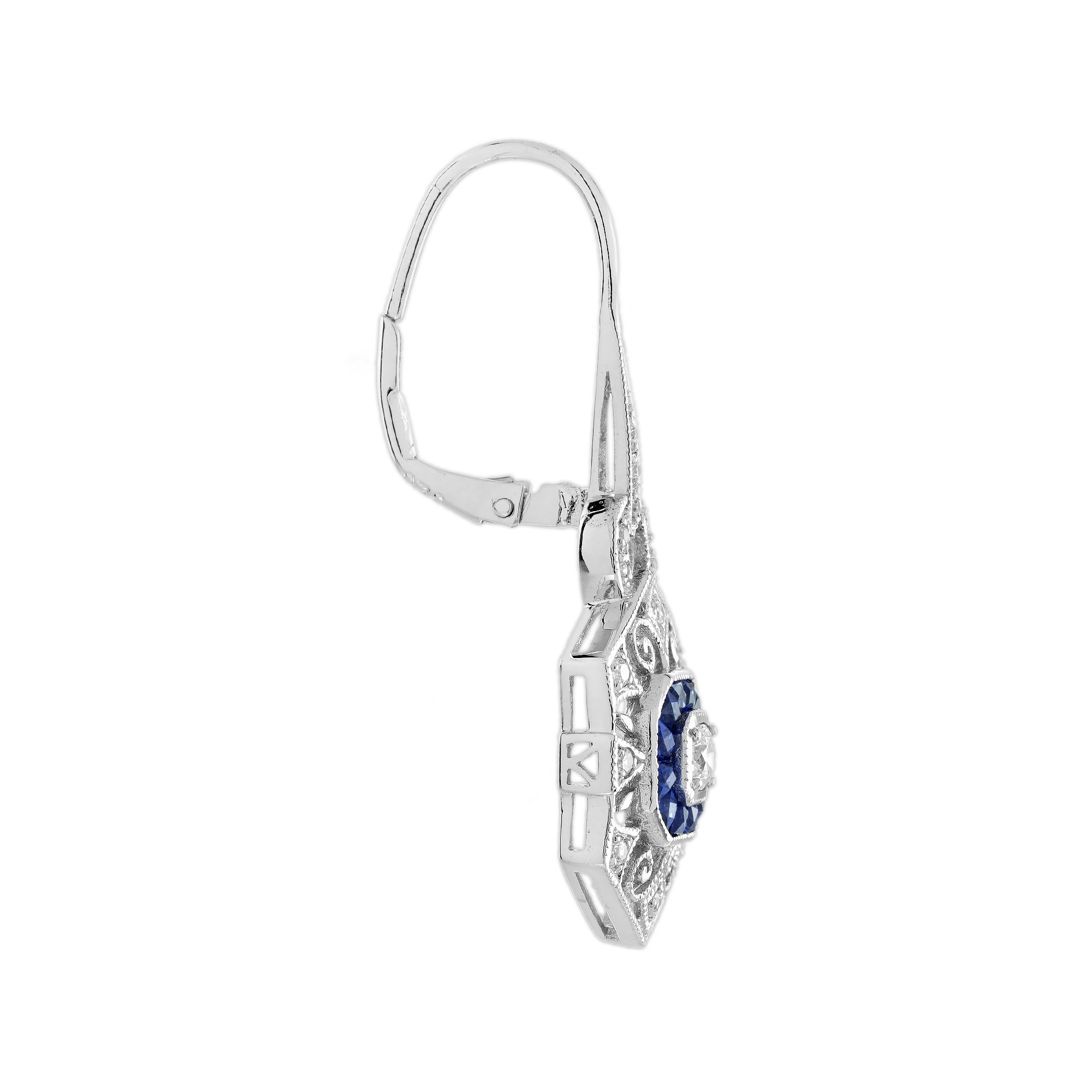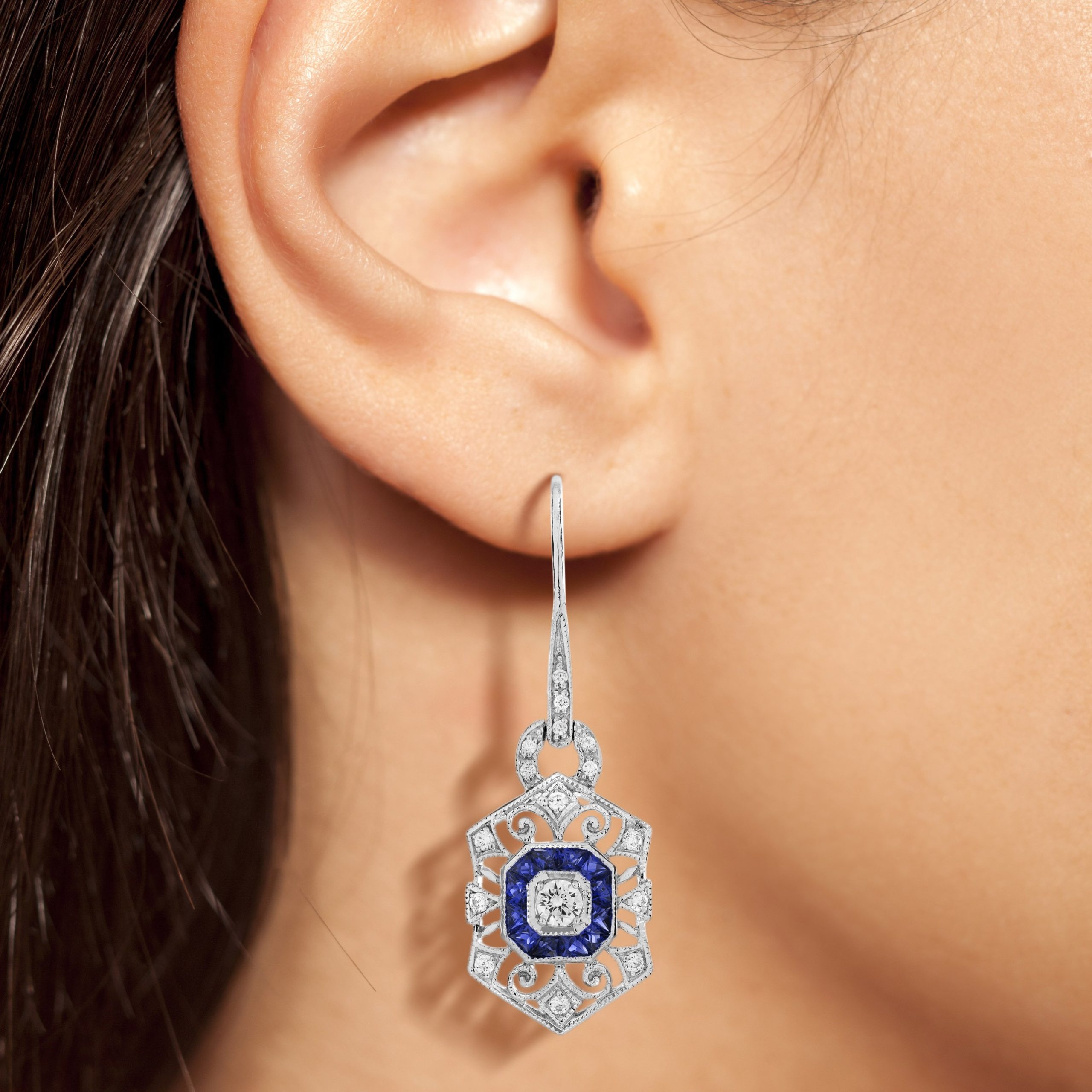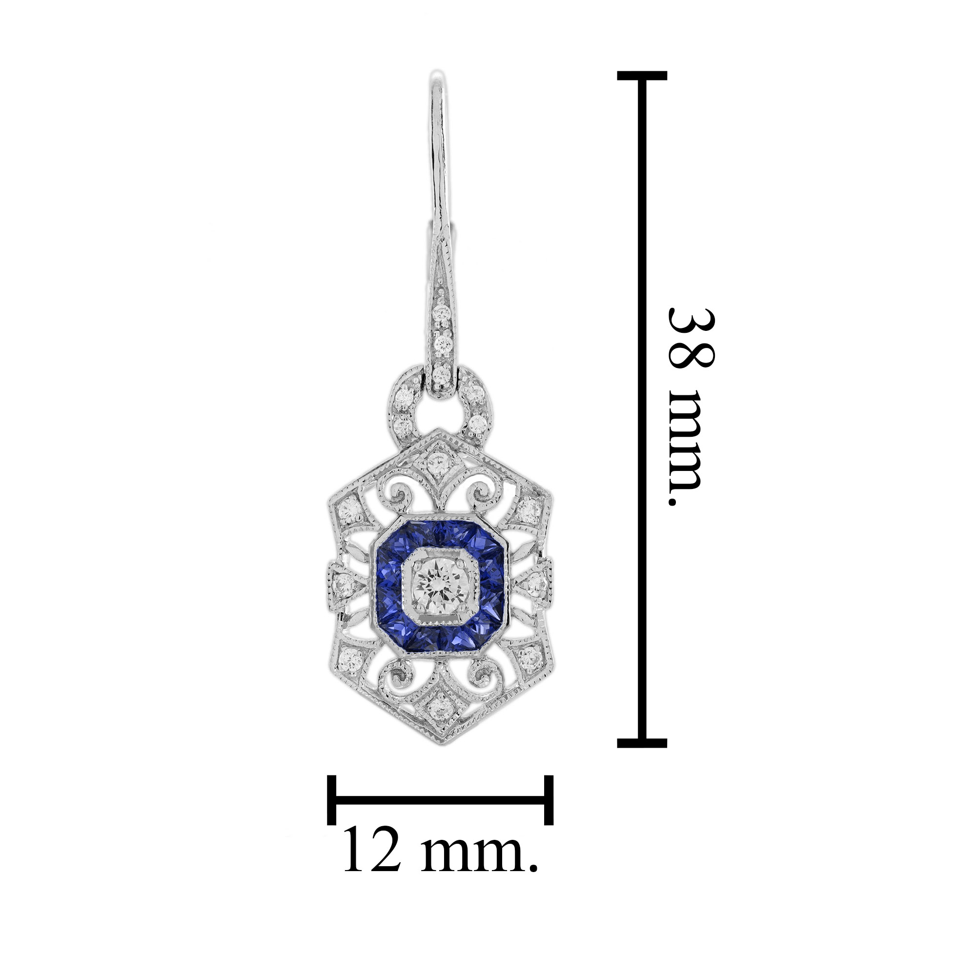 Elevate your elegance with this stunning Diamond and Sapphire Art Deco Jewelry Set. Featuring a brilliant diamond and vivid blue sapphires, the ring’s sleek design exudes timeless sophistication. The matching drop earrings with geometric detailing add a touch of vintage glamour, perfect for any special occasion. Crafted in white gold, this set combines luxury, artistry, and sparkle for an unforgettable statement. Make a lasting impression with this exquisite Art Deco masterpiece.