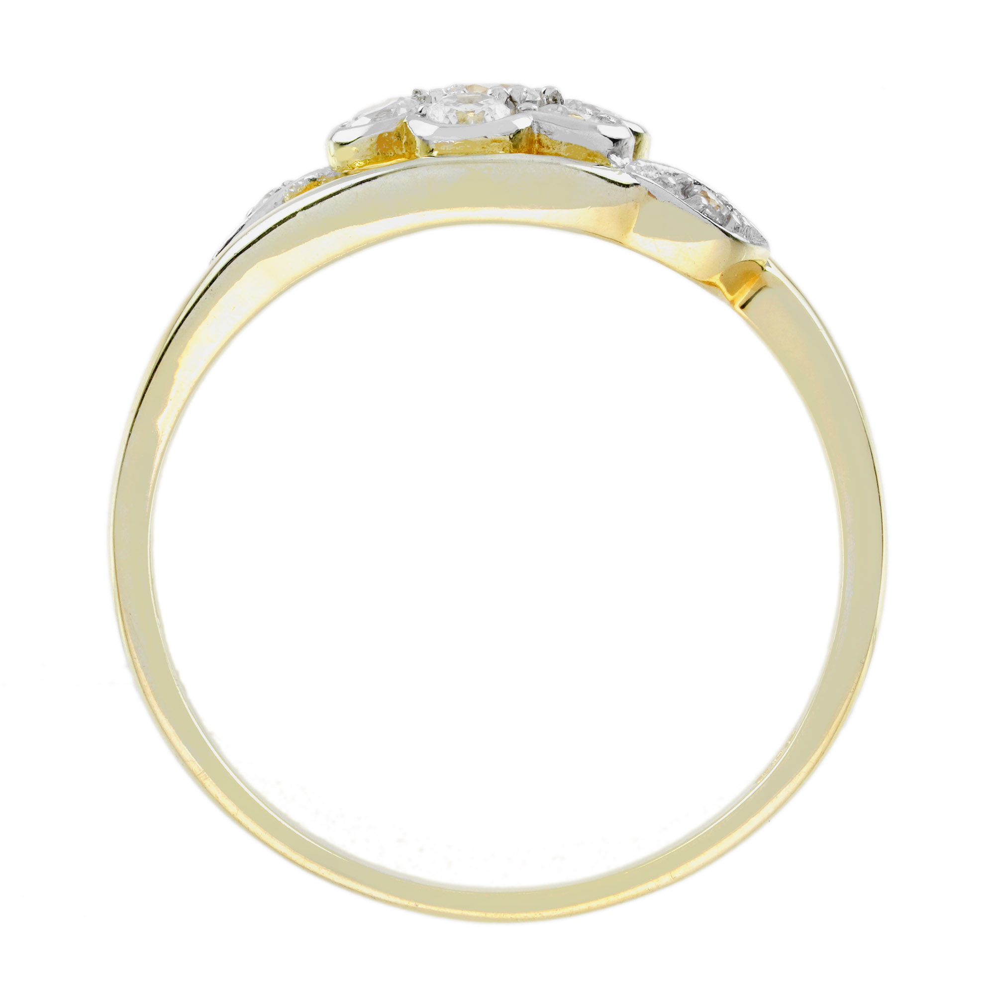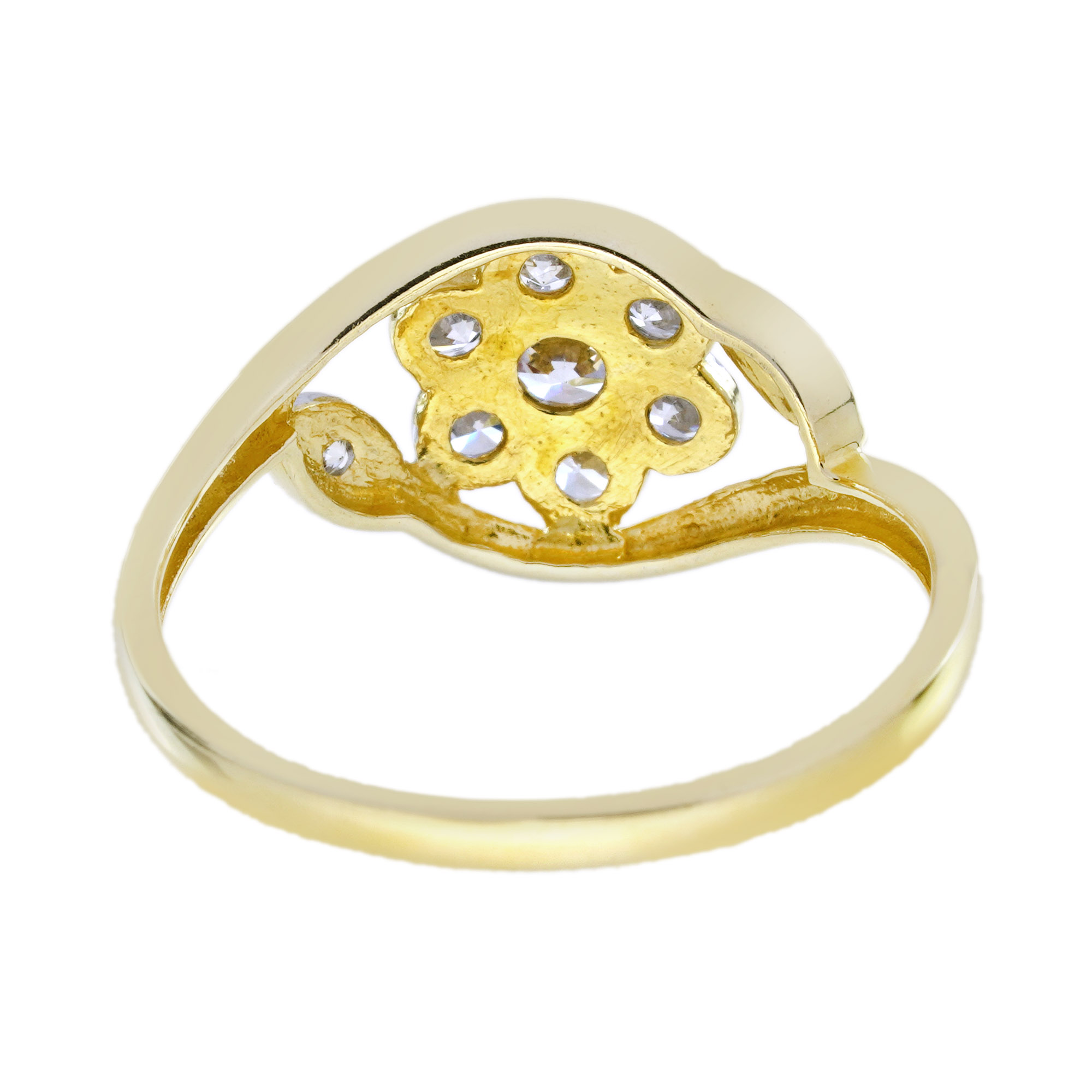 Antique style diamond engagement ring in a daisy flower design. A six petalled flower is set with diamonds in each petal shape with center diamond, approximately total 0.10 carat. On either side of the daisy flower is a leaf shape which is set with a small glittering diamond. The diamonds are set into white and yellow gold band curves around the flower. Its versatility and charm make it an ideal choice for any occasion.
