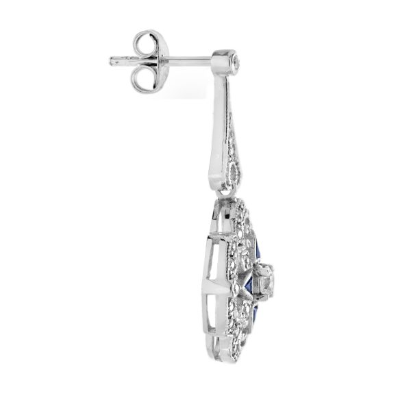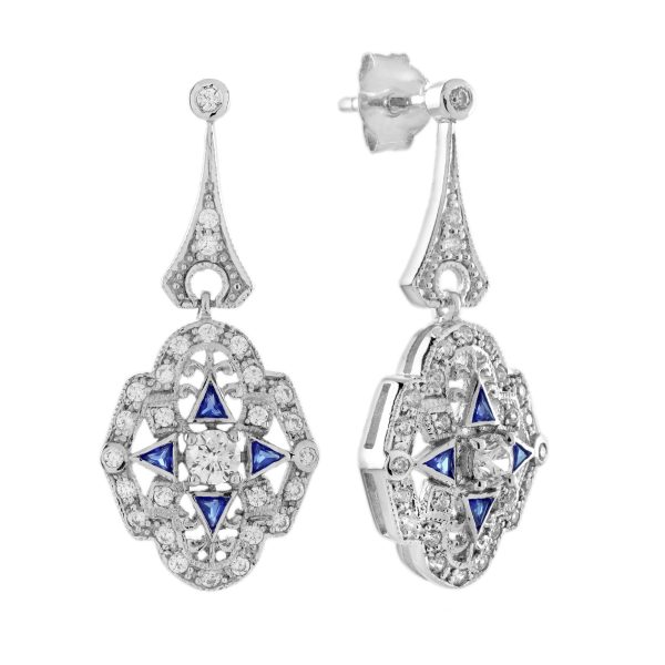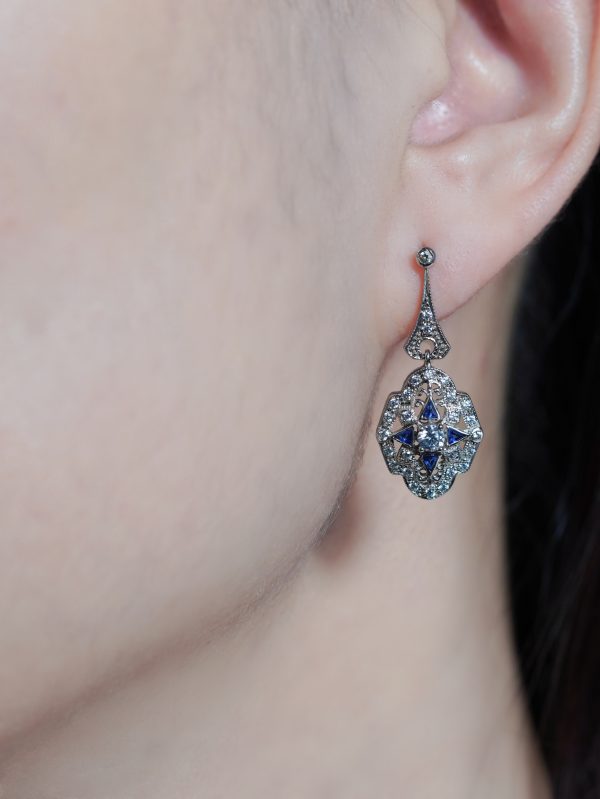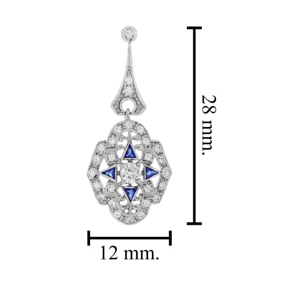 Inspired by the refined beauty of floral motifs, this Art Deco design features a round brilliant diamond at the center, surrounded by triangle-cut French sapphires arranged as delicate petals. The floral shape is defined by sparkling diamond accents, creating a striking balance of color, symmetry, and vintage charm.