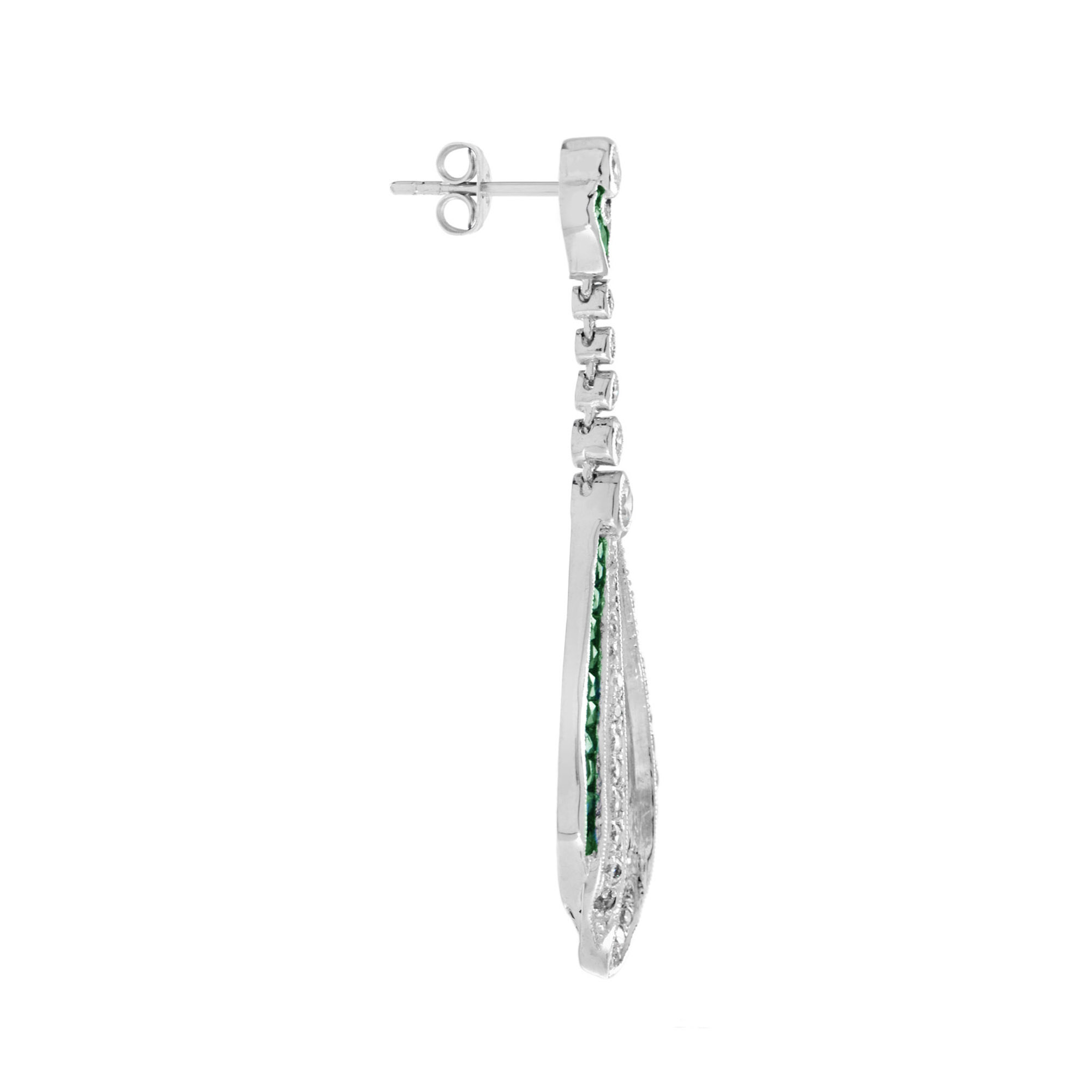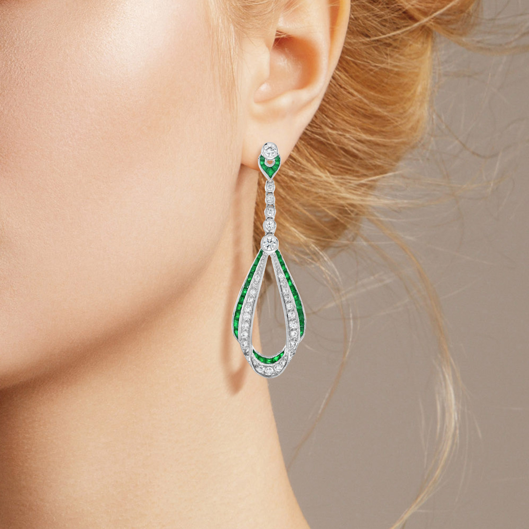 These Art Deco style drop earrings are absolutely stunning, extraordinary. Over 5 carats of vivid and exceptional emeralds border the edge of earrings. And 0.89 carats of fine diamonds. Artful and precise combine with masterful stone setting exemplifying the quality craftsmanship.