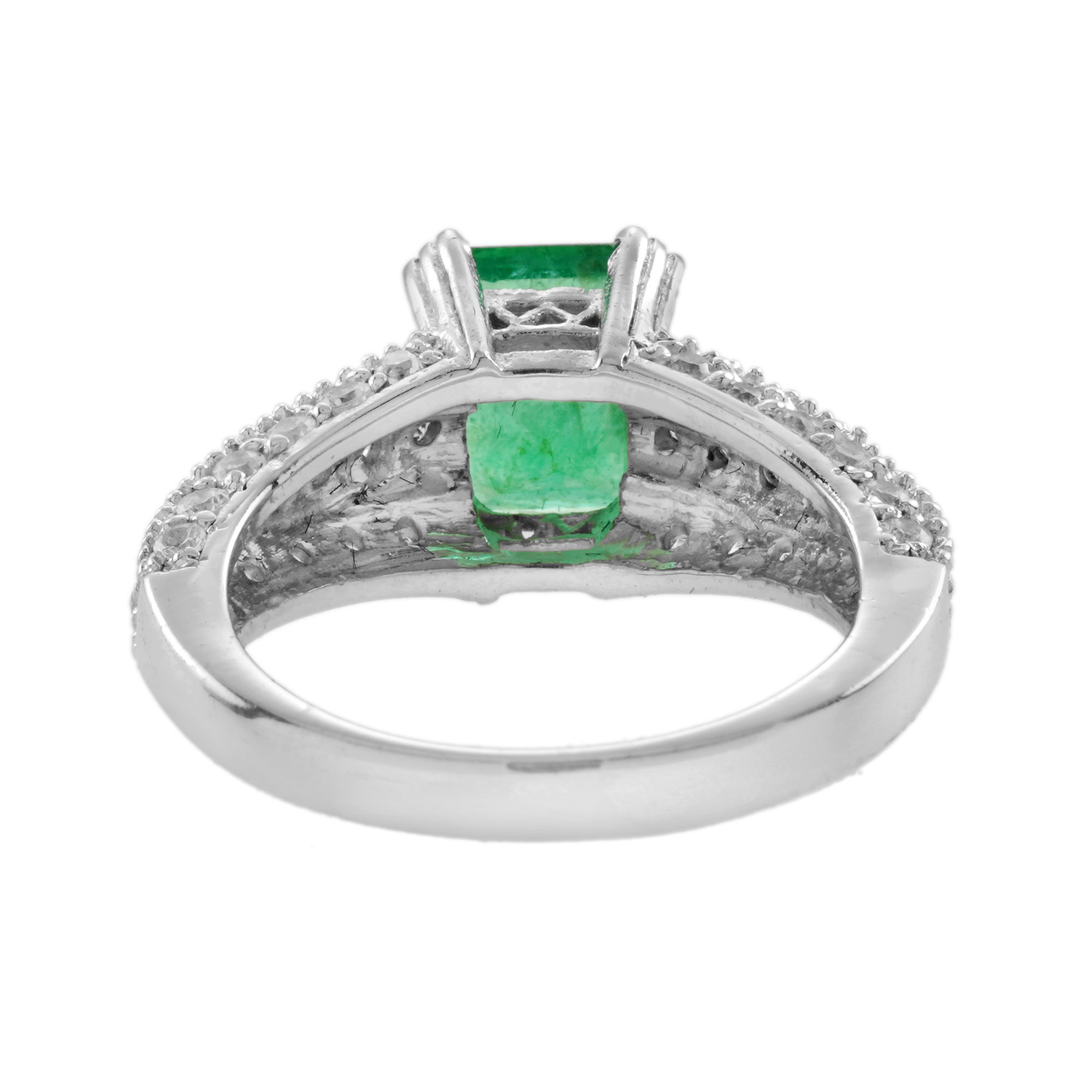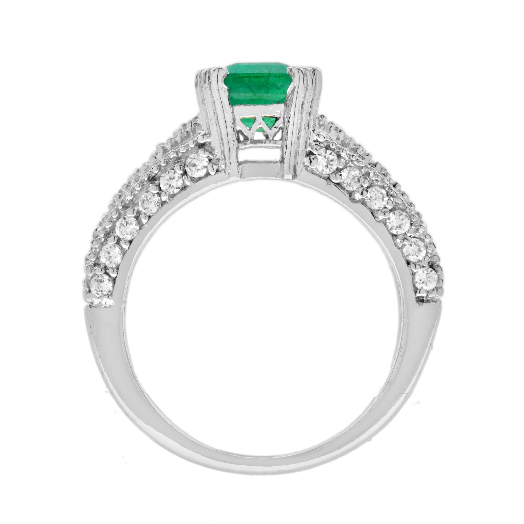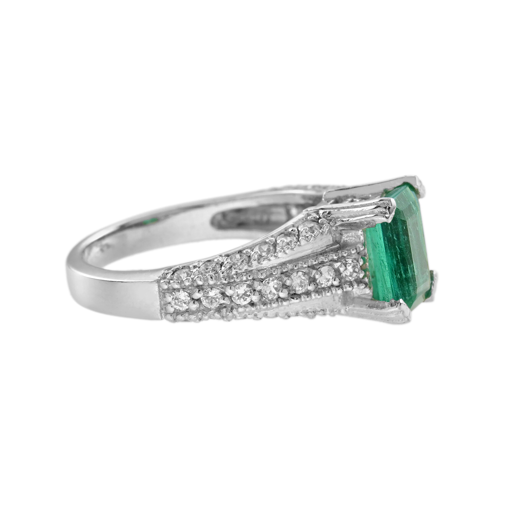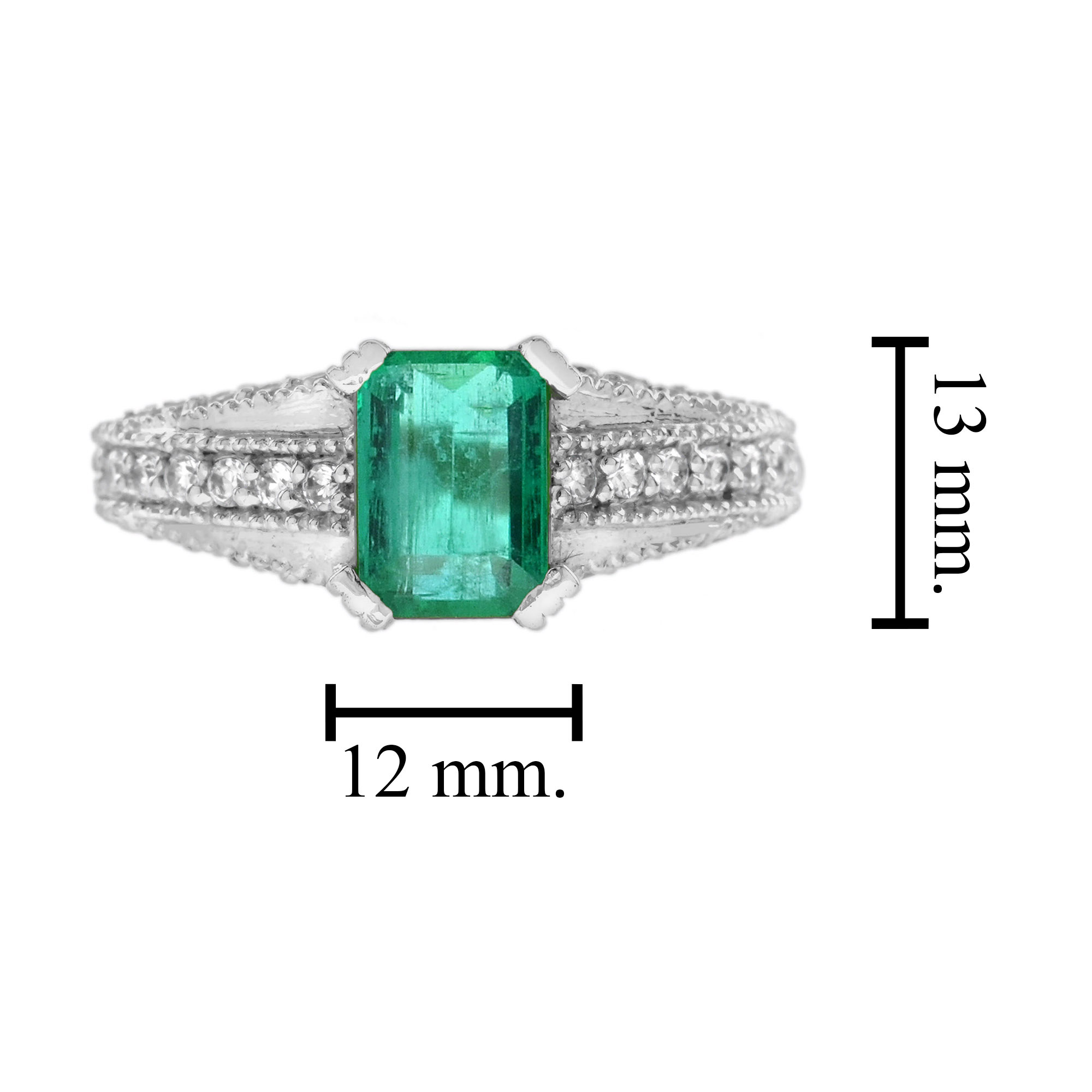 A lovely Art Deco style Emerald and Diamond Ring. The Emerald is a lovely vibrant green color, measures 7 x 5 mm., and is emerald cut with a good overall color and clarity. The emerald weighs 1 carat and set with four prongs with diamonds lines on the shoulders. The ring is sophisticated and eye catching.