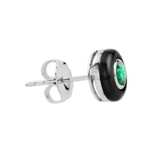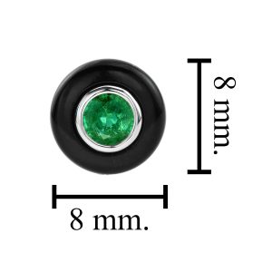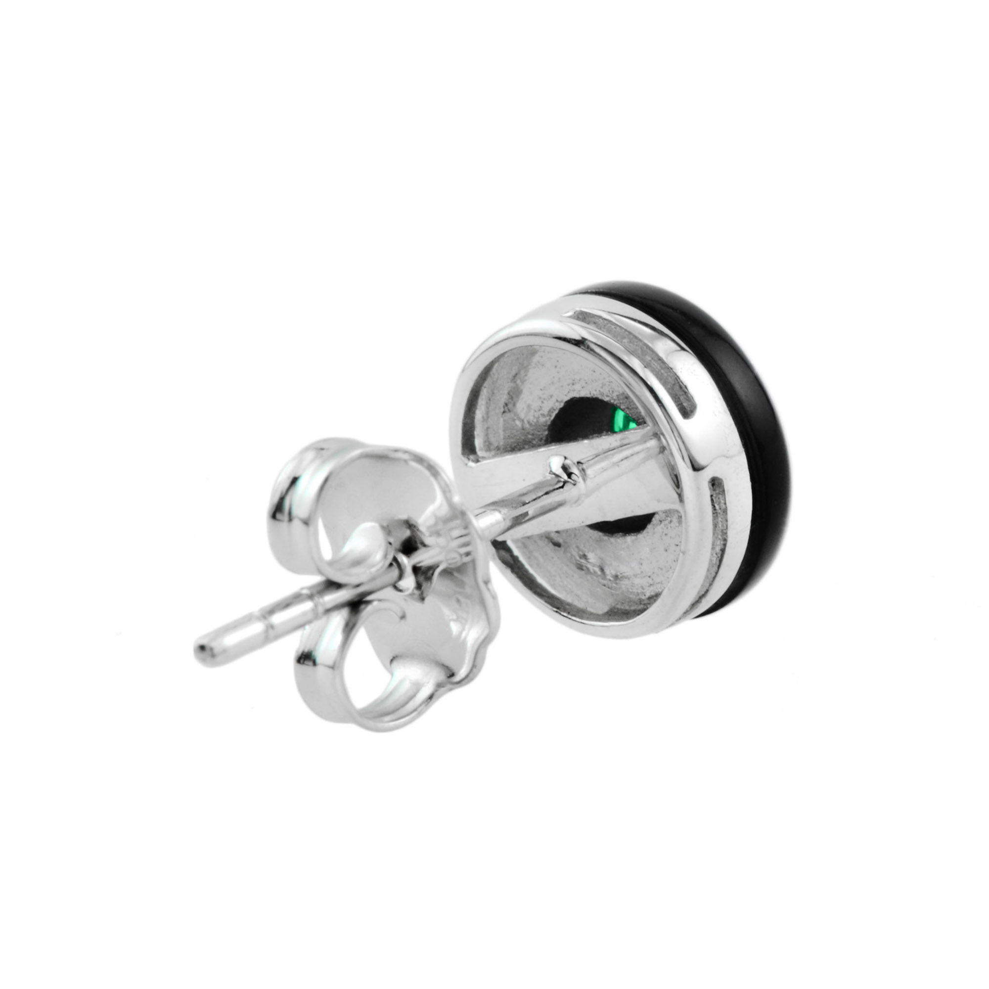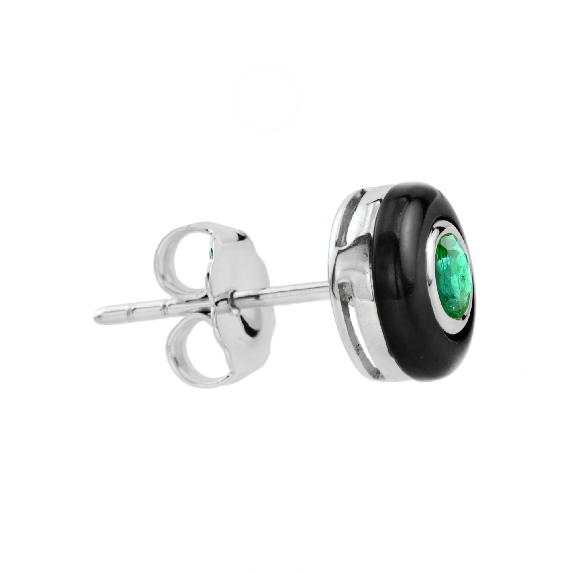 These Art-Deco stud earrings are completely spectacular! The onyx is a specialty cut to surround the excellent round center vibrant green emerald, which is in a thin bezel. Crafted in 14k white gold. Very versatile, can be worn with a pair of jeans or an evening dress.
