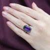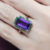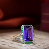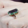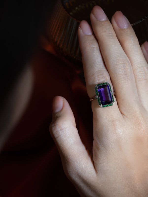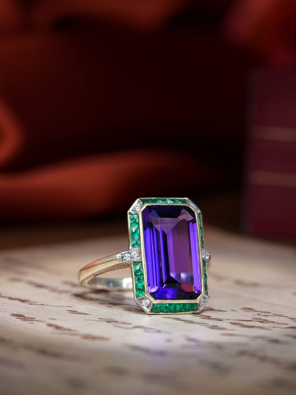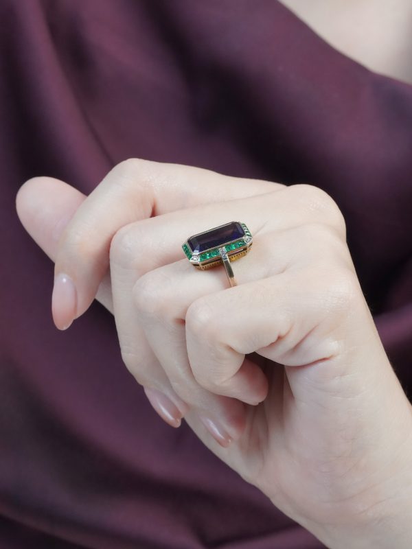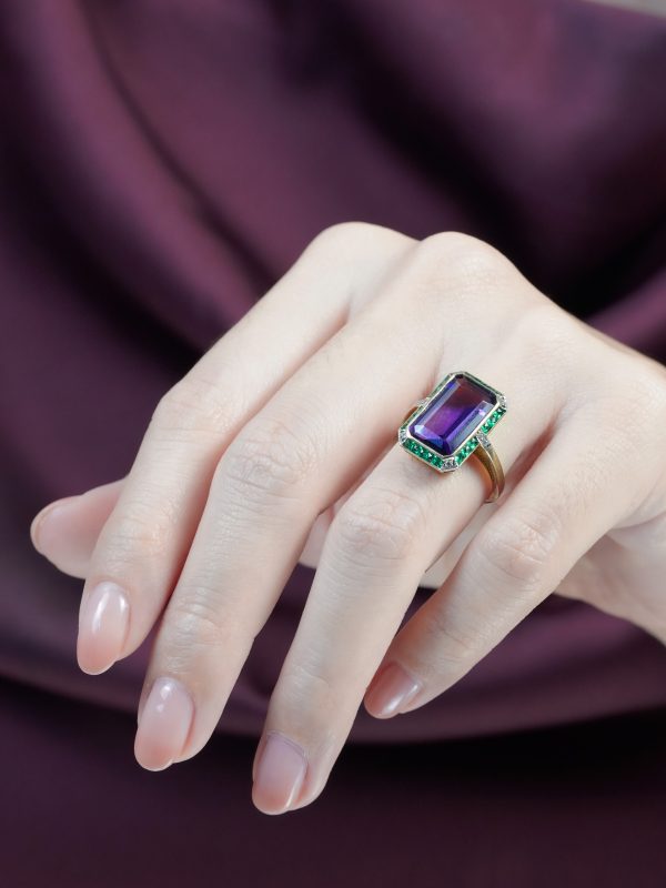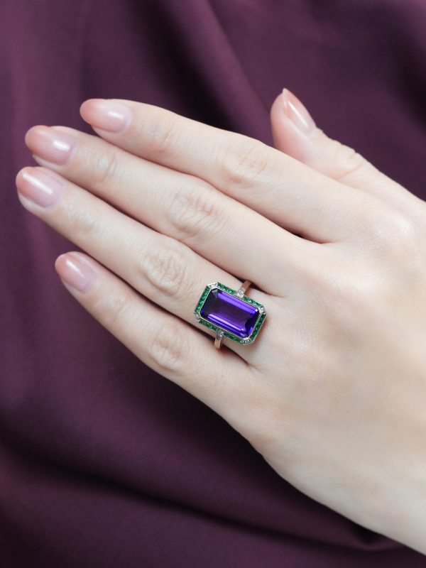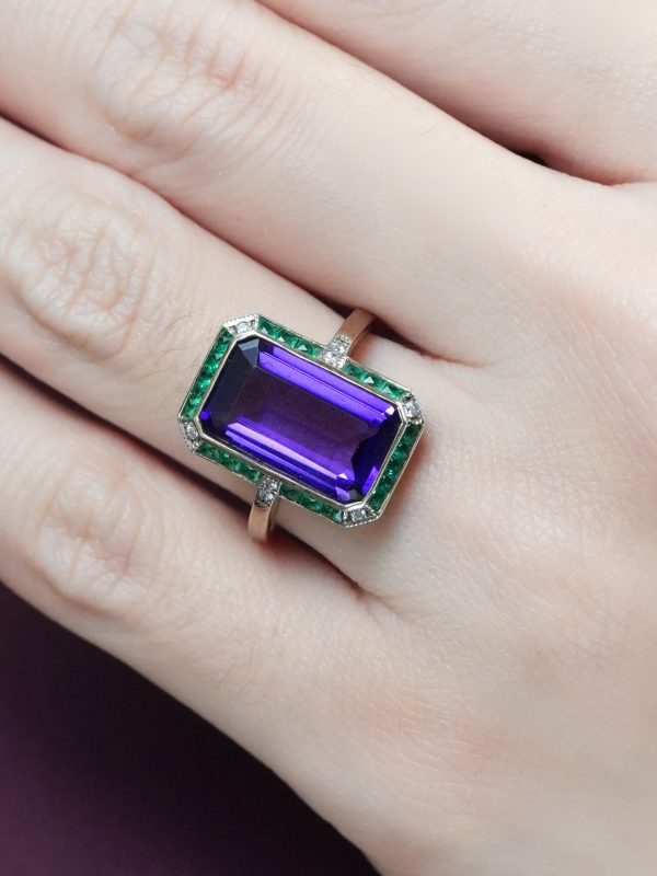 An Art Deco inspired yellow gold Amethyst with emerald and diamond ring. The ring consists of one central emerald cut amethyst surrounded by French cut emeralds and round cut diamonds.