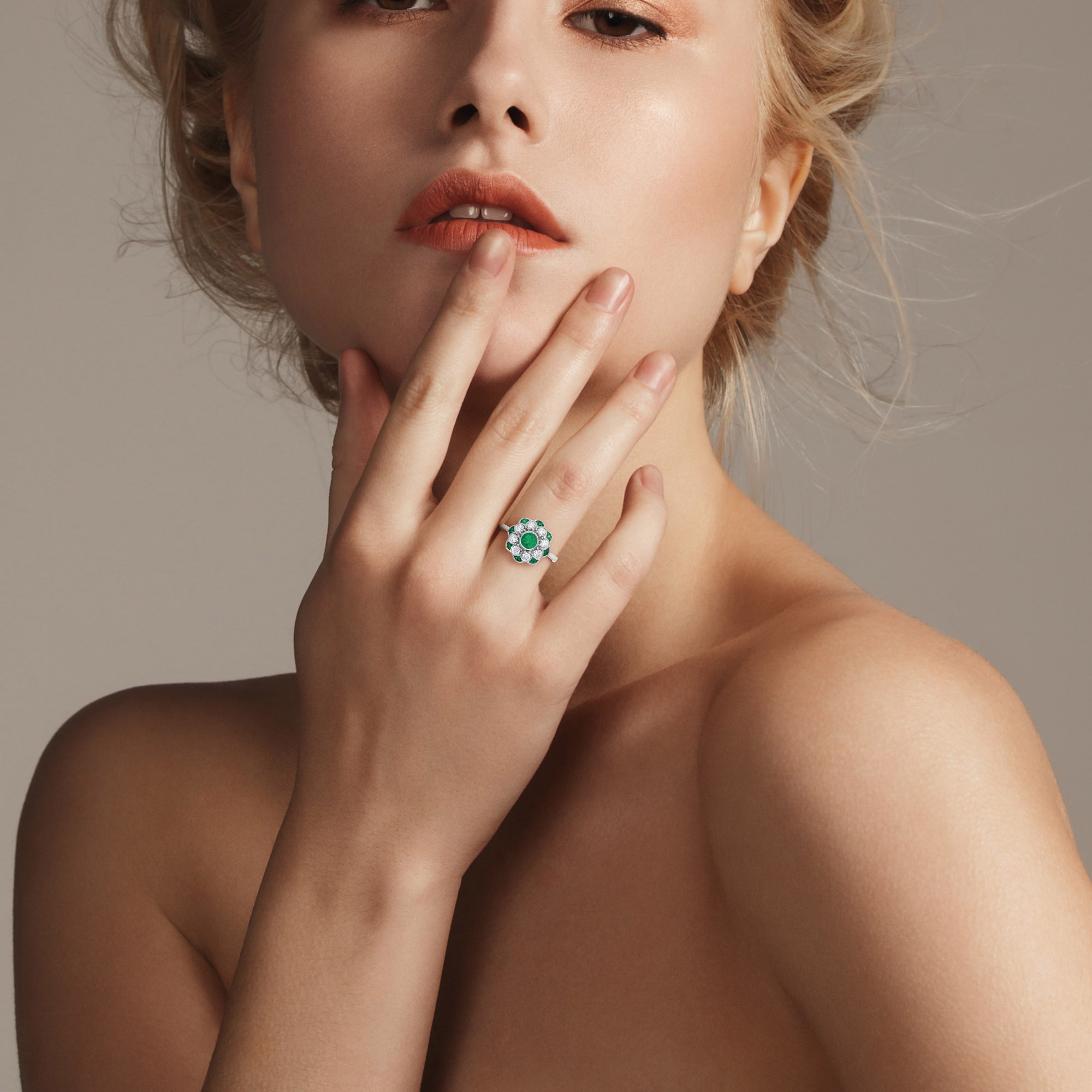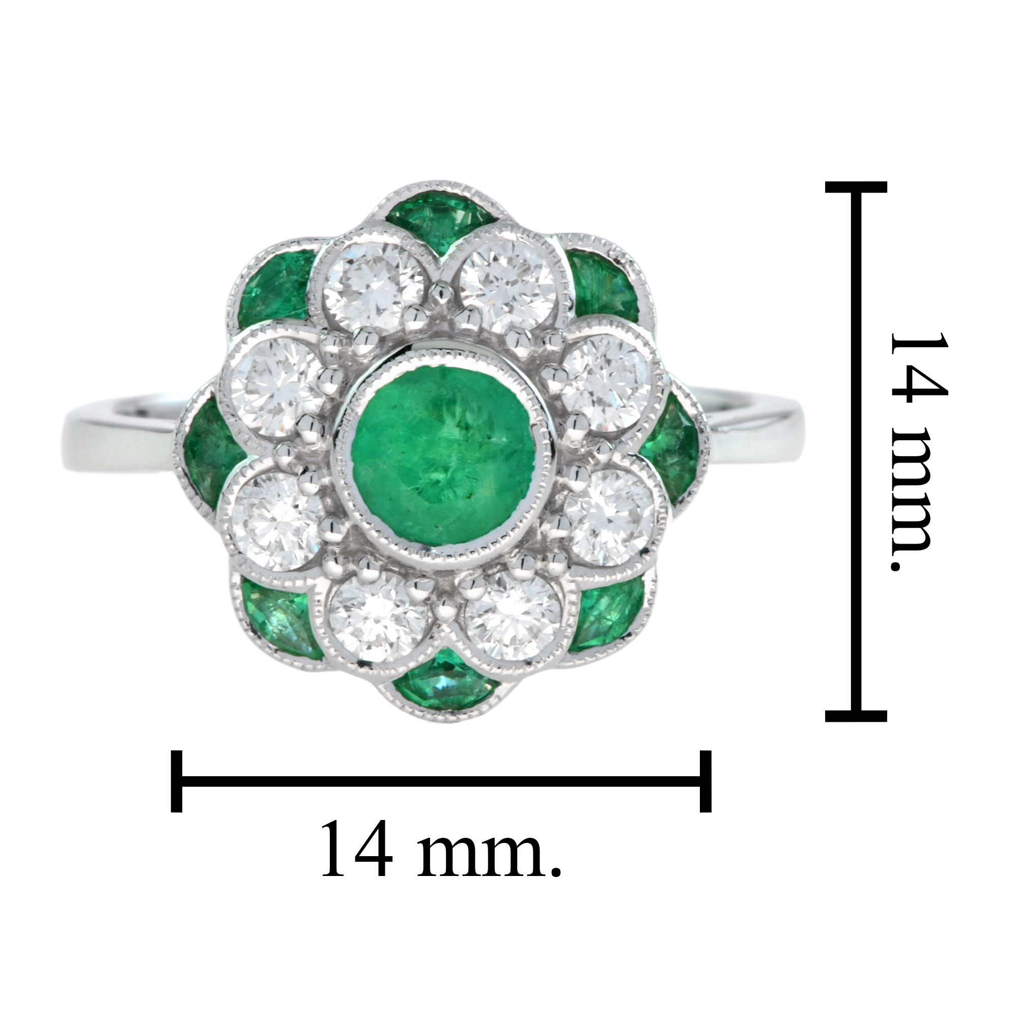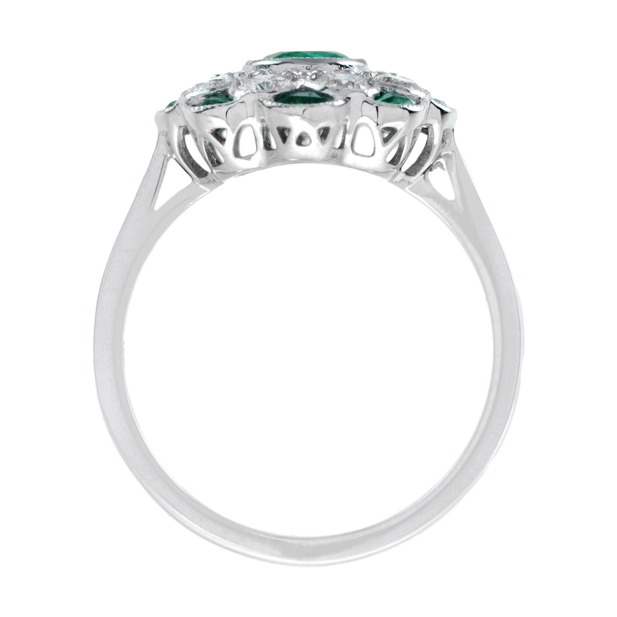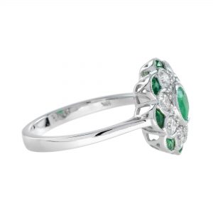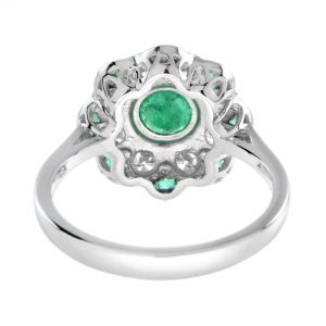 A floral-style engagement ring centered with a vivid emerald, radiating natural elegance and depth. Diamonds surround the center stone like delicate flower petals, adding luminous sparkle and refined contrast. A second layer of emeralds forms petal-like shapes around the design, enhancing its rich, botanical beauty. Creative and romantic, this ring captures timeless floral charm with a graceful, luxurious presence.