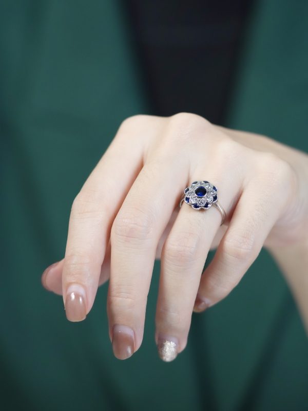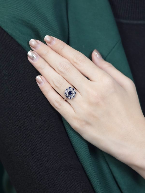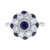 A round blue sapphire at its center, symbolizing elegance and timeless beauty. Surrounding it are dazzling diamonds, gracefully arranged to form delicate flower petals. Additional sapphires are interspersed between the petals, enhancing the floral design with depth and contrast. With its vintage charm and exquisite craftsmanship, this ring is a perfect choice for those who appreciate nature-inspired elegance and classic sophistication.