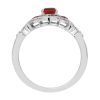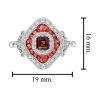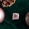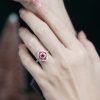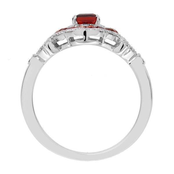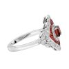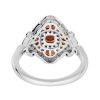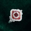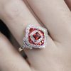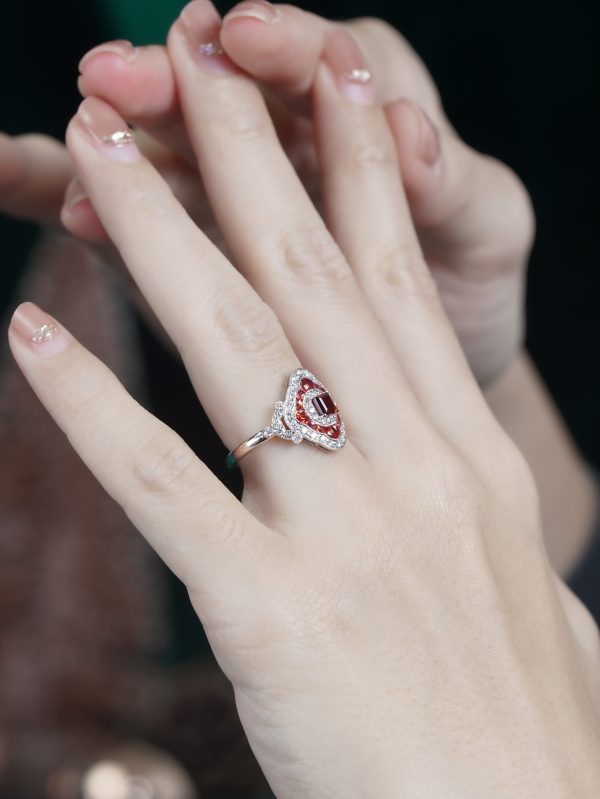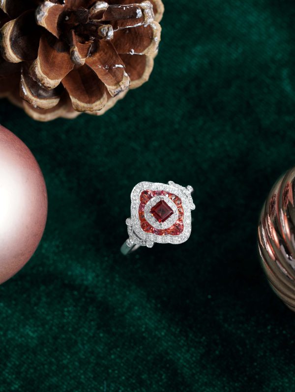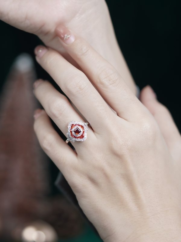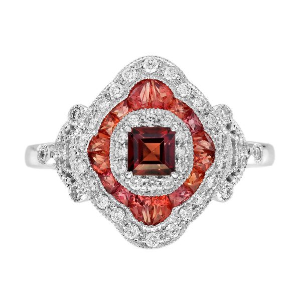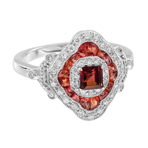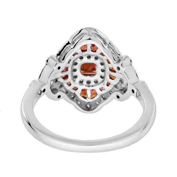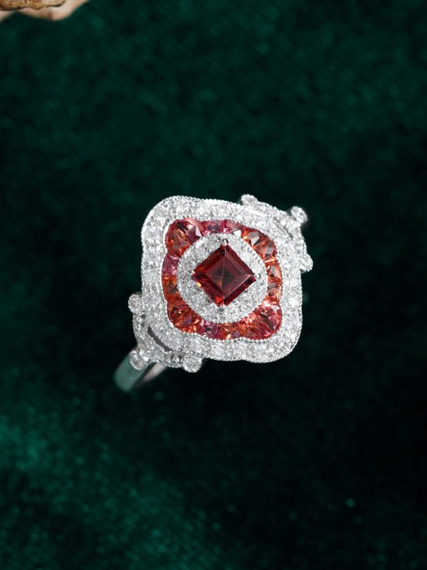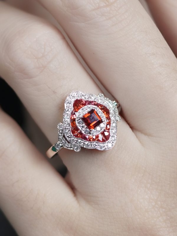 An Art Deco–style engagement ring features a captivating square-cut rhodolite at its center, glowing with rich garnet tones. A halo of sparkling diamonds surrounds the center stone, creating luminous contrast and refined brilliance. Encircling this, a second layer of freeform-cut orange sapphire adds artistic depth and sculptural character. The design is completed with an outer frame of diamonds, enhancing its bold symmetry and elegance. Blending creativity with enduring elegance, this ring captures Art Deco glamour with a striking, layered sophistication.
