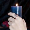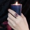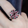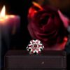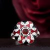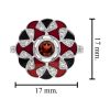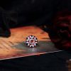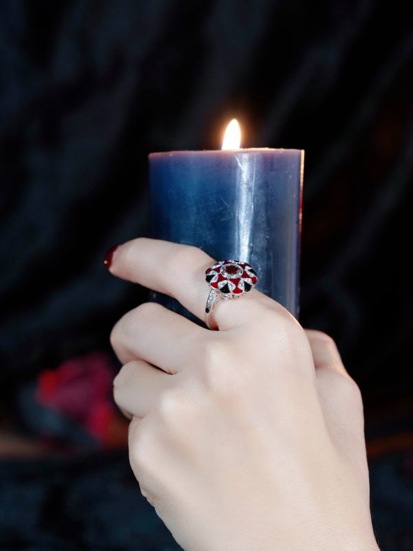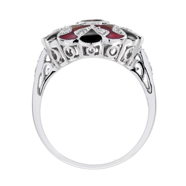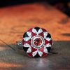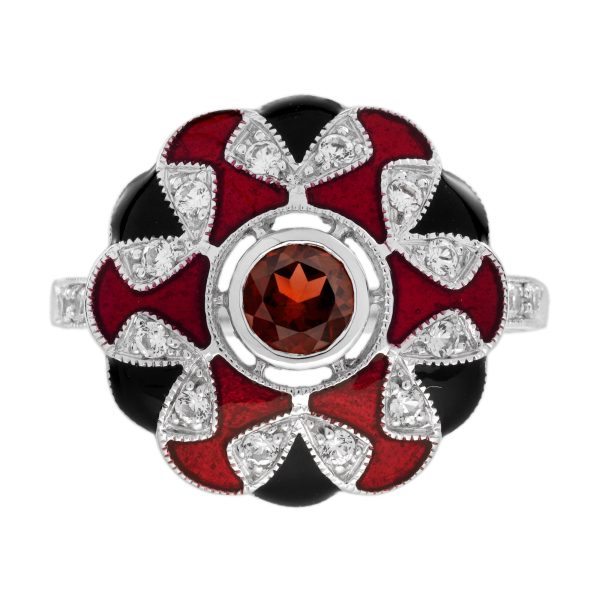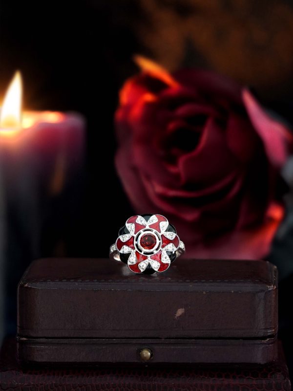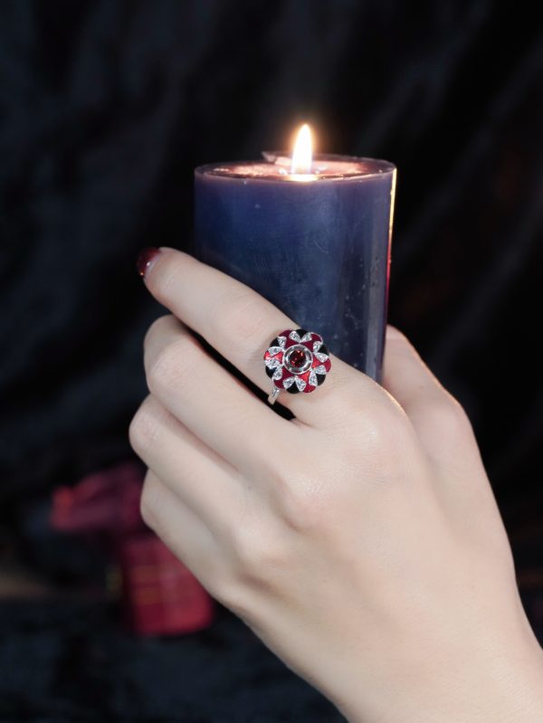 A Masterpiece of color and craftsmanship. A rich round garnet takes center stage, flanked by delicate triangle-cut rubies that add a fiery touch. Surrounding the gem is a halo of luminous white sapphires, accented with intricate enamel detailing that brings vintage flair to life. Bold yet refined, this ring tells a story of passion and individuality. Perfect for the one who desires a love as unique and unforgettable as the design itself.