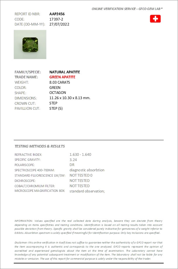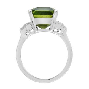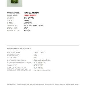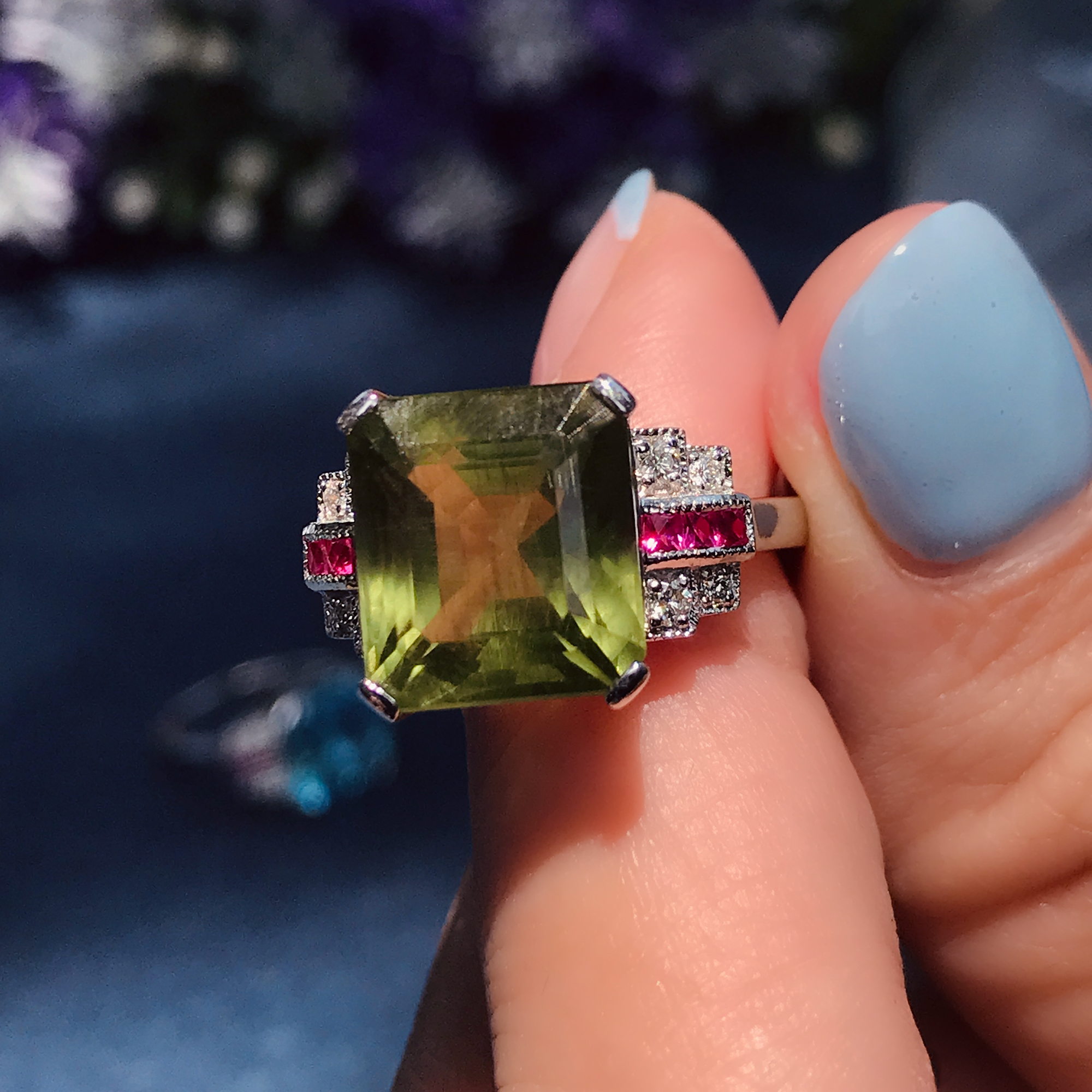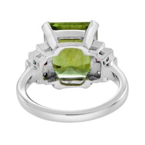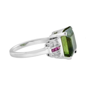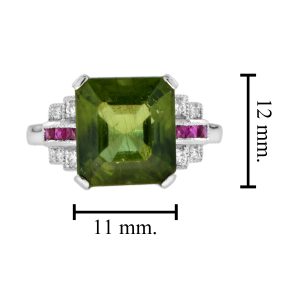 This exceptional chic ring features a green apatite weighing approximately 8.03 carats, flanked at the shoulders with diamonds and pink rubies, all set in 18k white gold. The color combination of deep green and pink is truly attractive.