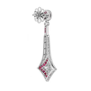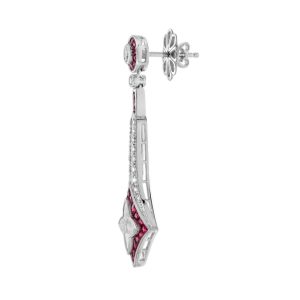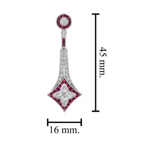 Glamorous diamond and ruby drop earrings which shouts quality and elegance with its superlative design and fine detail. The earrings featuring special cut diamonds illusion set in a lily shape with ruby for the trim, set within millgrain18k white gold setting.