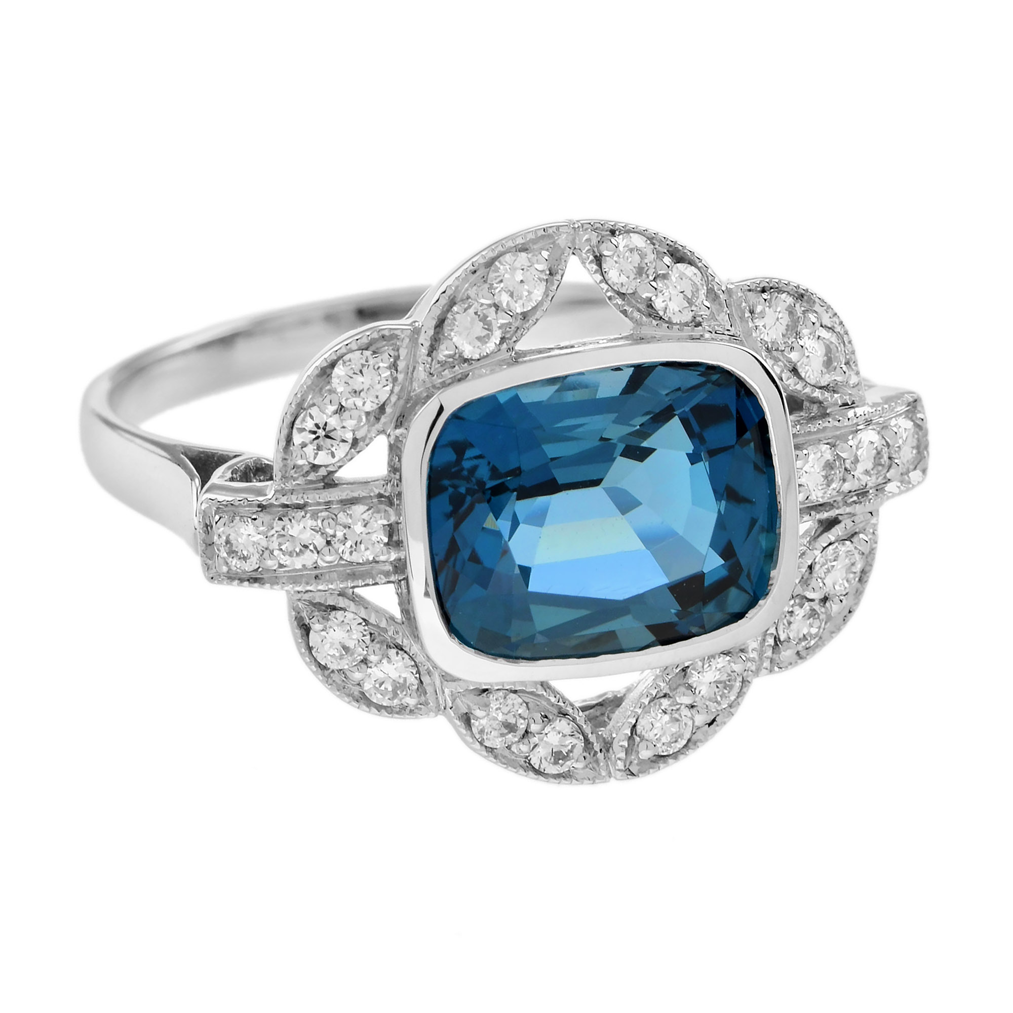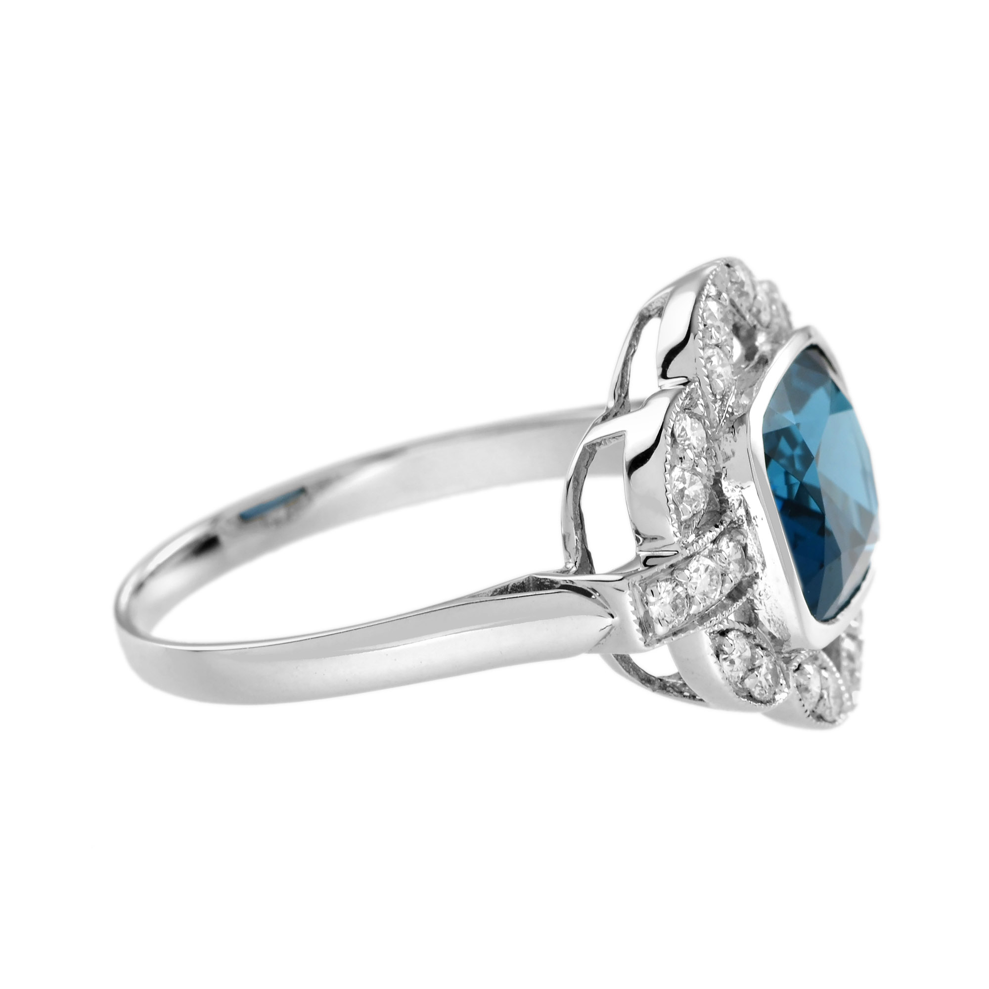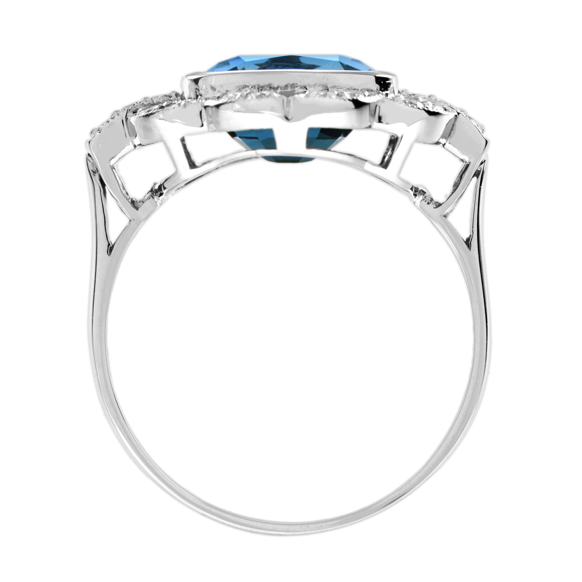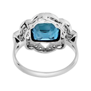 Make a statement with this Art Deco inspired London Blue Topaz Engagement Ring. The emerald cut topaz in the center is accented by shimmering diamonds. This ring, crafted in solid white gold, is perfect for those who appreciate antique and artistic jewelry.