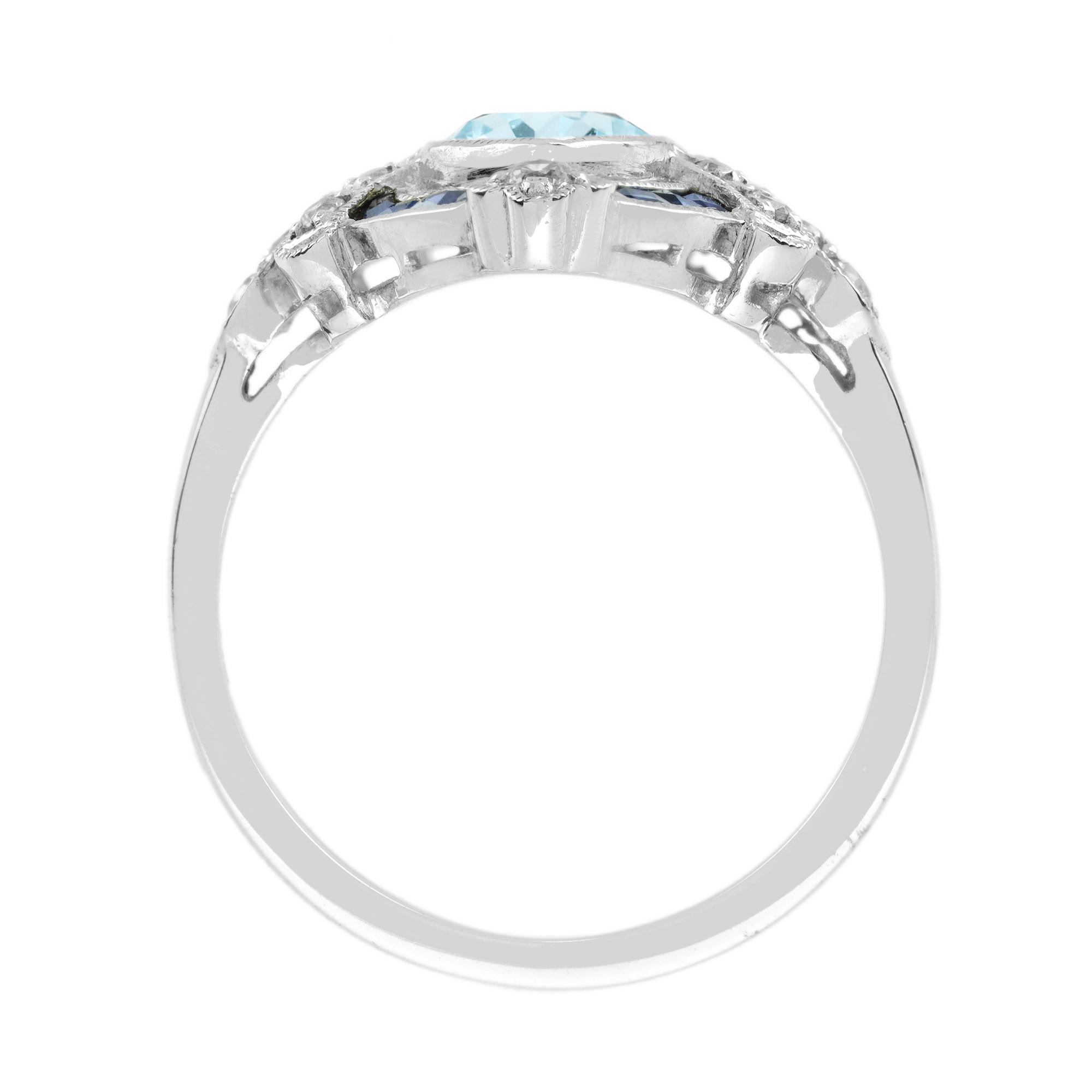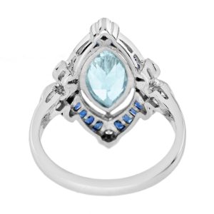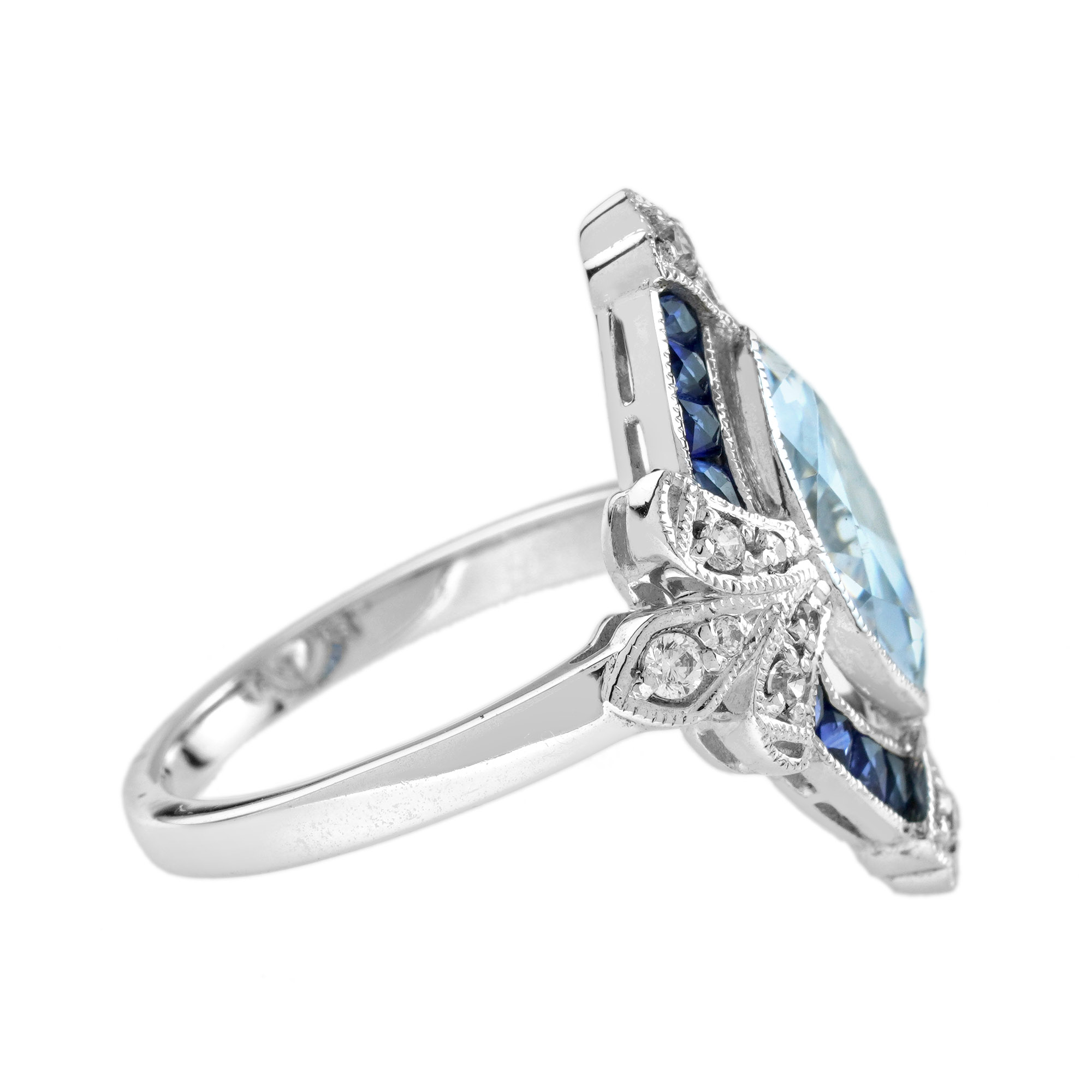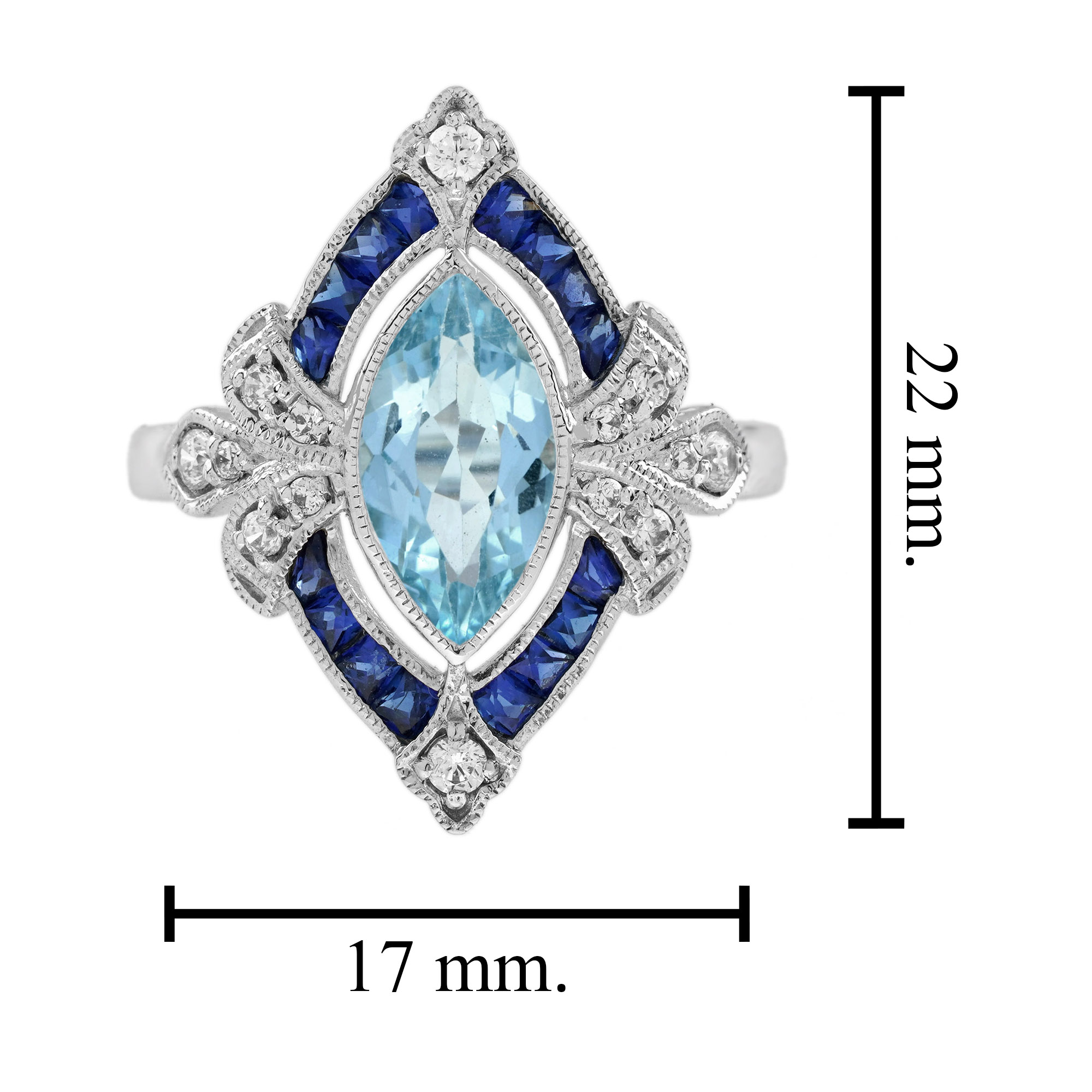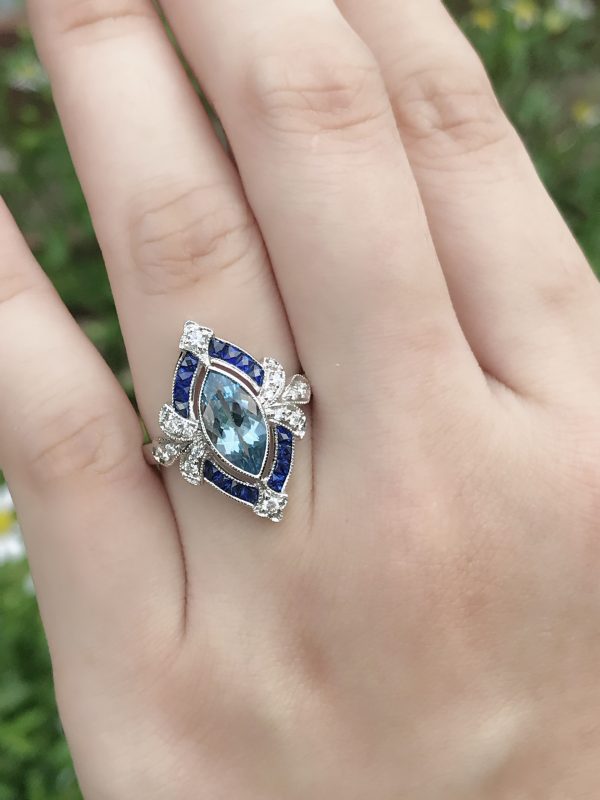 Time to take center stage. This fabulously scintillating and dazzling icy blue 1 carat marquise aquamarine, shimmering around its slender shape with French cut blue sapphire punctuated by diamond-set shoulders. Hand fabricated.