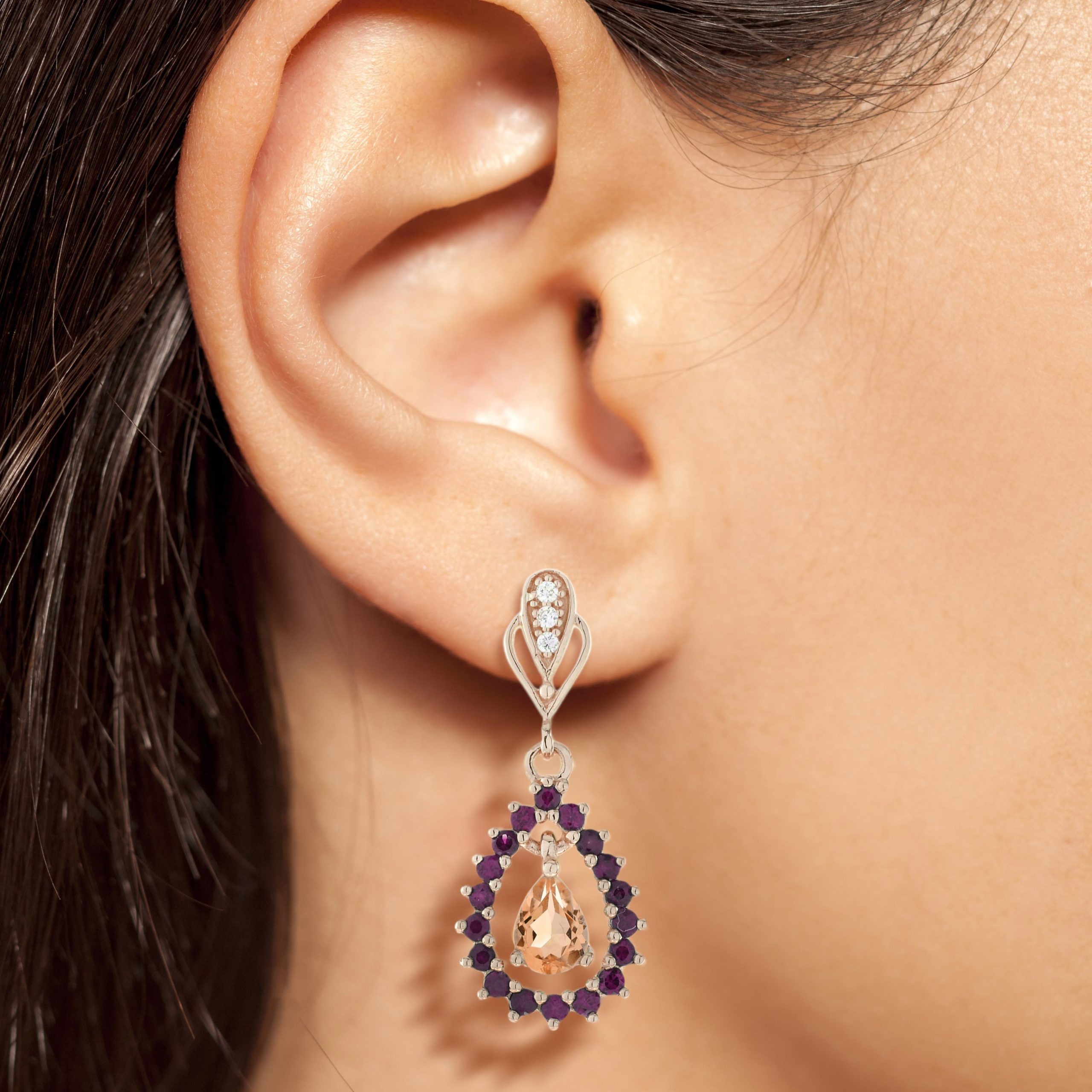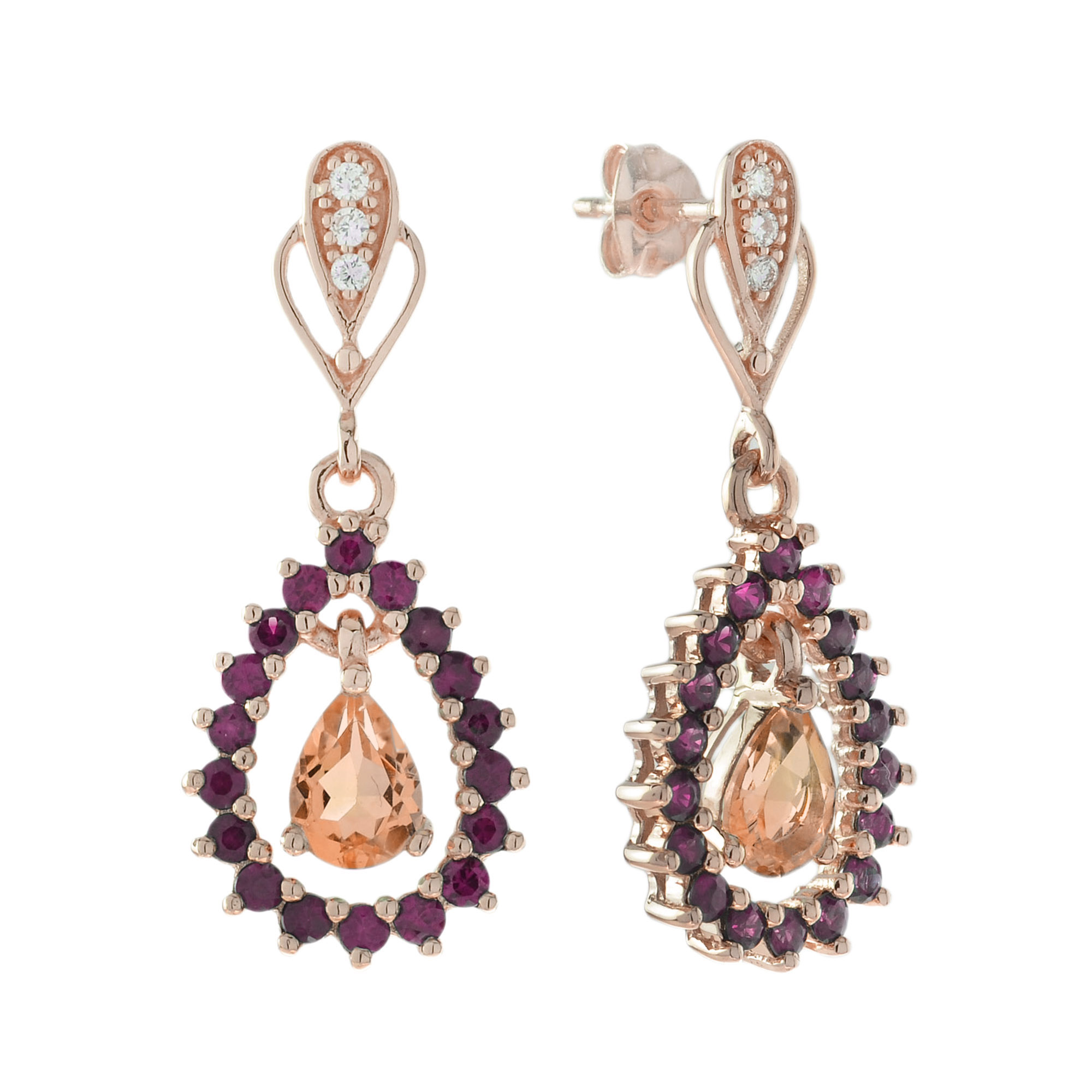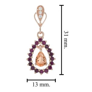 Suspending two pear shaped morganites, accented by rubies openwork frames and stations set with round diamonds. This charming piece is a winsome adornment perfect to mark a milestone occasion.