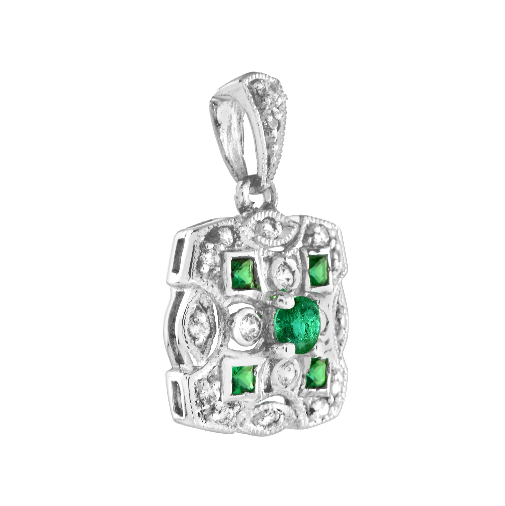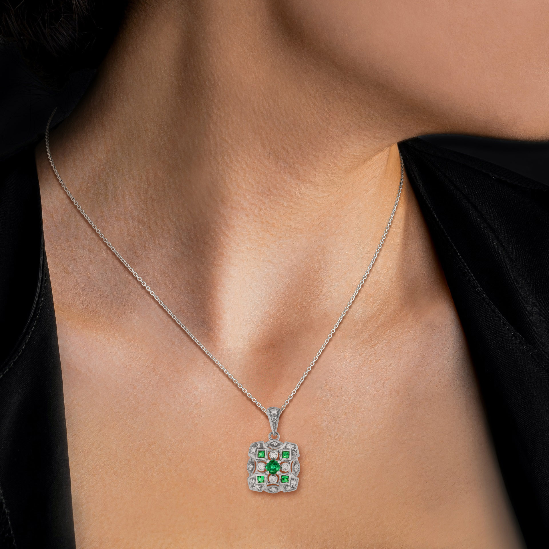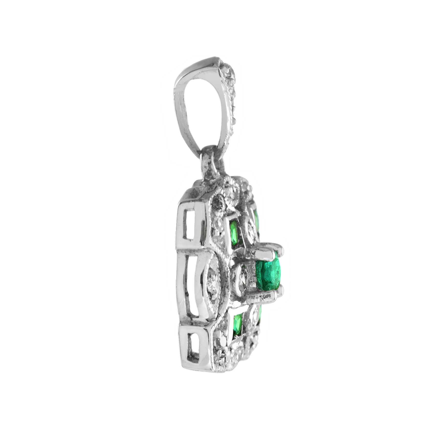 A vivid emerald at the center, beautifully accented by sparkling diamonds set at each of the four corners—top, bottom, left, and right. The balanced, geometric arrangement reflects the refined symmetry of Art Deco design, while the contrast of rich green and bright white stones creates a timeless and elegant statement.