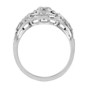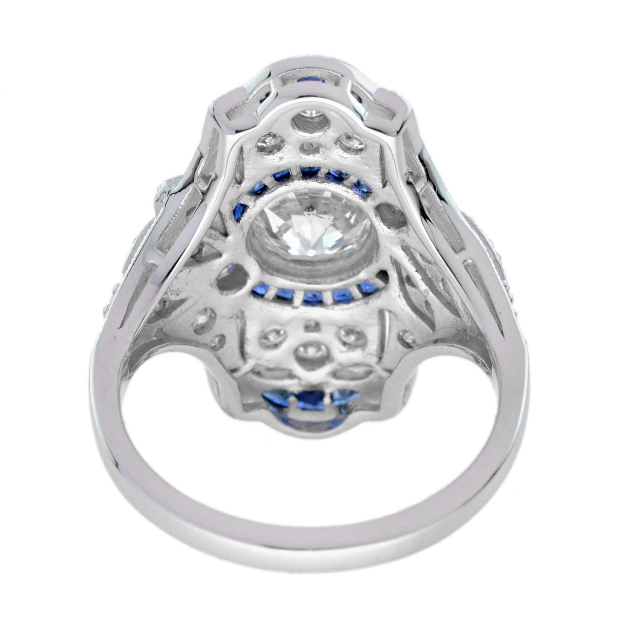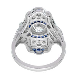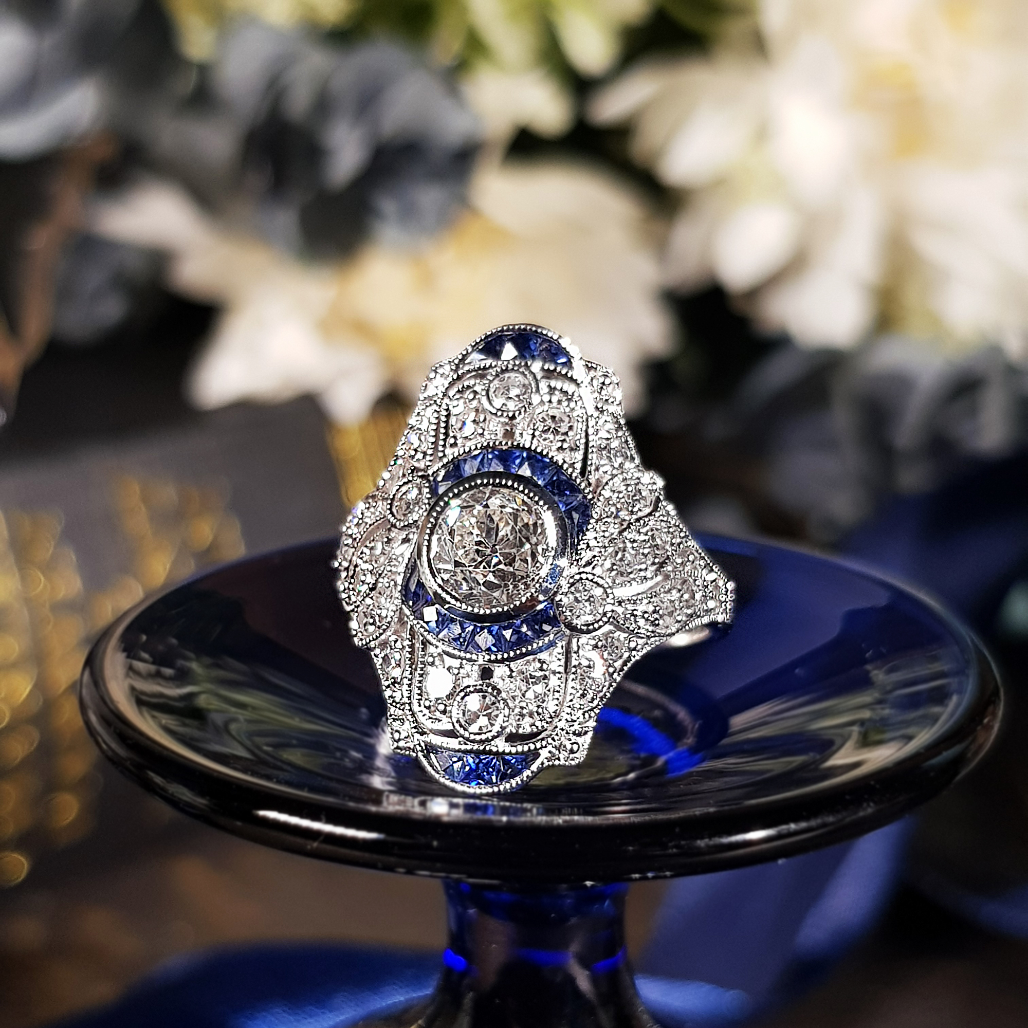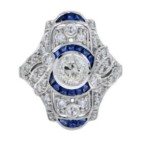 A strikingly stunning Art Deco design dinner ring sparkles the center with .99 old cut diamond accented the center with a round border composed of French cut blue sapphires. All are surrounded by single cut diamonds and more French cut sapphire on top and bottom. Decorative piercing and delicate milgraining add the finishing flourishes to this piece.