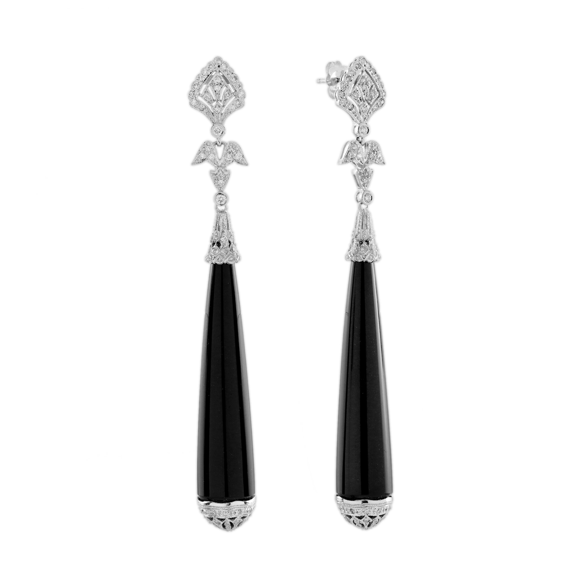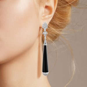 Adding a unique, elegant touch. Below, sleek onyx stones gracefully drop down, accented with diamonds at the bottom for added brilliance. The combination of the geometric Art Deco design, the bold contrast of onyx, and the sparkle of diamonds creates a timeless and sophisticated look perfect for any occasion.